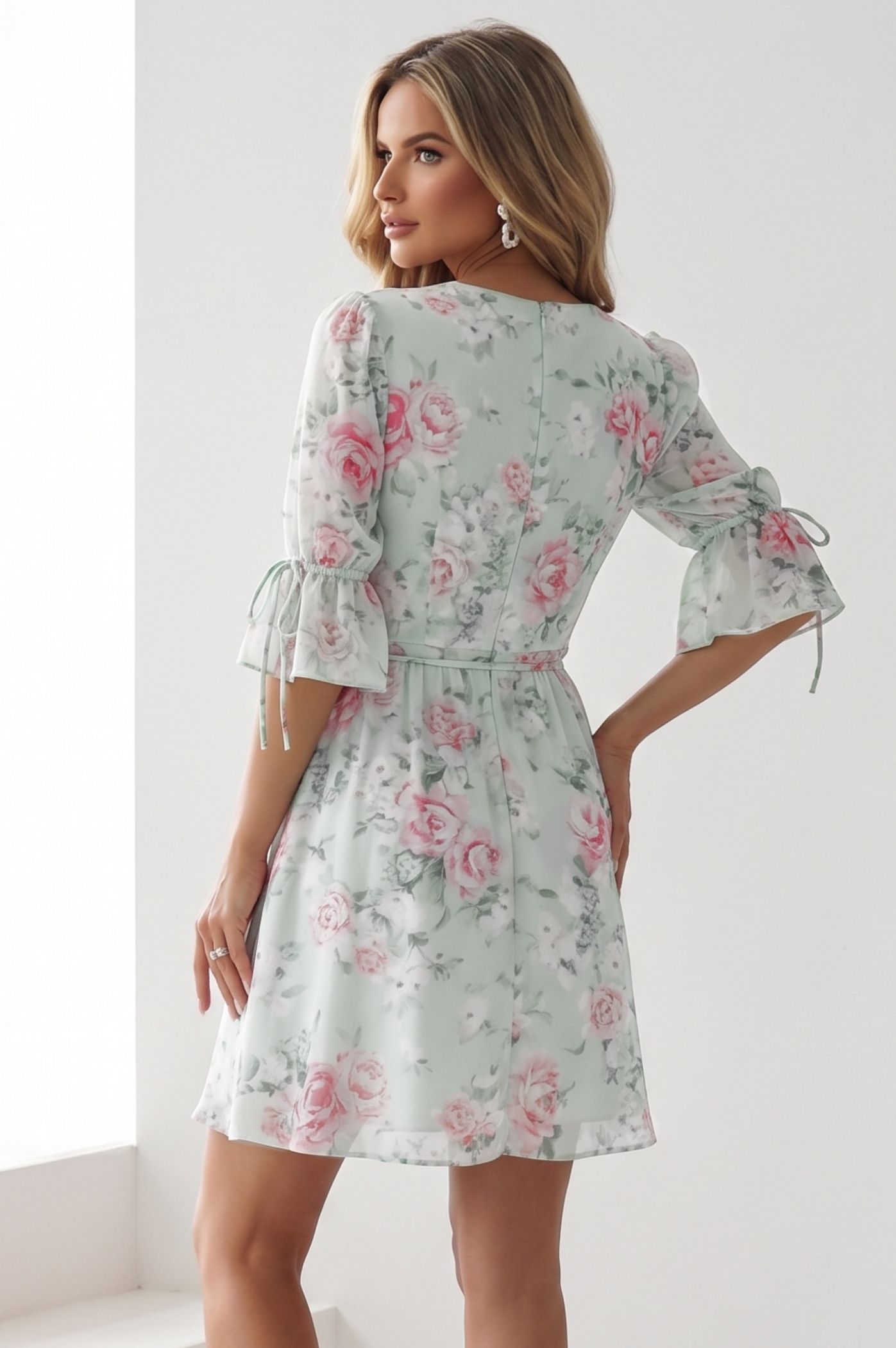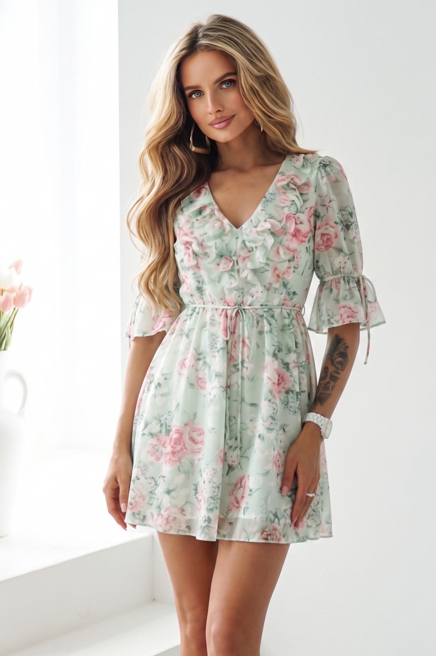 Αναδείξτε την γκαρνταρόμπα σας με αυτό το εκλεπτυσμένο mini floral φόρεμα, που συνδυάζει την ανοιξιάτικη φρεσκάδα με τη θηλυκή κομψότητα. Ένα κομμάτι ιδανικό για κάθε ειδική περίσταση, που θα σας χαρίσει μια αέρινη και στυλάτη εμφάνιση. Το εντυπωσιακό μοτίβο με τριαντάφυλλα σε παστέλ ροζ και λιλά αποχρώσεις πάνω σε λευκή βάση, προσδίδει μια ρομαντική και φρέσκια όψη, ιδανική για γάμους, βαπτίσεις ή garden parties. Το βαθύ V ντεκολτέ πλαισιώνεται από πλούσια βολάν που προσθέτουν όγκο και χάρη, αναδεικνύοντας το πάνω μέρος του σώματος με τον πιο θηλυκό τρόπο. Τα 3/4 μανίκια διαθέτουν κομψές λεπτομέρειες με δέσιμο (tie-detail) στους καρπούς, προσφέροντας μια μοντέρνα και παιχνιδιάρικη διάθεση στο συνολικό design. Διαθέτει λεπτή ζώνη που δένει στη μέση, επιτρέποντάς σας να προσαρμόσετε την εφαρμογή και να τονίσετε τη σιλουέτα σας με απόλυτη άνεση.
