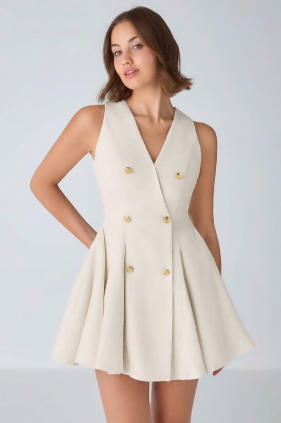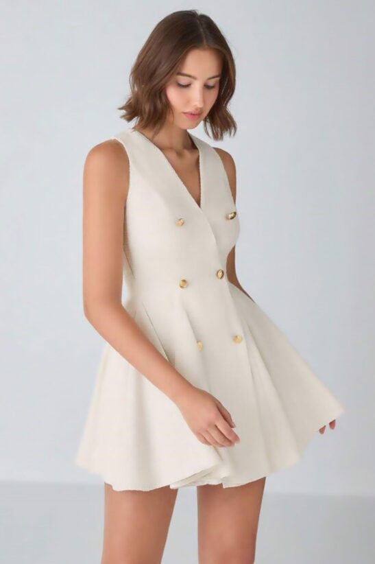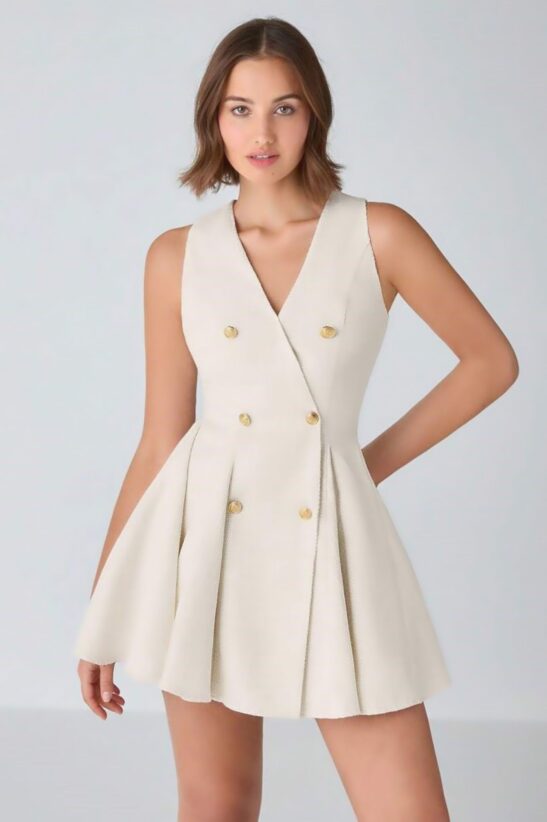 Φόρεμα mini αμάνικο , κρουαζε, σε κλος γραμμή. Κλείνει με σταυρωτά κουμπιά στο μπροστινό μέρος.