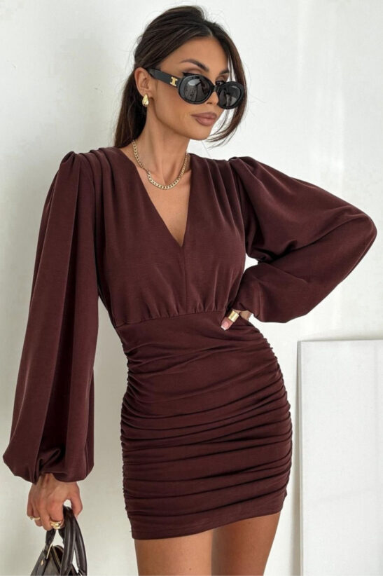 Αναδείξτε το στυλ σας με αυτό το mini φόρεμα είναι το απόλυτο cocktail dress. Διαθέτει εντυπωσιακά balloon μανίκια και βαθιά V λαιμόκοψη στο πάνω μέρος. Η φούστα αγκαλιάζει το σώμα χάρη στις πλούσιες σούρες που δημιουργούν ένα κολακευτικό draping effect. Ιδανικό για βραδινές εξόδους και events.