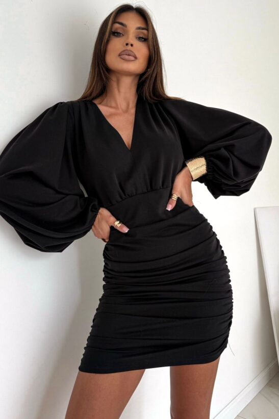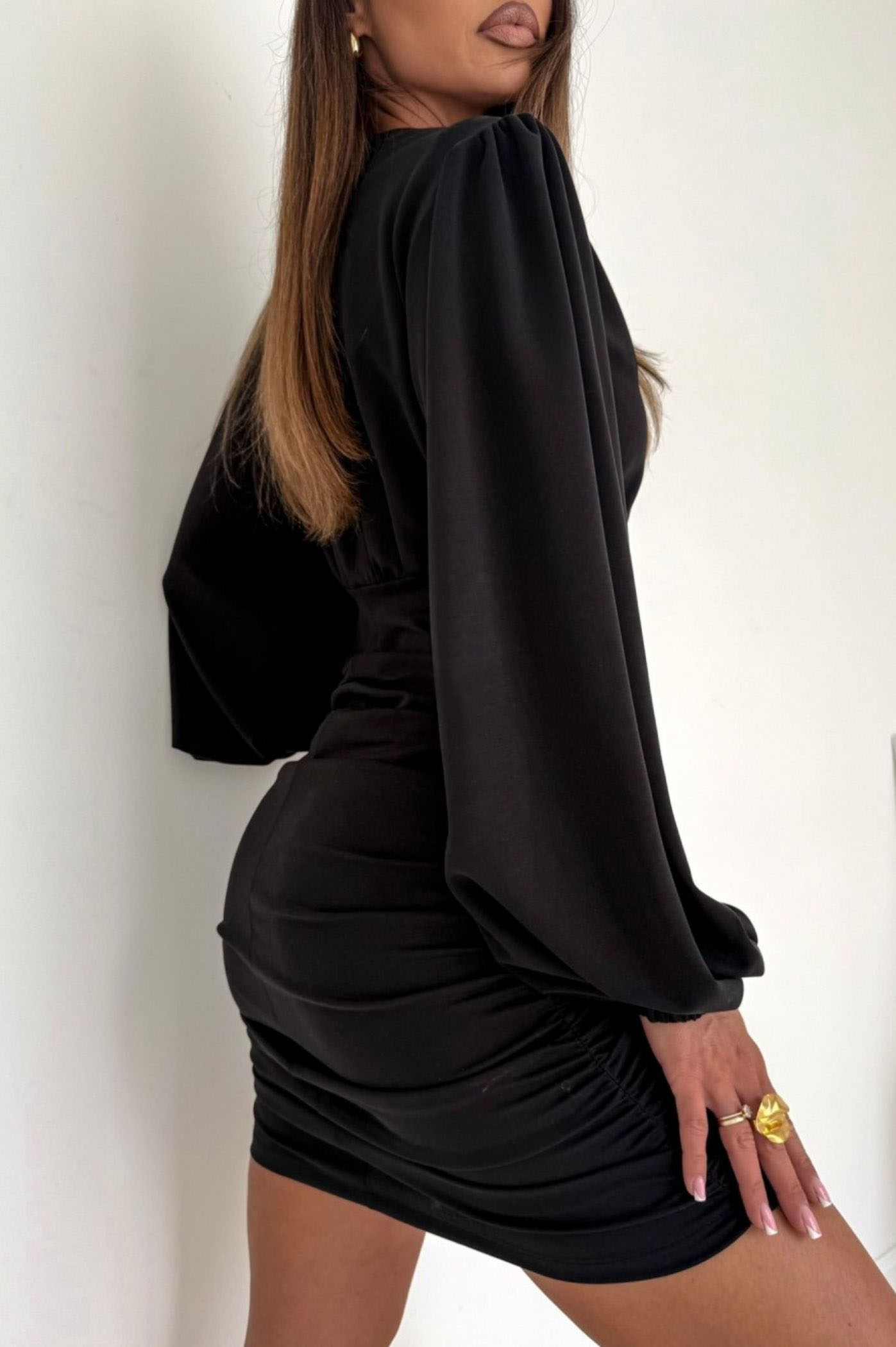 Αναδείξτε το στυλ σας με αυτό το mini φόρεμα είναι το απόλυτο cocktail dress. Διαθέτει εντυπωσιακά balloon μανίκια και βαθιά V λαιμόκοψη στο πάνω μέρος. Η φούστα αγκαλιάζει το σώμα χάρη στις πλούσιες σούρες που δημιουργούν ένα κολακευτικό draping effect. Ιδανικό για βραδινές εξόδους και events.