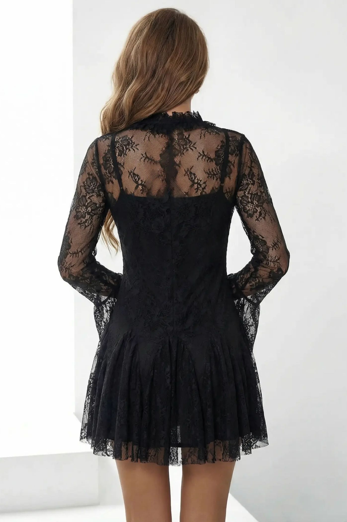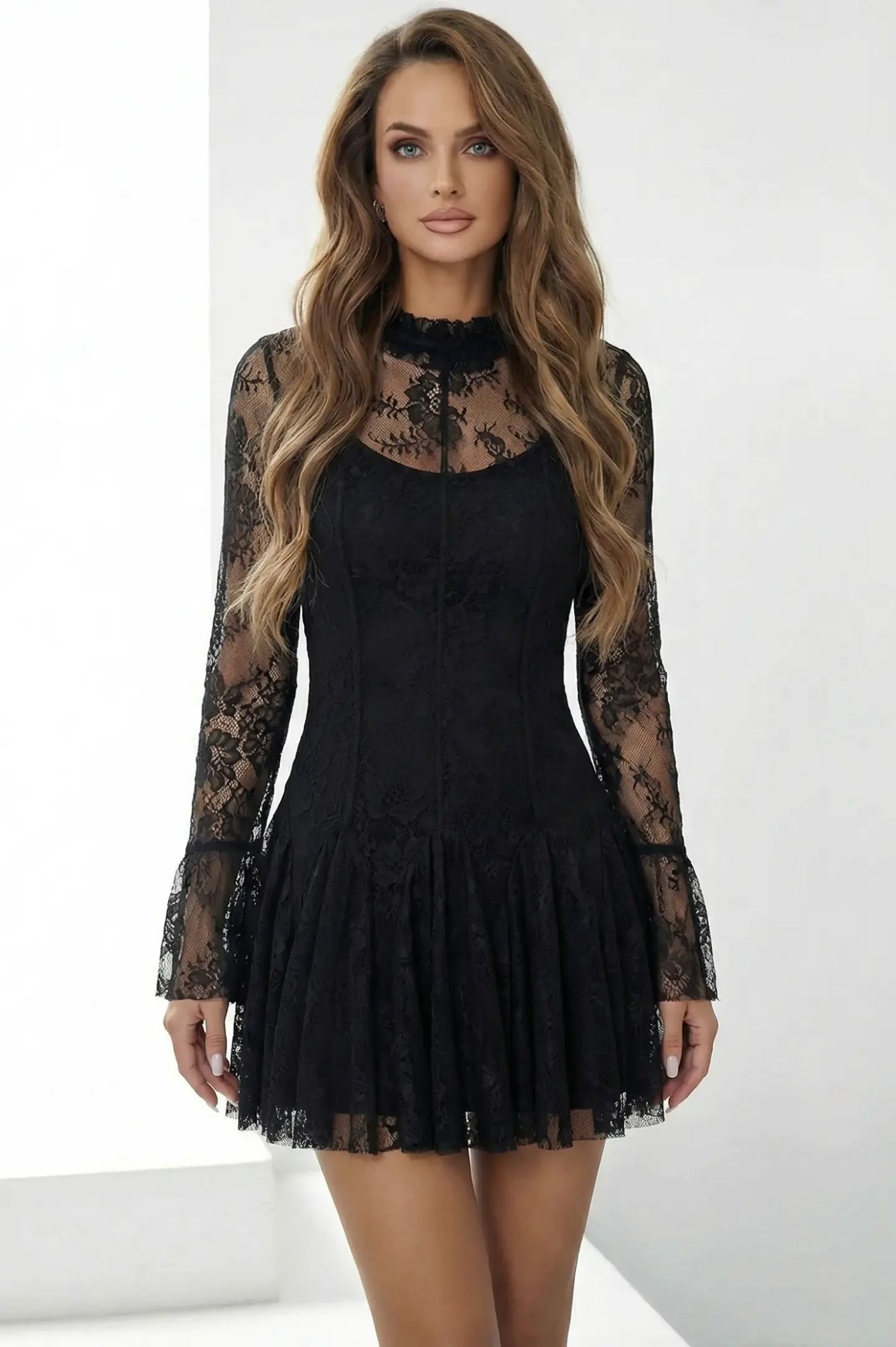 Προσθέστε μια δόση μυστηρίου και απόλυτης κομψότητας στις βραδινές σας εμφανίσεις με αυτό το μίνι φόρεμα από δαντέλα. Ένα διαχρονικό κομμάτι με gothic-chic αναφορές που αναδεικνύει τη θηλυκότητα μέσα από τις λεπτομέρειες και την άψογη εφαρμογή του. Περίτεχνη δαντέλα που καλύπτει όλο το φόρεμα, προσφέροντας μια πολυτελή υφή και κλασικό στυλ. Μακριά μανίκια που ανοίγουν στο κάτω μέρος, προσδίδοντας κίνηση και έναν αέρα 70s glam. Ο κομψός γιακάς από δαντέλα χαρίζει σοφιστικέ αισθητική και τονίζει το πρόσωπο. Τα μανίκια και το πάνω μέρος του ντεκολτέ διαθέτουν διαφάνεια, δημιουργώντας ένα εντυπωσιακό contrast με το εσωτερικό corset-style μπούστο. Το κάτω μέρος ανοίγει ελαφρά σε άλφα γραμμή με πιέτες, εξασφαλίζοντας άνεση και στυλ.
