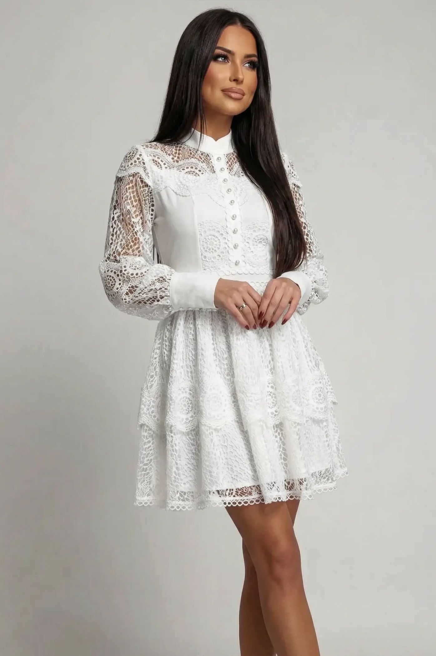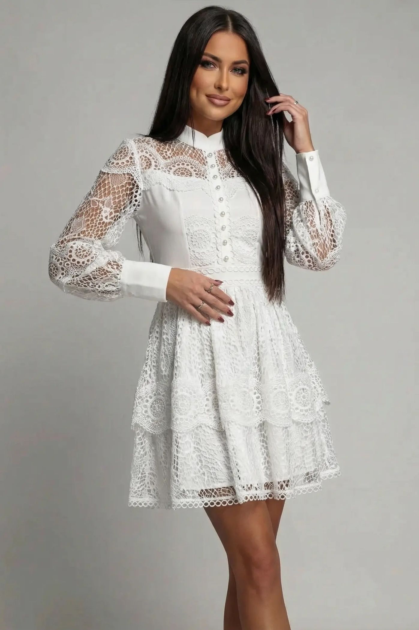 Αναδείξτε την απόλυτη θηλυκότητα με αυτό το εντυπωσιακό mini φόρεμα, μια ιδανική επιλογή για βαπτίσεις, επίσημα καλέσματα ή μια κομψή βραδινή έξοδο. Ο συνδυασμός της δαντέλας με τις κλασικές λεπτομέρειες δημιουργεί ένα διαχρονικό look που αποπνέει φινέτσα. Διαθέτει δαντέλα guipure στο στήθος, στα μανίκια και στη φούστα, προσφέροντας μια αίσθηση πολυτέλειας και ρομαντισμού. Η μπροστινή πλευρά κοσμείται από κομψά κουμπιά που προσθέτουν μια αριστοκρατική πινελιά στο σχέδιο. Τα μακριά μανίκια από δαντέλα καταλήγουν σε σταθερές λευκές μανσέτες με πέρλες, δημιουργώντας ένα εντυπωσιακό contrast. Η φούστα με βολάν σε επίπεδα, δίνει όγκο και κίνηση στο περπάτημά σας. Ο κομψός, μικρός γιακάς προσδίδει έναν αέρα σοφιστικέ στυλ.