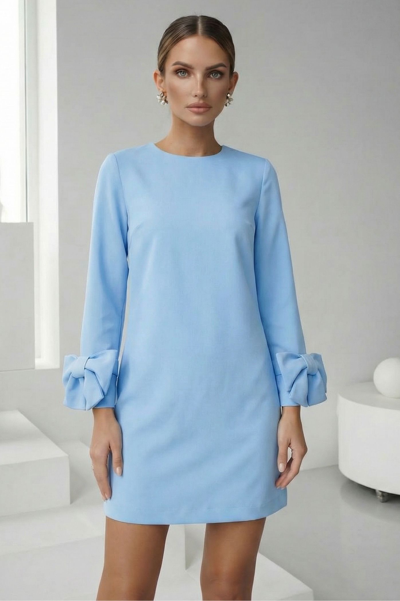 Αναδείξτε την πιο chic πλευρά σας με αυτό το μίνι φόρεμα, που συνδυάζει τη minimal αισθητική με statement λεπτομέρειες. Είναι η ιδανική επιλογή για όσες αναζητούν ένα ρούχο που ισορροπεί ανάμεσα στον ρομαντισμό και τη σύγχρονη κομψότητα. Η πιο εντυπωσιακή λεπτομέρεια του φορέματος είναι οι μεγάλοι φιόγκοι στις μανσέτες, που προσθέτουν όγκο και μια couture αίσθηση στο σύνολο. Σε ίσια, άνετη γραμμή που κολακεύει κάθε σωματότυπο και προσφέρει ελευθερία κινήσεων. Διαθέτει chic στρογγυλή λαιμόκοψη, καθιστώντας το κατάλληλο τόσο για πρωινές όσο και για βραδινές περιστάσεις.