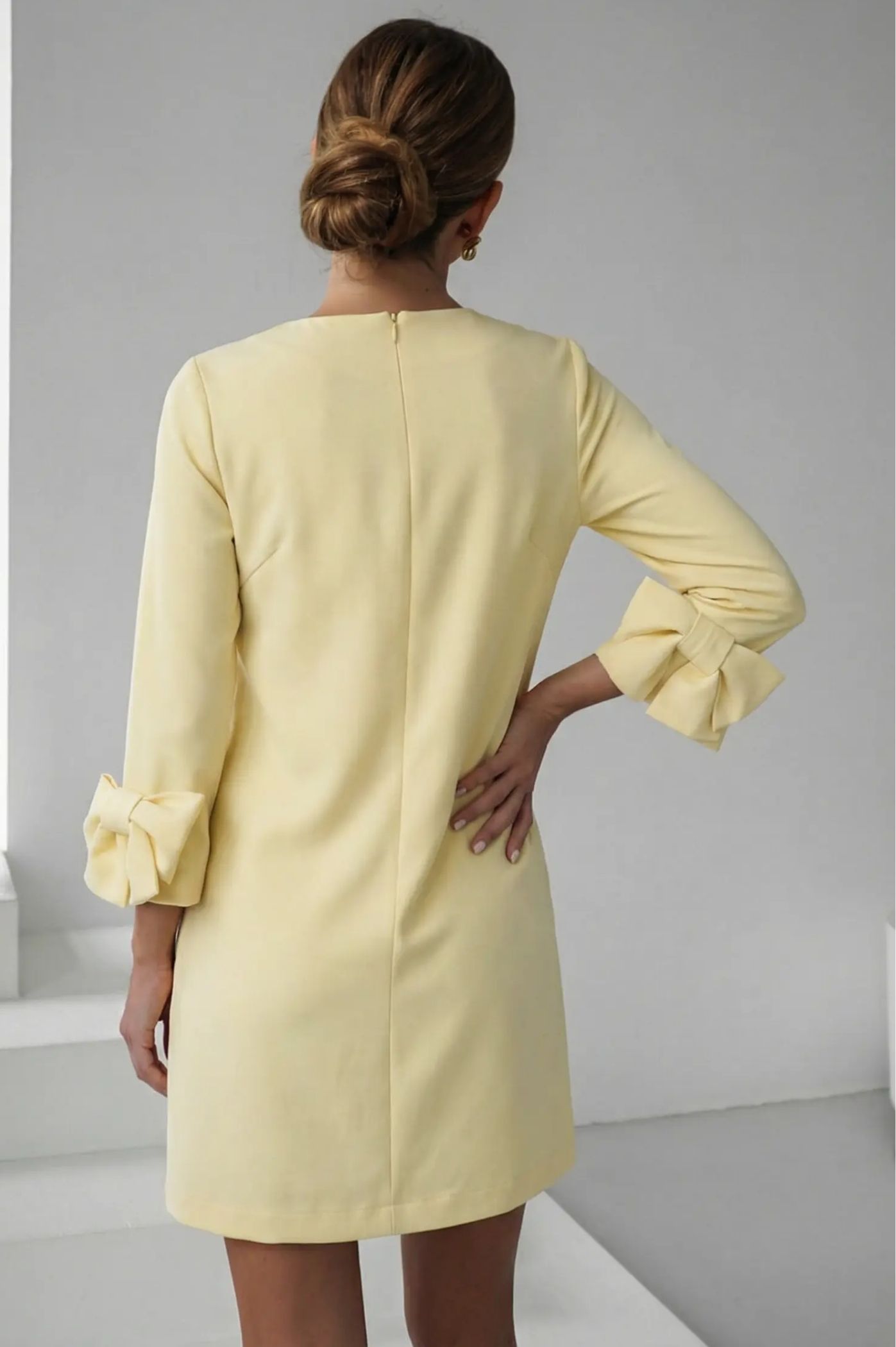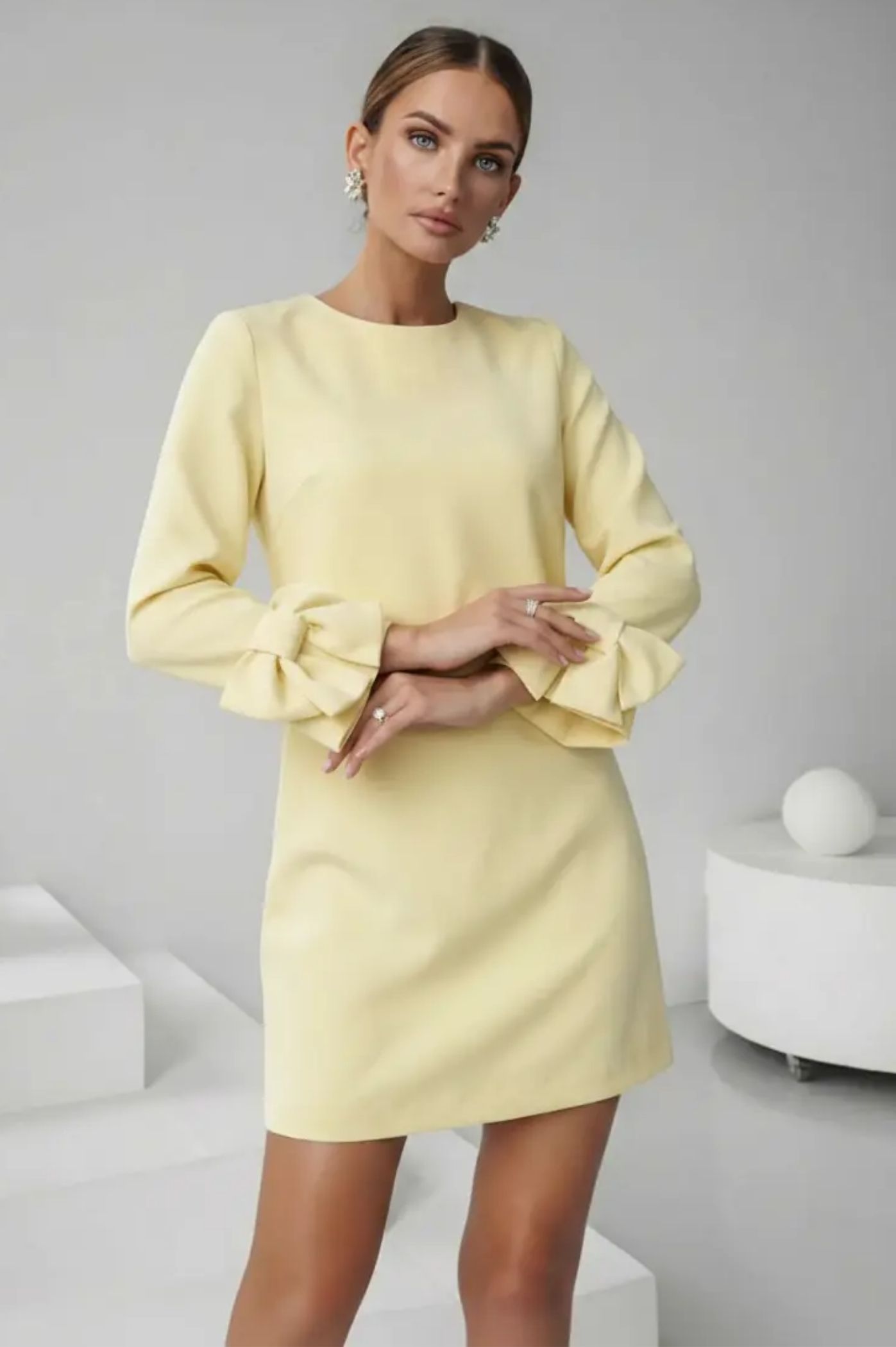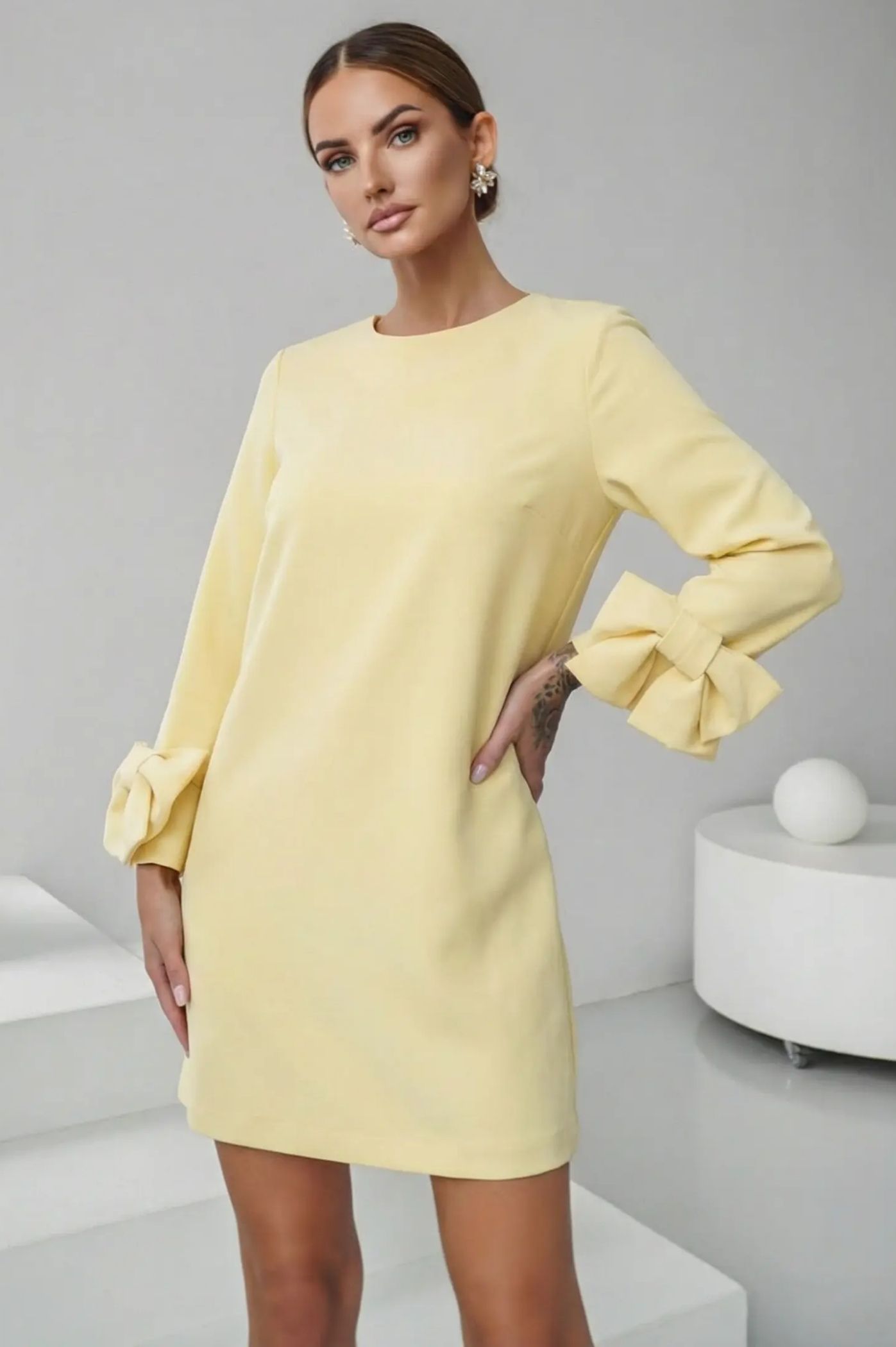 Αναδείξτε την πιο chic πλευρά σας με αυτό το μίνι φόρεμα, που συνδυάζει τη minimal αισθητική με statement λεπτομέρειες. Είναι η ιδανική επιλογή για όσες αναζητούν ένα ρούχο που ισορροπεί ανάμεσα στον ρομαντισμό και τη σύγχρονη κομψότητα. Η πιο εντυπωσιακή λεπτομέρεια του φορέματος είναι οι μεγάλοι φιόγκοι στις μανσέτες, που προσθέτουν όγκο και μια couture αίσθηση στο σύνολο. Σε ίσια, άνετη γραμμή που κολακεύει κάθε σωματότυπο και προσφέρει ελευθερία κινήσεων. Διαθέτει chic στρογγυλή λαιμόκοψη, καθιστώντας το κατάλληλο τόσο για πρωινές όσο και για βραδινές περιστάσεις.