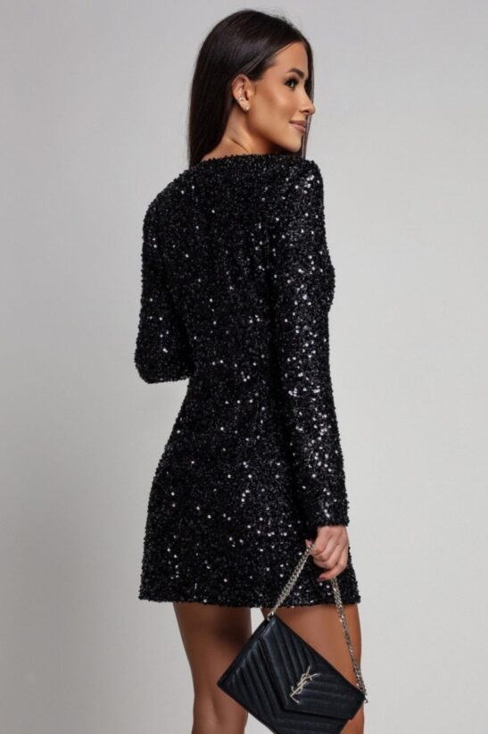 Αναδείξτε το απόλυτο glam look με το μαύρο μίνι φόρεμα! Ένα εκθαμβωτικό, εφαρμοστό φόρεμα, ολόκληρο καλυμμένο με μαύρες παγιέτες που λάμπουν σε κάθε σας κίνηση. Διαθέτει κολακευτική τετράγωνη λαιμόκοψη, μακριά μανίκια και είναι διακοσμημένο με μεγάλα, λαμπερά κουμπιά-στρας στο μπροστινό μέρος, προσδίδοντας μια chic, jacket-style αίσθηση. Ιδανικό για βραδινή έξοδο, party, ρεβεγιόν και επίσημες εμφανίσεις. Μπορεί να φορεθεί με τη μικρή μαύρη τσάντα σας και ψηλοτάκουνα για ένα ακαταμάχητο, λαμπερό σύνολο.
