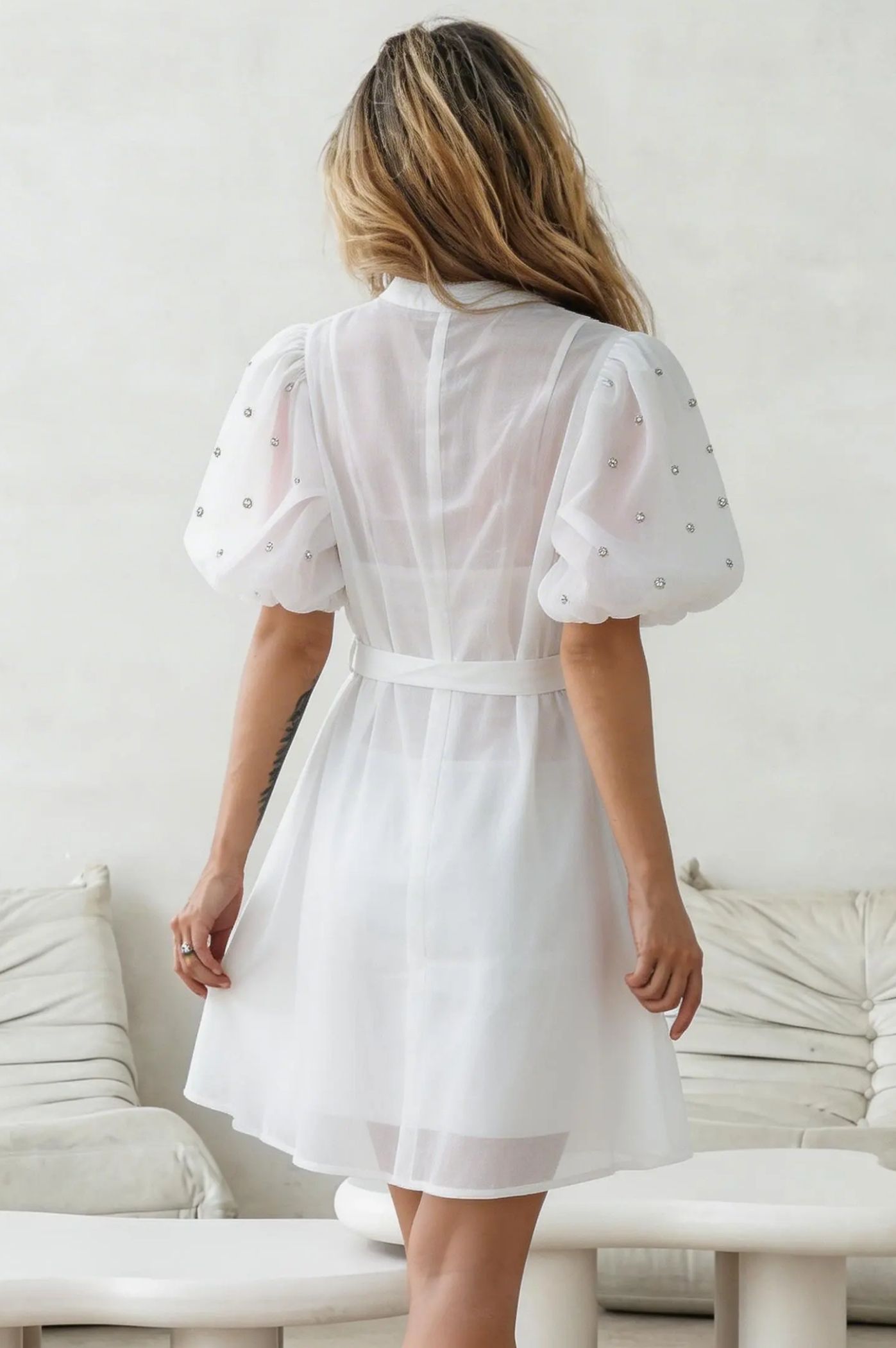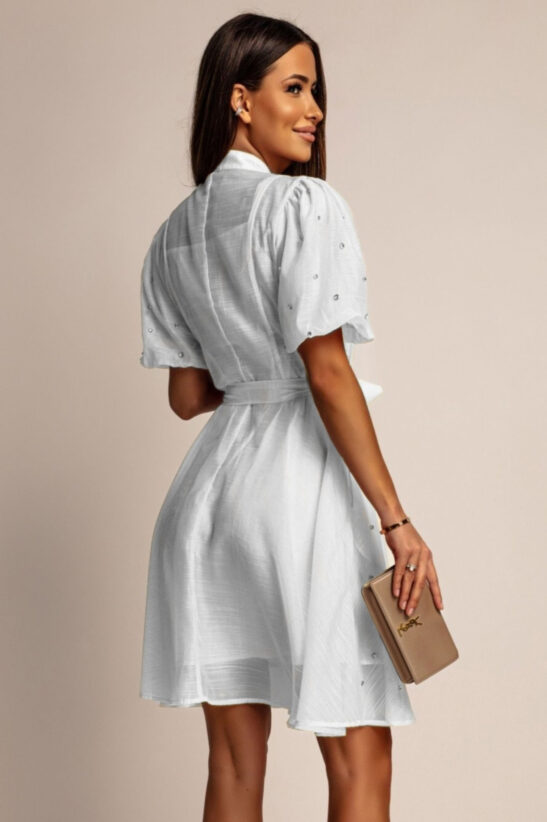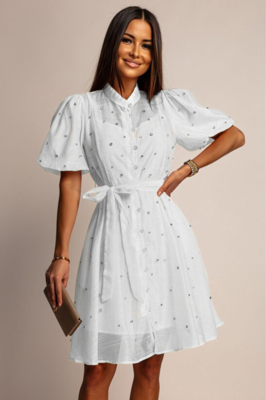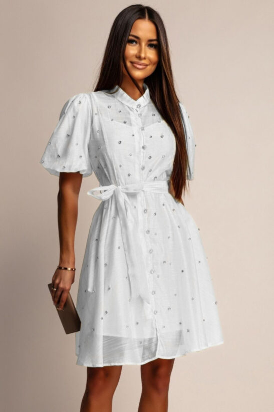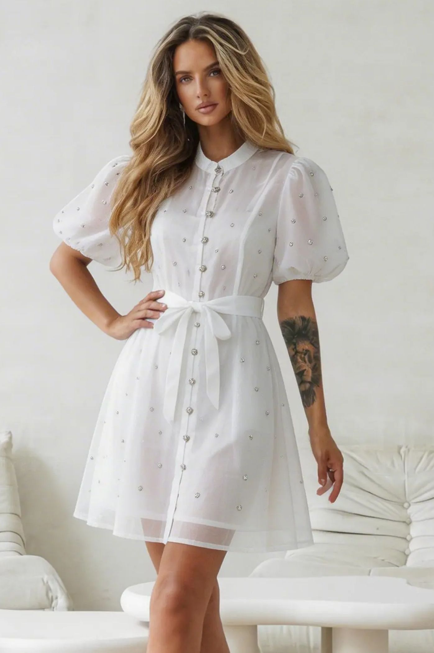 Αναδείξτε την κομψότητα και τη λάμψη με αυτό το mini φόρεμα  διακοσμημένο με αστραφτερά strass. Το shirtwaist σχέδιο του με κουμπιά από strass, σε συνδυασμό με τη ζώνη στη μέση, προσφέρει μια θηλυκή και κολακευτική σιλουέτα. Τα ελαφρώς μανίκια balloon και ο  γιακάς προσθέτουν μια νότα ρομαντισμού. Ιδανικό για καλοκαιρινές εκδηλώσεις, δεξιώσεις, κοκτέιλ πάρτι ή ακόμα και για μια ξεχωριστή βραδινή έξοδο.