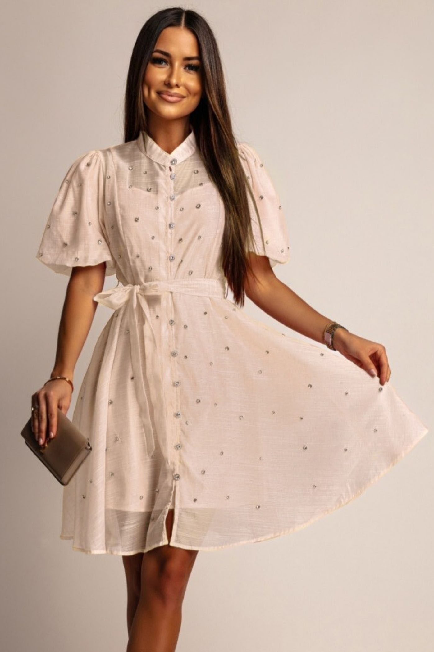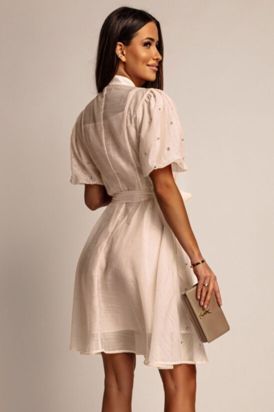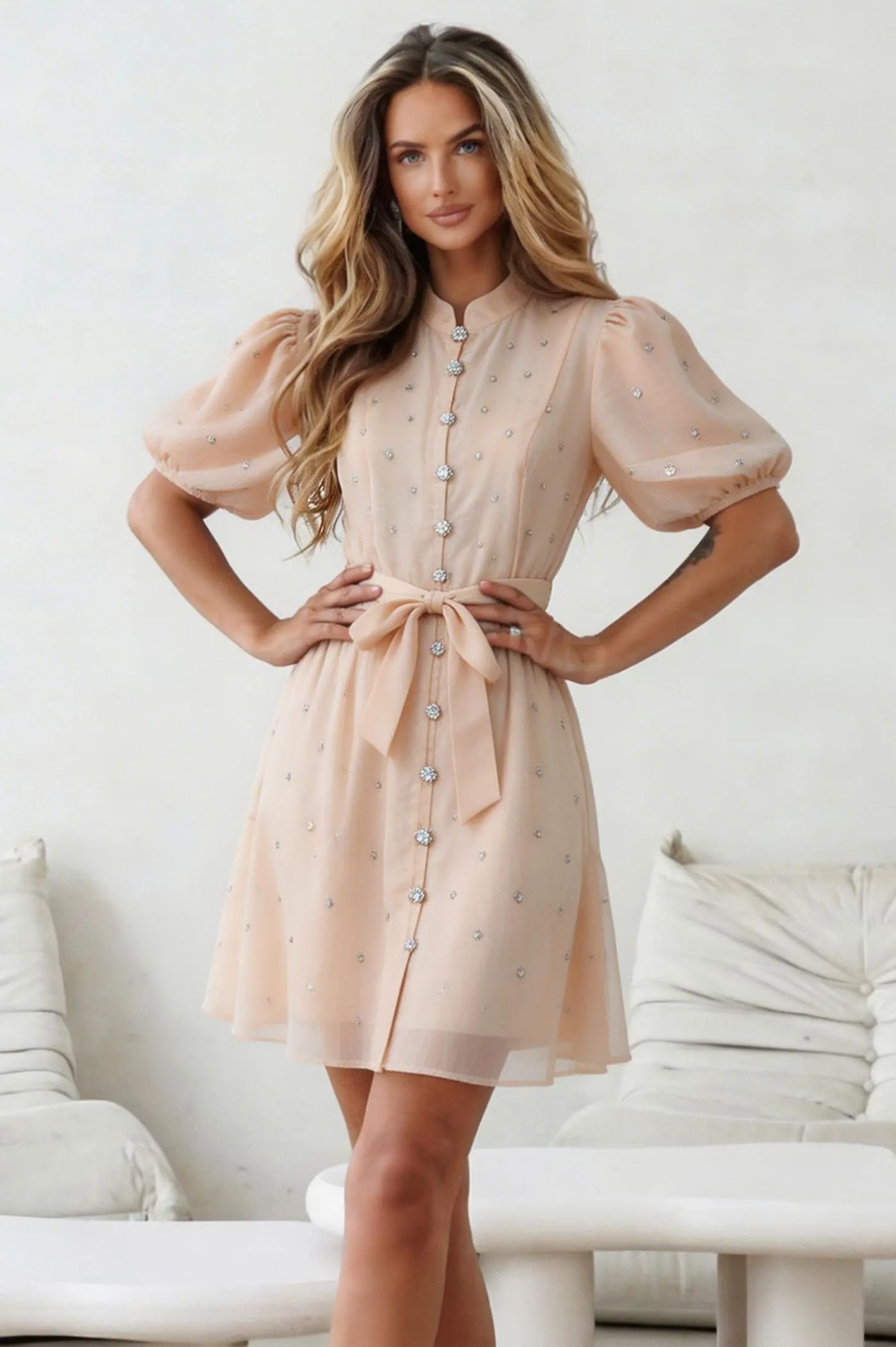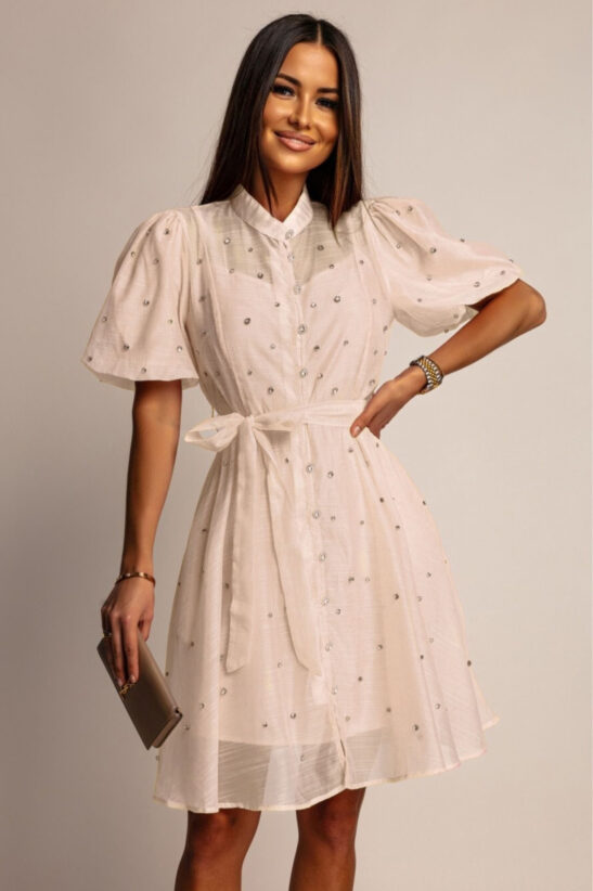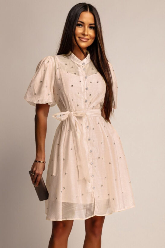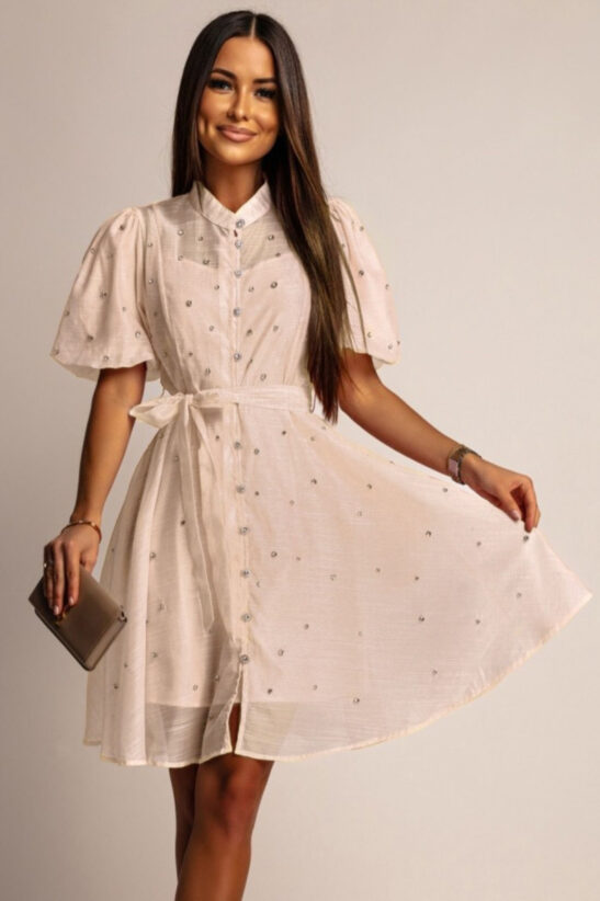 Αναδείξτε την κομψότητα και τη λάμψη με αυτό το mini φόρεμα  διακοσμημένο με αστραφτερά strass. Το shirtwaist σχέδιο του με κουμπιά από strass, σε συνδυασμό με τη ζώνη στη μέση, προσφέρει μια θηλυκή και κολακευτική σιλουέτα. Τα ελαφρώς μανίκια balloon και ο  γιακάς προσθέτουν μια νότα ρομαντισμού. Ιδανικό για καλοκαιρινές εκδηλώσεις, δεξιώσεις, κοκτέιλ πάρτι ή ακόμα και για μια ξεχωριστή βραδινή έξοδο.