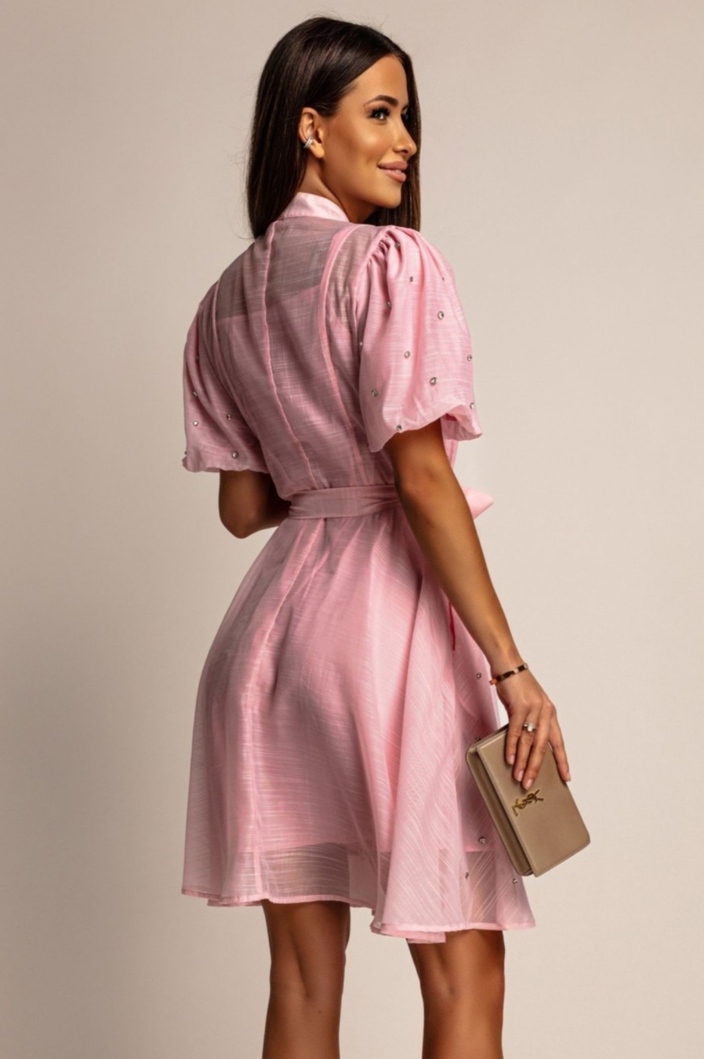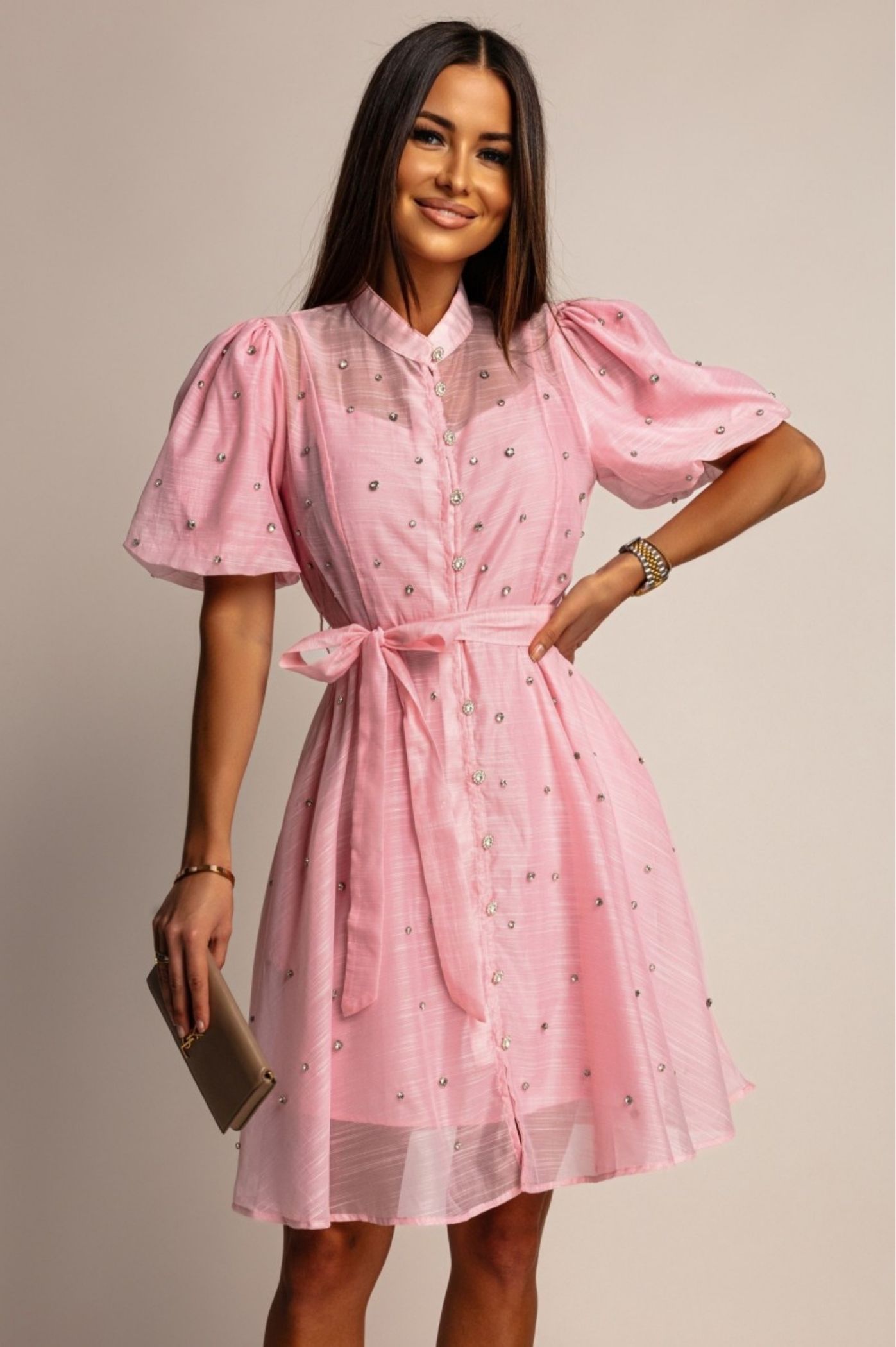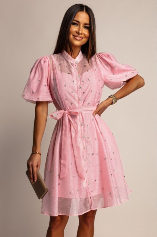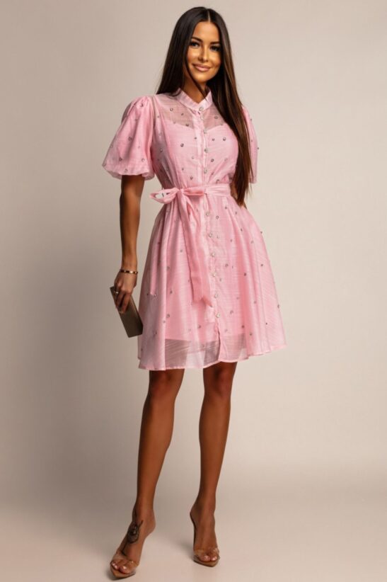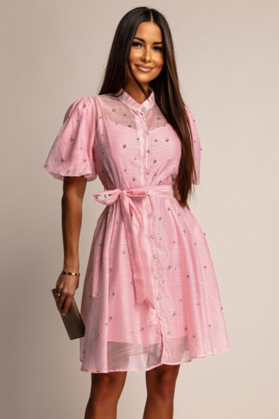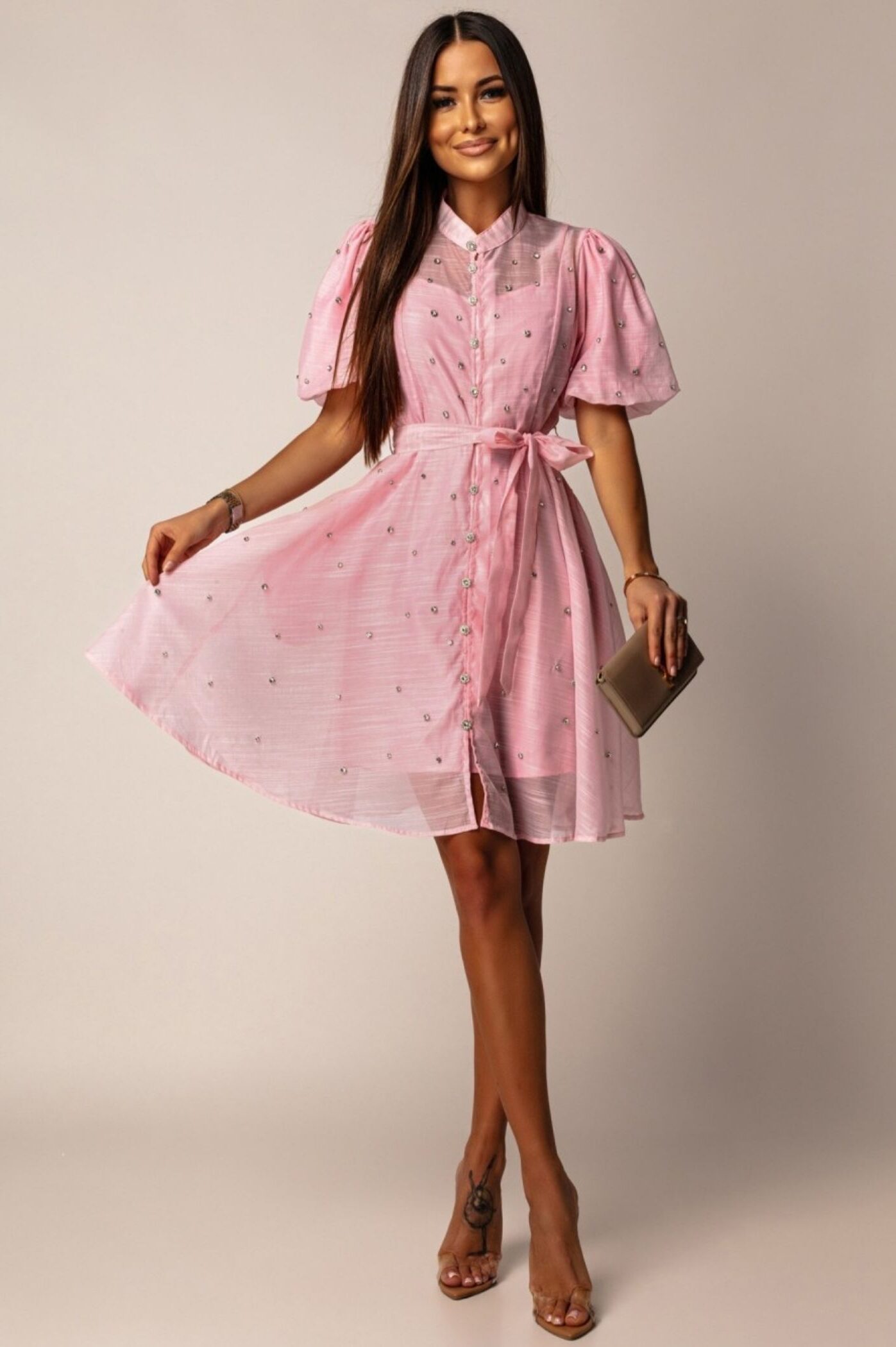 Αναδείξτε την κομψότητα και τη λάμψη με αυτό το mini φόρεμα  διακοσμημένο με αστραφτερά strass. Το shirtwaist σχέδιο του με κουμπιά από strass, σε συνδυασμό με τη ζώνη στη μέση, προσφέρει μια θηλυκή και κολακευτική σιλουέτα. Τα ελαφρώς μανίκια balloon και ο  γιακάς προσθέτουν μια νότα ρομαντισμού. Ιδανικό για καλοκαιρινές εκδηλώσεις, δεξιώσεις, κοκτέιλ πάρτι ή ακόμα και για μια ξεχωριστή βραδινή έξοδο.