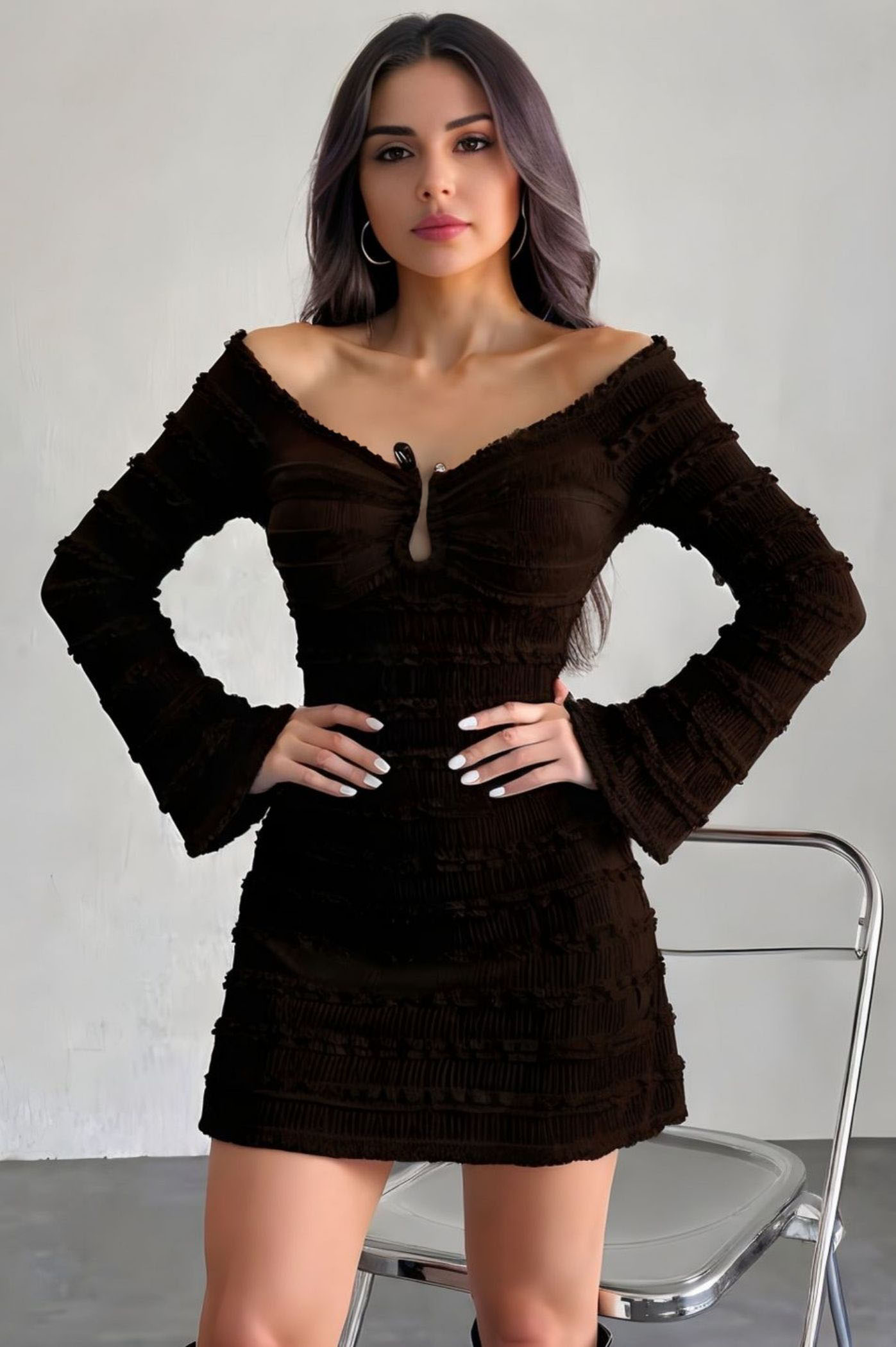 ΦΟΡΕΜΑ ΜΙΝΙ OFF SHOULDER ΜΕ ΚΑΜΠΑΝΑ ΜΑΝΙΚΙΑ – ΚΑΦΕ