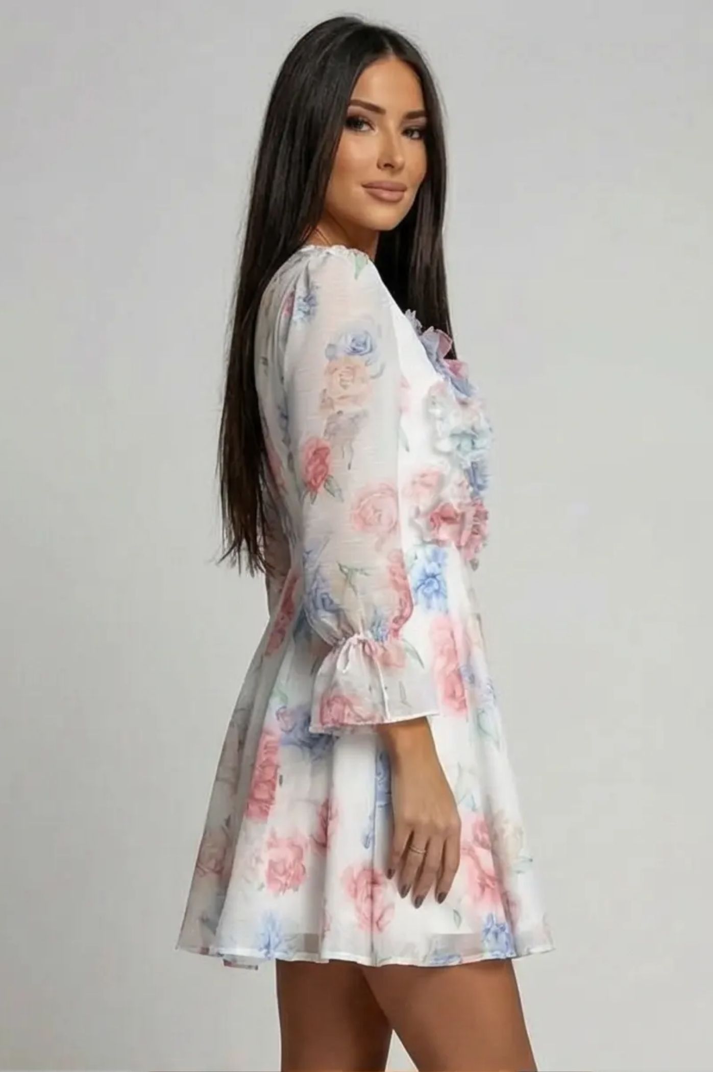 Αναδείξτε το στυλ σας με το πιο ρομαντικό floral mini φόρεμα. Με ένα πανέμορφο μοτίβο από μεγάλα τριαντάφυλλα σε παστέλ αποχρώσεις, αυτό το φόρεμα συνδυάζει την αέρινη κίνηση με τη θηλυκή εφαρμογή, αποτελώντας την ιδανική επιλογή για κάθε chic περίσταση. Διαθέτει βαθύ V ντεκολτέ που πλαισιώνεται από εντυπωσιακά τρισδιάστατα βολάν, χαρίζοντας όγκο και μια luxury αίσθηση στο πάνω μέρος του φορέματος. Τα ανάλαφρα μανίκια καταλήγουν σε κομψά βολάν και διαθέτουν διακριτικό κορδόνι που δένει σε φιόγκο, προσθέτοντας μια vintage πινελιά. Η φούστα ανοίγει ελαφρώς σε γραμμή άλφα, προσφέροντας άνεση και μια παιχνιδιάρικη κίνηση σε κάθε σας βήμα. Ποιοτικό, ημιδιάφανο ύφασμα με εσωτερική φόδρα για τέλεια κάλυψη και ανάλαφρη αίσθηση.