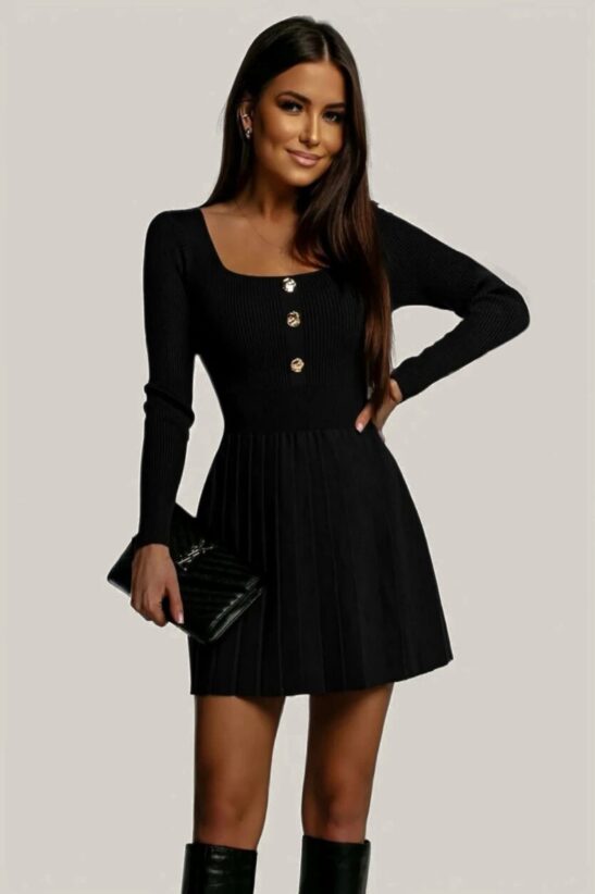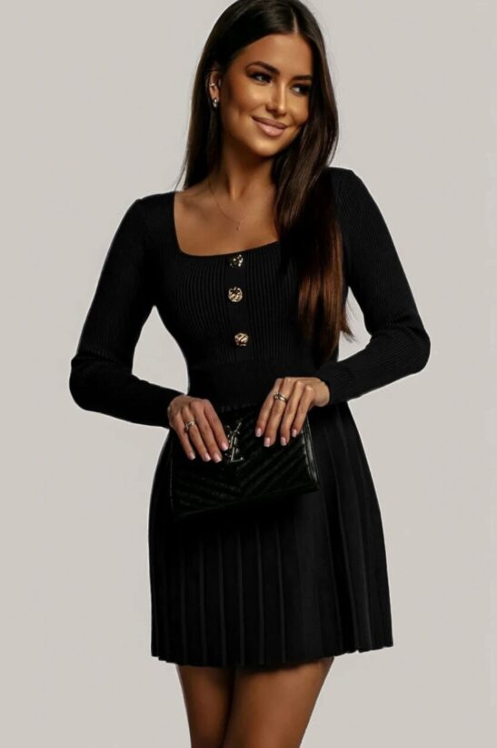 Αναδείξτε τη θηλυκή σας πλευρά με αυτό το στυλάτο πλεκτό mini φόρεμα. Ιδανικό για τις βραδινές σας εξόδους, προσφέρει μια κομψή και ταυτόχρονα παιχνιδιάρικη εμφάνιση. Το φόρεμα διαθέτει εφαρμοστό πλεκτό μπούστο με τετράγωνη λαιμόκοψη, που κολακεύει το ντεκολτέ, καθώς και εντυπωσιακά χρυσά κουμπιά στο μπούστο, προσθέτοντας μια νότα πολυτέλειας και κλασικής φινέτσας. Η πλισέ mini φούστα δίνει κίνηση και ρομαντικό αέρα. Μπορεί να φορεθεί με μαύρα μποτάκια ή ψηλοτάκουνες γόβες και ένα clutch bag για ένα statement party look.