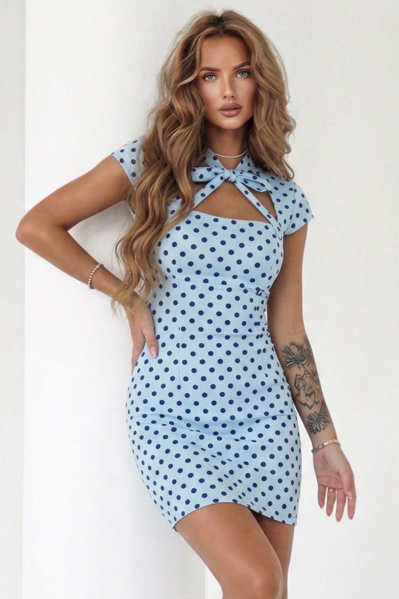 Δώστε έναν αέρα ανανέωσης στις εμφανίσεις σας με αυτό το υπέροχο πουά φόρεμα. Ένα κομμάτι που συνδυάζει το κλασικό polka dot pattern με ένα ιδιαίτερο, θηλυκό σχέδιο στο ντεκολτέ, ιδανικό για να ξεχωρίζετε από το πρωί στο γραφείο μέχρι το απογευματινό σας cocktail. Το διαχρονικό πουά προσφέρει ένα κομψό και ταυτόχρονα παιχνιδιάρικο στυλ. Διαθέτει εντυπωσιακό δέσιμο στο λαιμό που καταλήγει σε κομψό φιόγκο, προσθέτοντας μια αίσθηση πολυτέλειας. Η διακριτική "άνοιξη" (cut-out) πάνω από το στήθος αναδεικνύει το μπούστο με έναν σοφιστικέ τρόπο. Η ελαφρώς εφαρμοστή γραμμή του αναδεικνύει τη σιλουέτα, παραμένοντας άνετο και chic. Τα κοντά μανίκια προσφέρουν την απαραίτητη κάλυψη και κάνουν το φόρεμα κατάλληλο για κάθε ώρα της ημέρας.