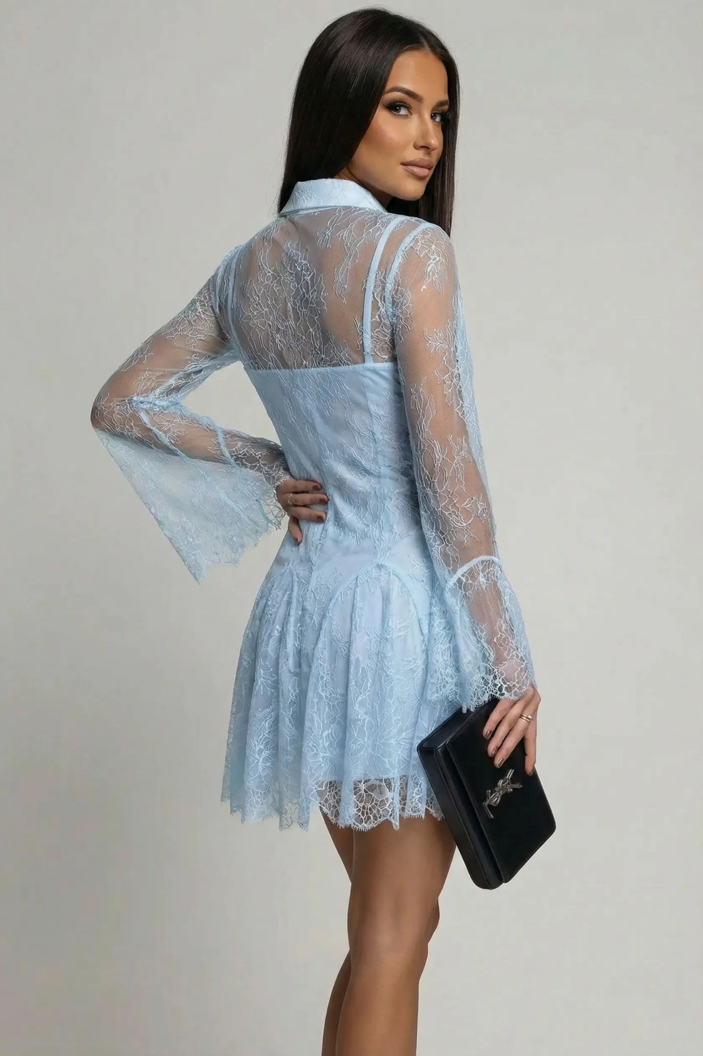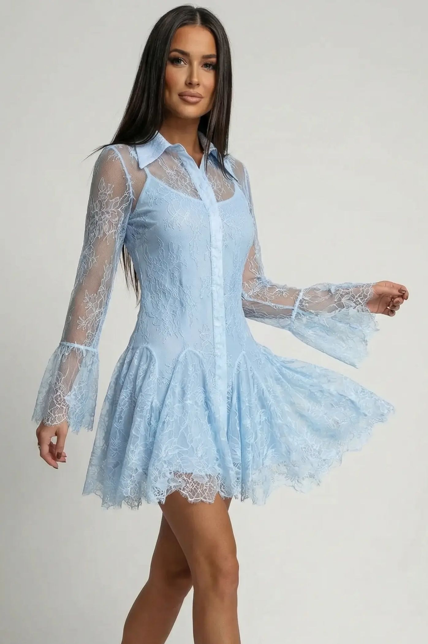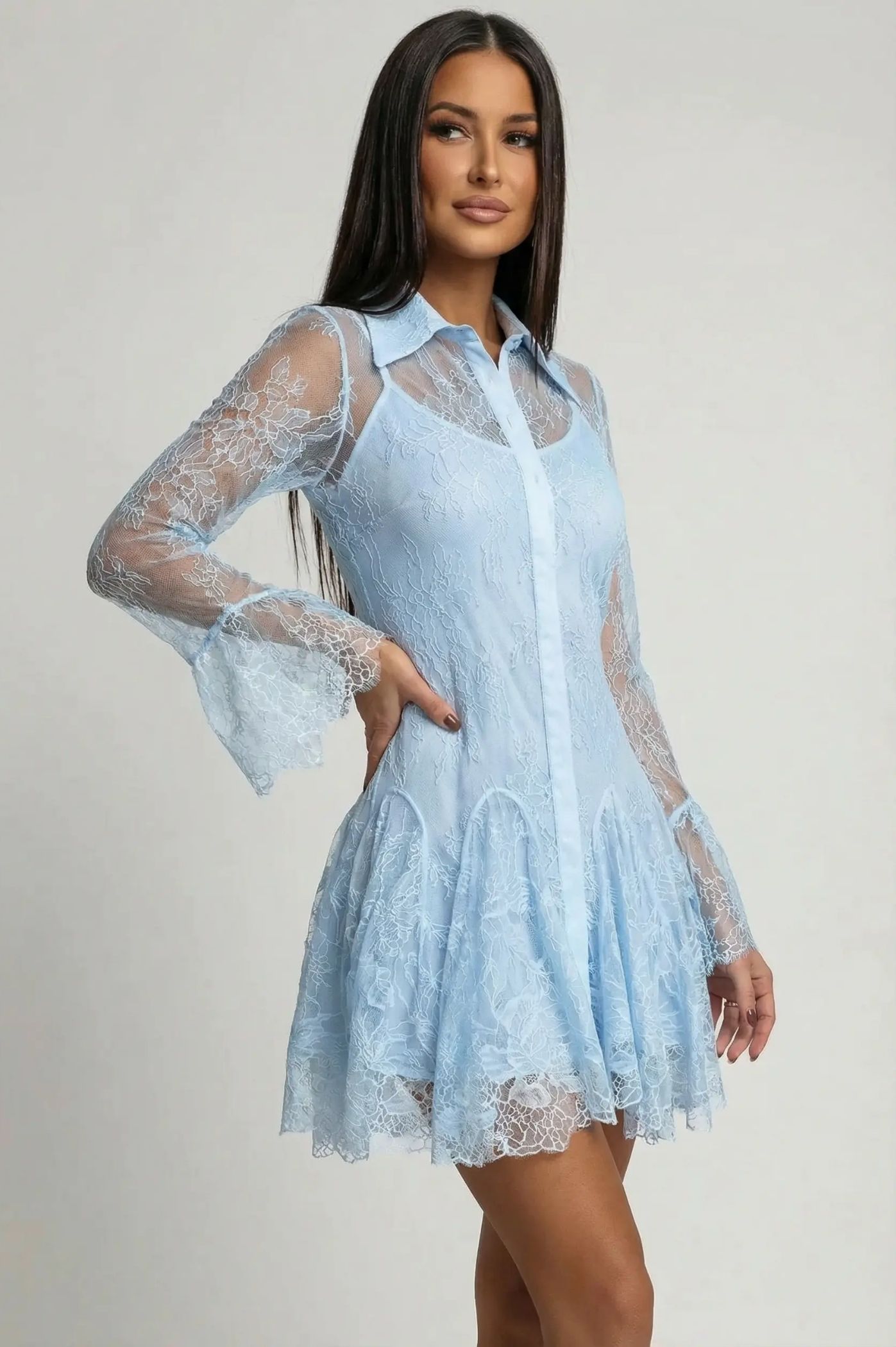 Αναδείξτε μια νότα ρομαντισμού και υψηλής αισθητικής στο στυλ σας με αυτό το αιθέριο μίνι φόρεμα-σεμιζιέ. Συνδυάζοντας την κλασική γραμμή του πουκαμίσου με την πολυτέλεια της δαντέλας, αυτό το φόρεμα είναι η απόλυτη επιλογή για party looks, cocktail events ή μια ξεχωριστή βραδινή έξοδο. Ολόκληρο το φόρεμα είναι επενδυμένο με περίτεχνη floral δαντέλα, προσφέροντας μια αίσθηση διακριτικής διαφάνειας στα μανίκια και το μπούστο. Διαθέτει κομψό γιακά και κρυφή πατιλέτα με κουμπιά μπροστά, συνδυάζοντας το formal στυλ με τη θηλυκή διάθεση. Τα μακριά μανίκια καταλήγουν σε εντυπωσιακά βολάν με δαντέλα, δίνοντας κίνηση και vintage αέρα στην εμφάνιση. Η φούστα ανοίγει σε ελαφριά γραμμή άλφα με πρόσθετα βολάν, αναδεικνύοντας τα πόδια και προσφέροντας παιχνιδιάρικη διάθεση.