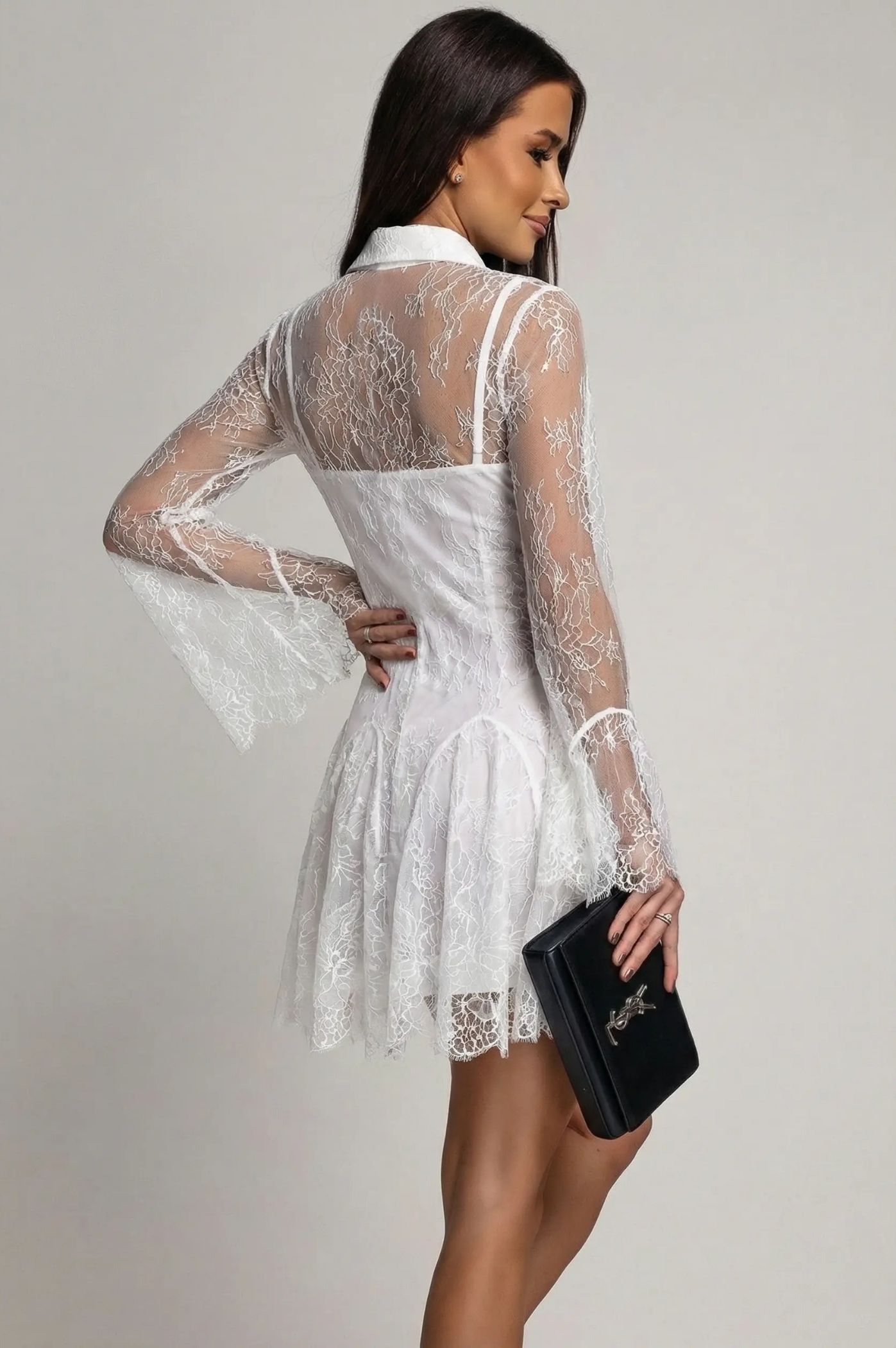Αναδείξτε μια νότα ρομαντισμού και υψηλής αισθητικής στο στυλ σας με αυτό το αιθέριο μίνι φόρεμα-σεμιζιέ. Συνδυάζοντας την κλασική γραμμή του πουκαμίσου με την πολυτέλεια της δαντέλας, αυτό το φόρεμα είναι η απόλυτη επιλογή για party looks, cocktail events ή μια ξεχωριστή βραδινή έξοδο. Ολόκληρο το φόρεμα είναι επενδυμένο με περίτεχνη floral δαντέλα, προσφέροντας μια αίσθηση διακριτικής διαφάνειας στα μανίκια και το μπούστο. Διαθέτει κομψό γιακά και κρυφή πατιλέτα με κουμπιά μπροστά, συνδυάζοντας το formal στυλ με τη θηλυκή διάθεση. Τα μακριά μανίκια καταλήγουν σε εντυπωσιακά βολάν με δαντέλα, δίνοντας κίνηση και vintage αέρα στην εμφάνιση. Η φούστα ανοίγει σε ελαφριά γραμμή άλφα με πρόσθετα βολάν, αναδεικνύοντας τα πόδια και προσφέροντας παιχνιδιάρικη διάθεση.