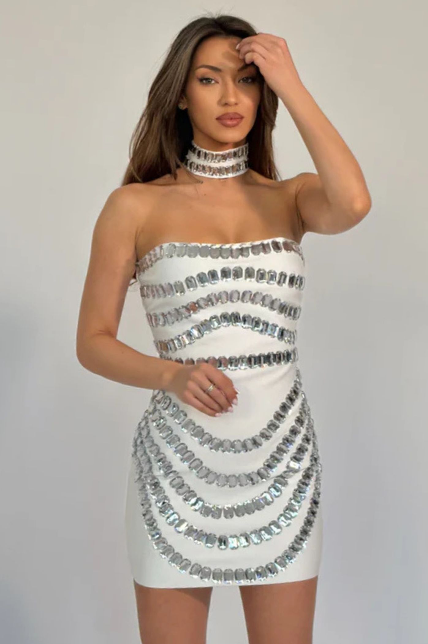 ΦΟΡΕΜΑ MINI STRAPLESS ΜΕ STRASS ΚΑΙ CHOKER – ΛΕΥΚΟ