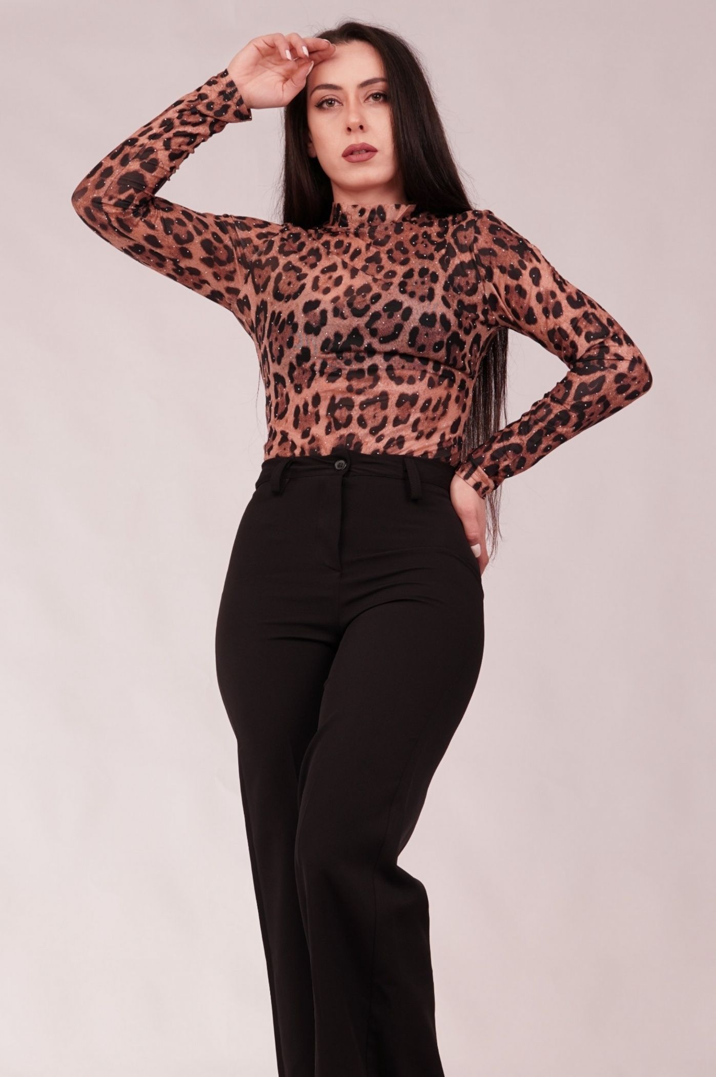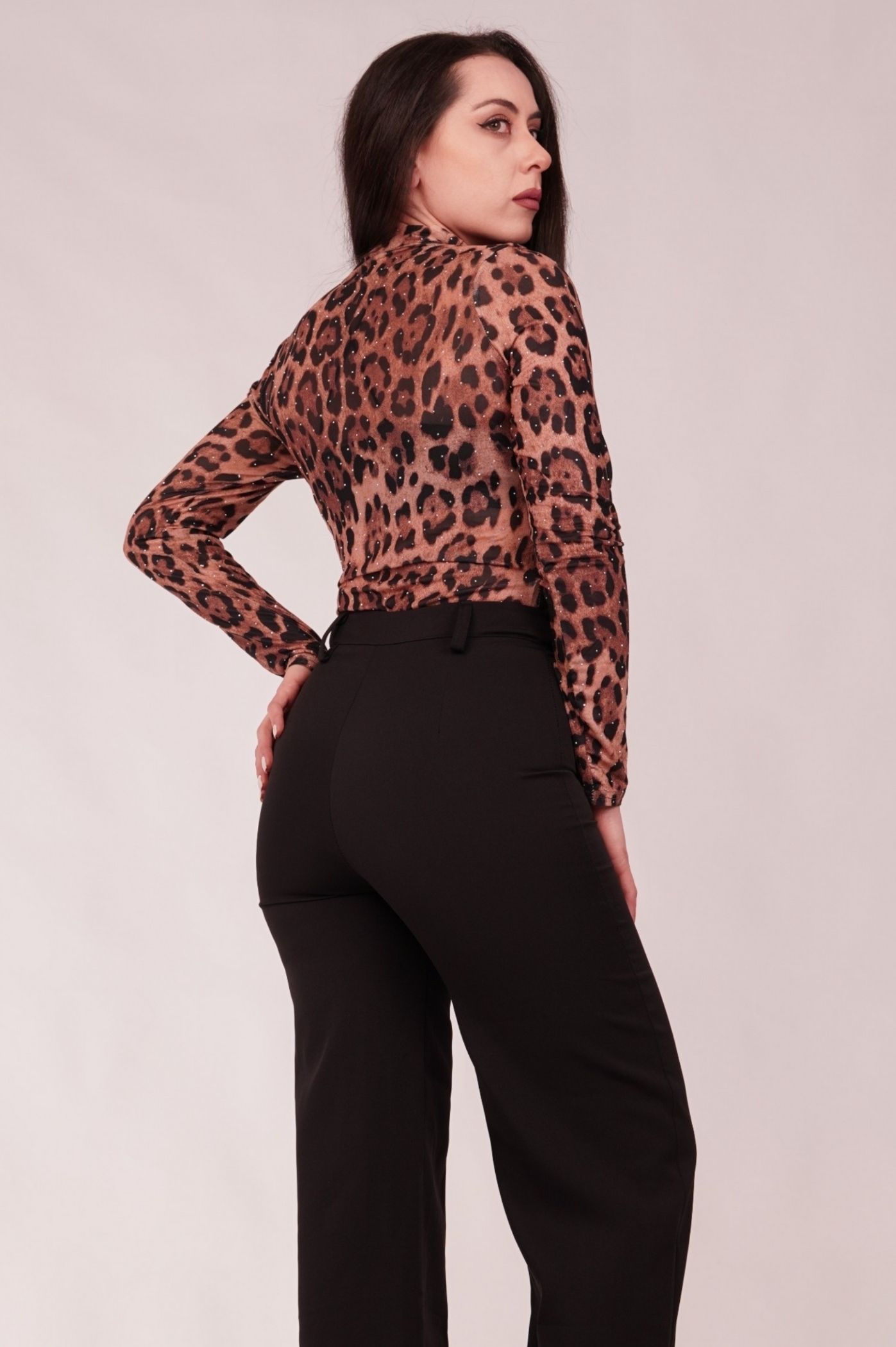 Δημιουργήστε τολμηρά και εντυπωσιακά σύνολα με αυτό το σέξι κορμάκι σε δυναμικό animal print leopard μοτίβο. Η ελαφριά διαφάνεια του υφάσματος σε συνδυασμό με τα διακριτικά στρας προσδίδουν μια λαμπερή, βραδινή διάθεση, καθιστώντας το ιδανικό για να φορεθεί με ψηλόμεσα παντελόνια ή φούστες. Το ελαφρύ ύφασμα δημιουργεί μια αισθησιακή διαφάνεια, ιδιαίτερα στα μανίκια και το μπούστο, προσθέτοντας βάθος στο look. Το μακρυμάνικο σχέδιο και ο διακριτικός ψηλός λαιμός ισορροπούν τη διαφάνεια, διατηρώντας το κομψό. Η εφαρμοστή γραμμή του κορμακιού εξασφαλίζει ότι το top παραμένει τέλεια στη θέση του, ιδανικό για layering ή για να τονίσει τη μέση.
