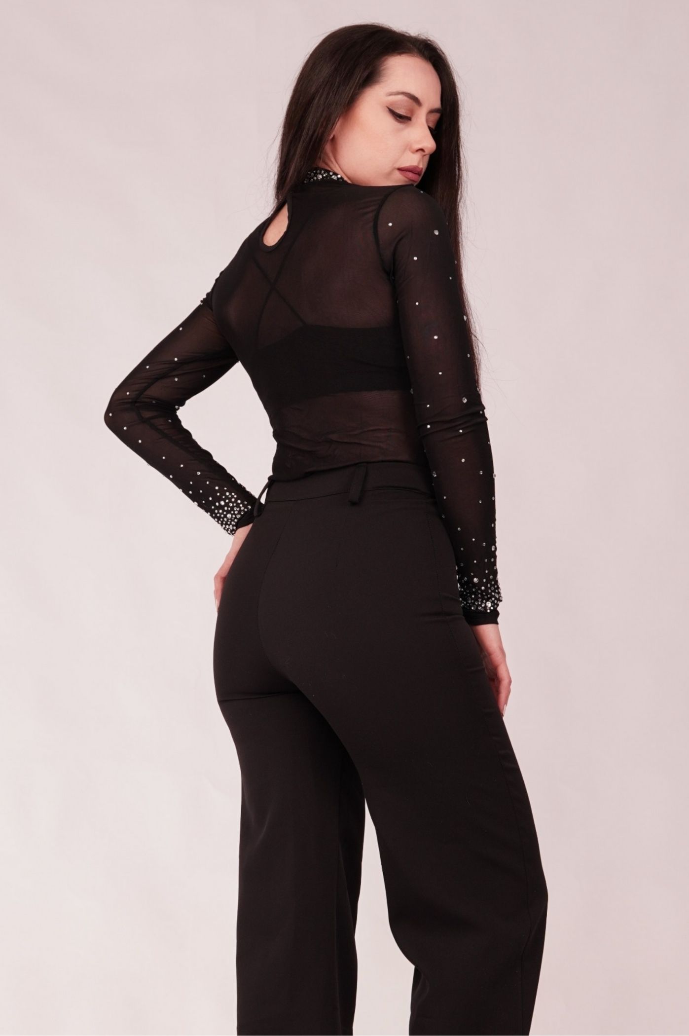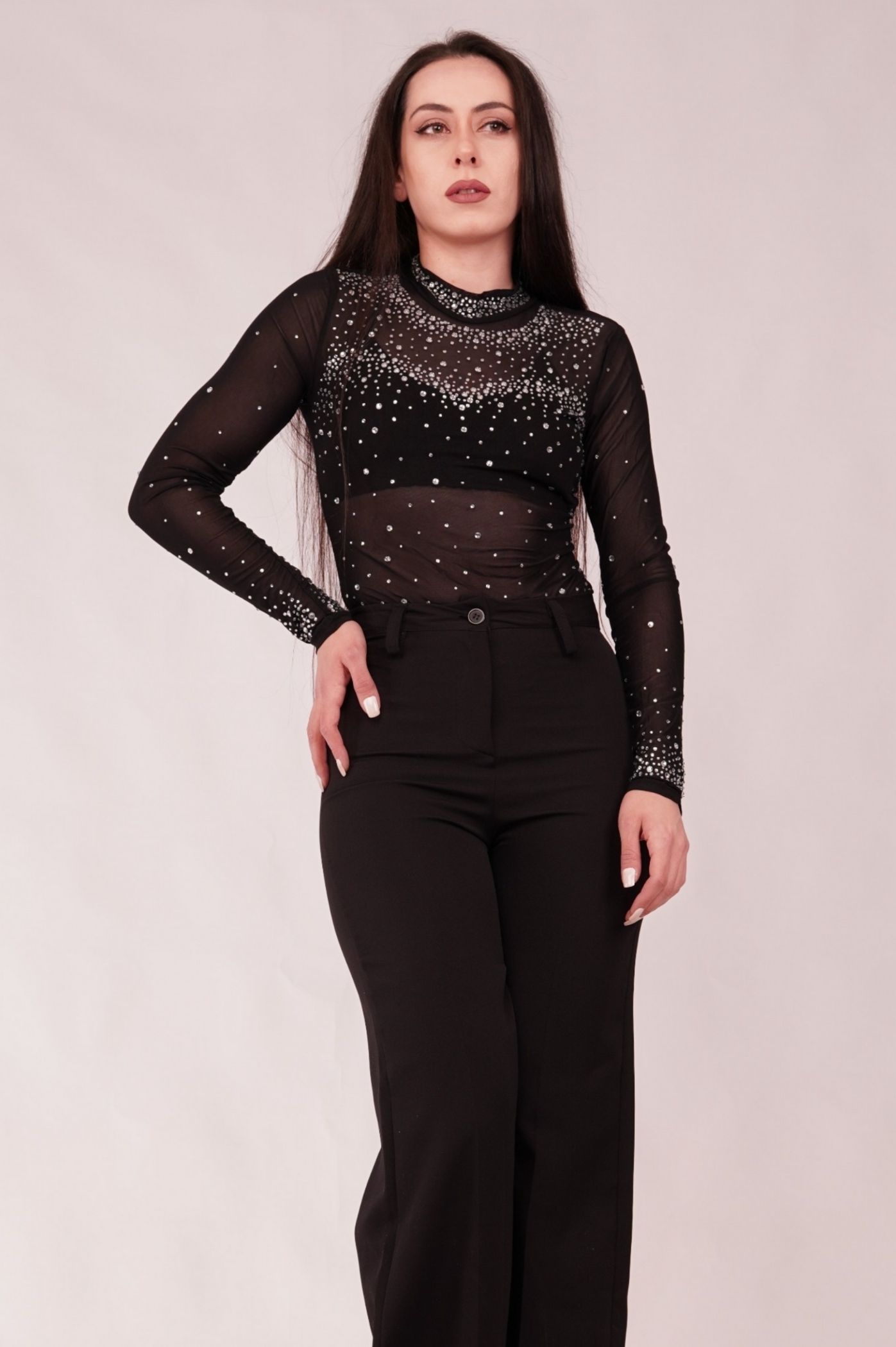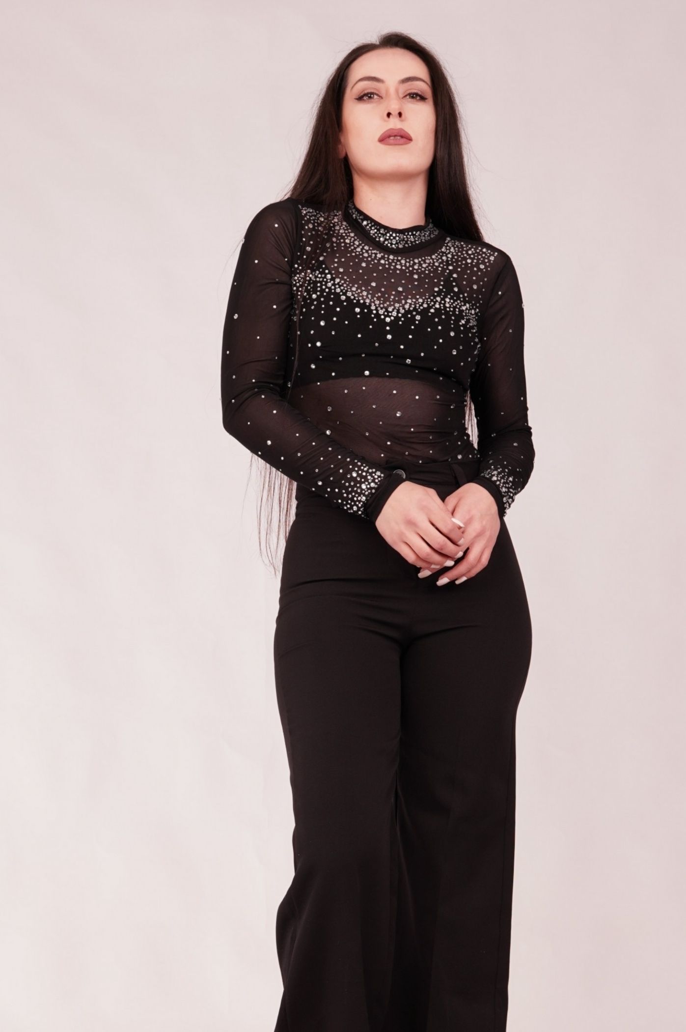 Αποκτήστε την απόλυτη κομψότητα και λάμψη με το κορμάκι διαφάνεια με στρας! Ένα statement piece ιδανικό για τις πιο λαμπερές νυχτερινές σας εμφανίσεις. Κλασικό και σέξι μαύρο χρώμα, εύκολο να συνδυαστεί και πάντα εντυπωσιακό. Πλούσια επένδυση με αστραφτερά στρας στην περιοχή του μπούστου, του λαιμού και των μανσετών, δημιουργώντας ένα εφέ "αστερόσκονης" που μαγνητίζει το βλέμμα. Το λεπτό, διαφανές ύφασμα προσφέρει μια αισθησιακή ματιά, ενώ ο ψηλός λαιμός και το μακρύ μανίκι διατηρούν την κομψότητα. Το κορμάκι αγκαλιάζει το σώμα, εξασφαλίζοντας τέλεια εφαρμογή και σταθερότητα κάτω από ψηλόμεσα ρούχα.