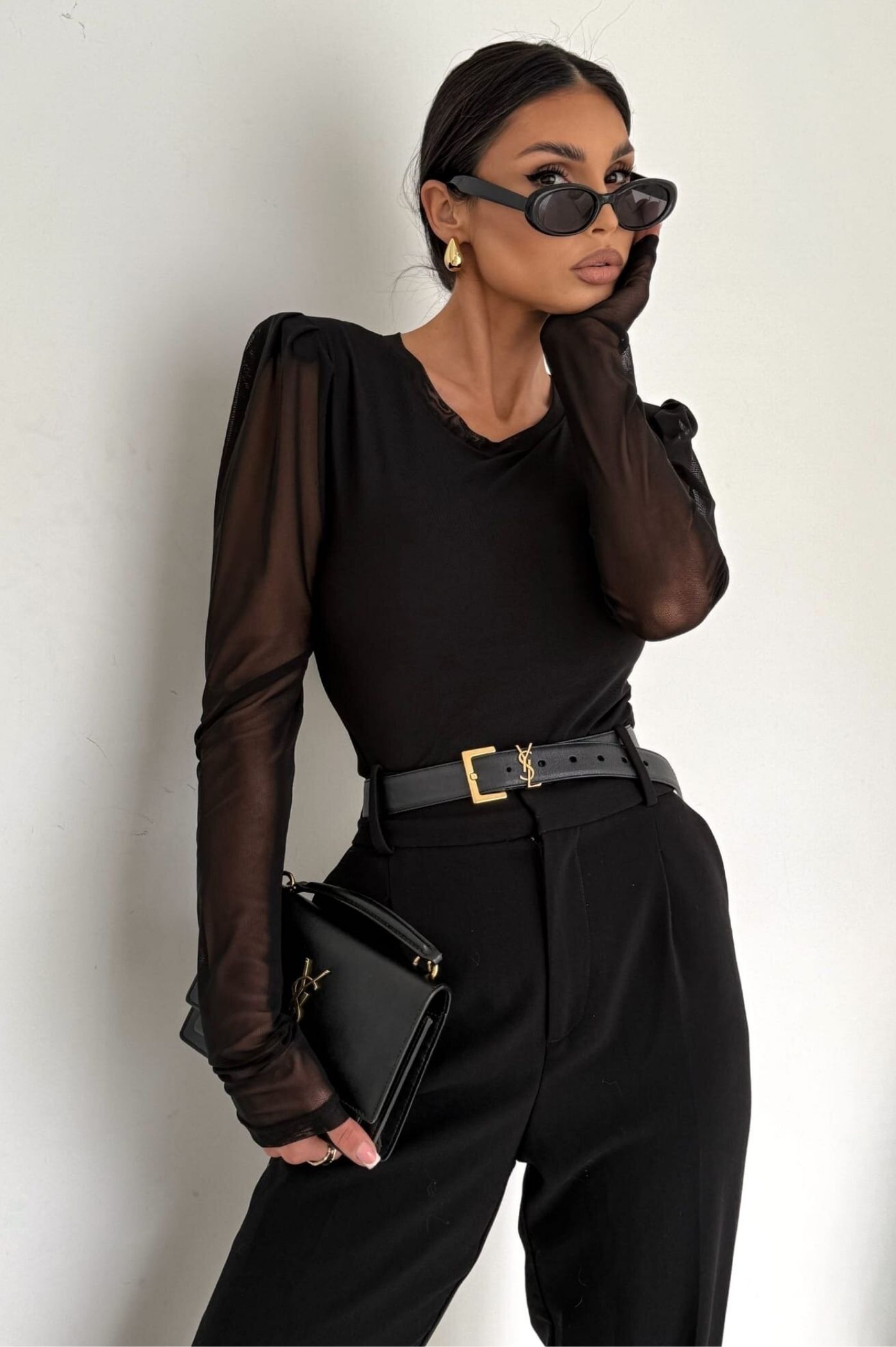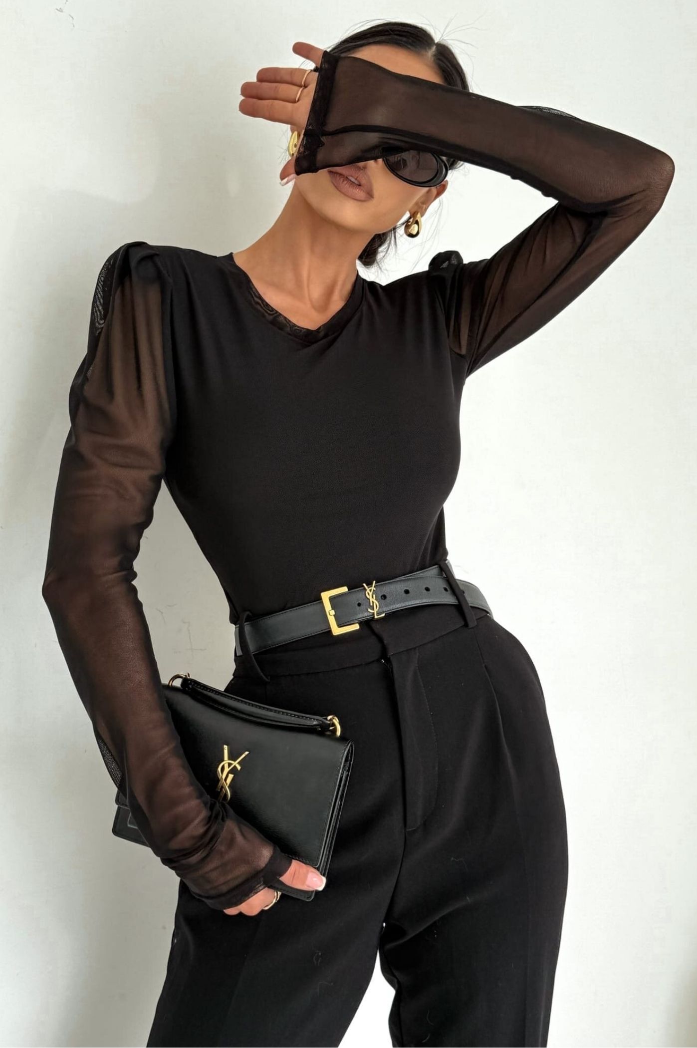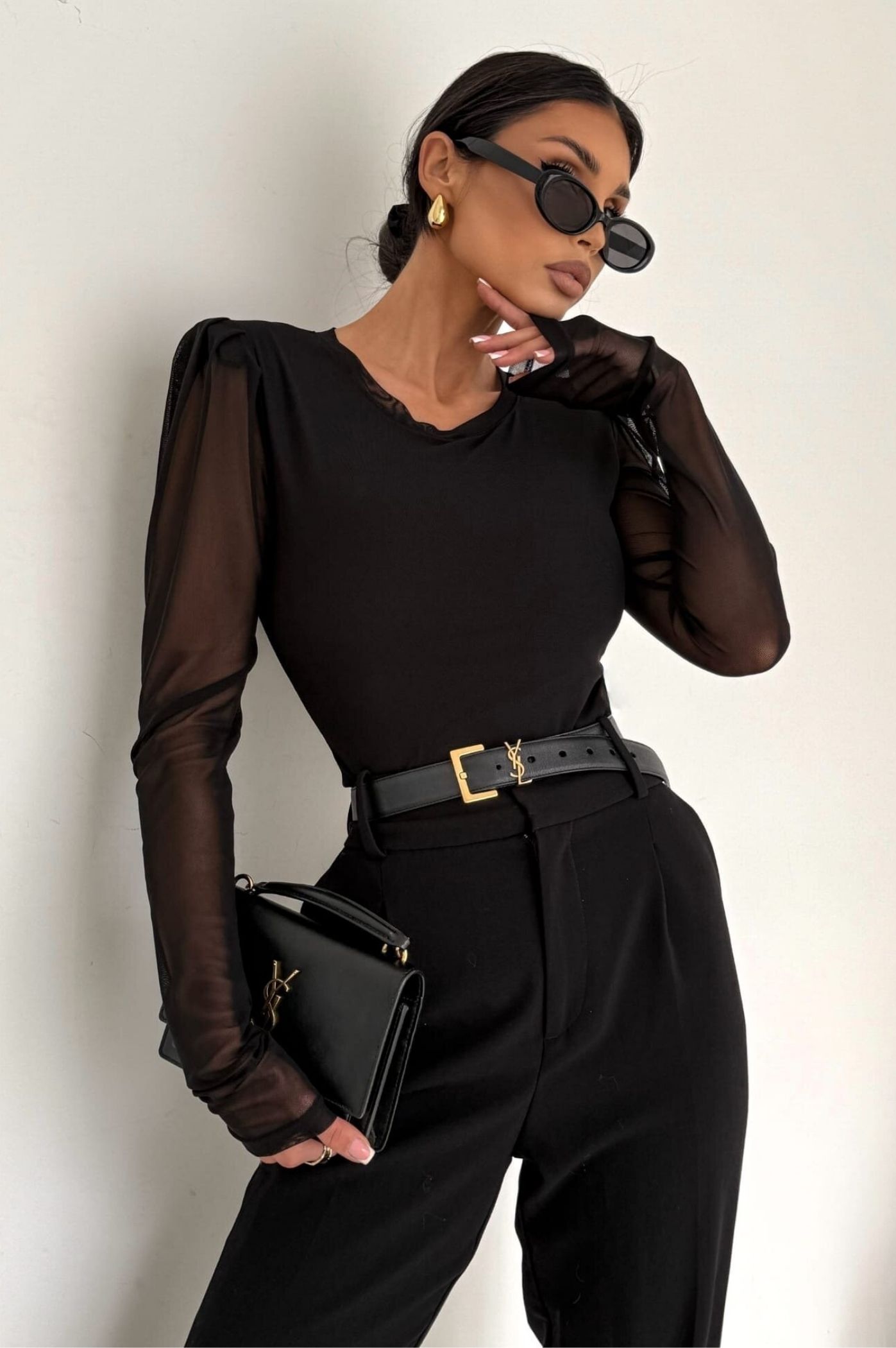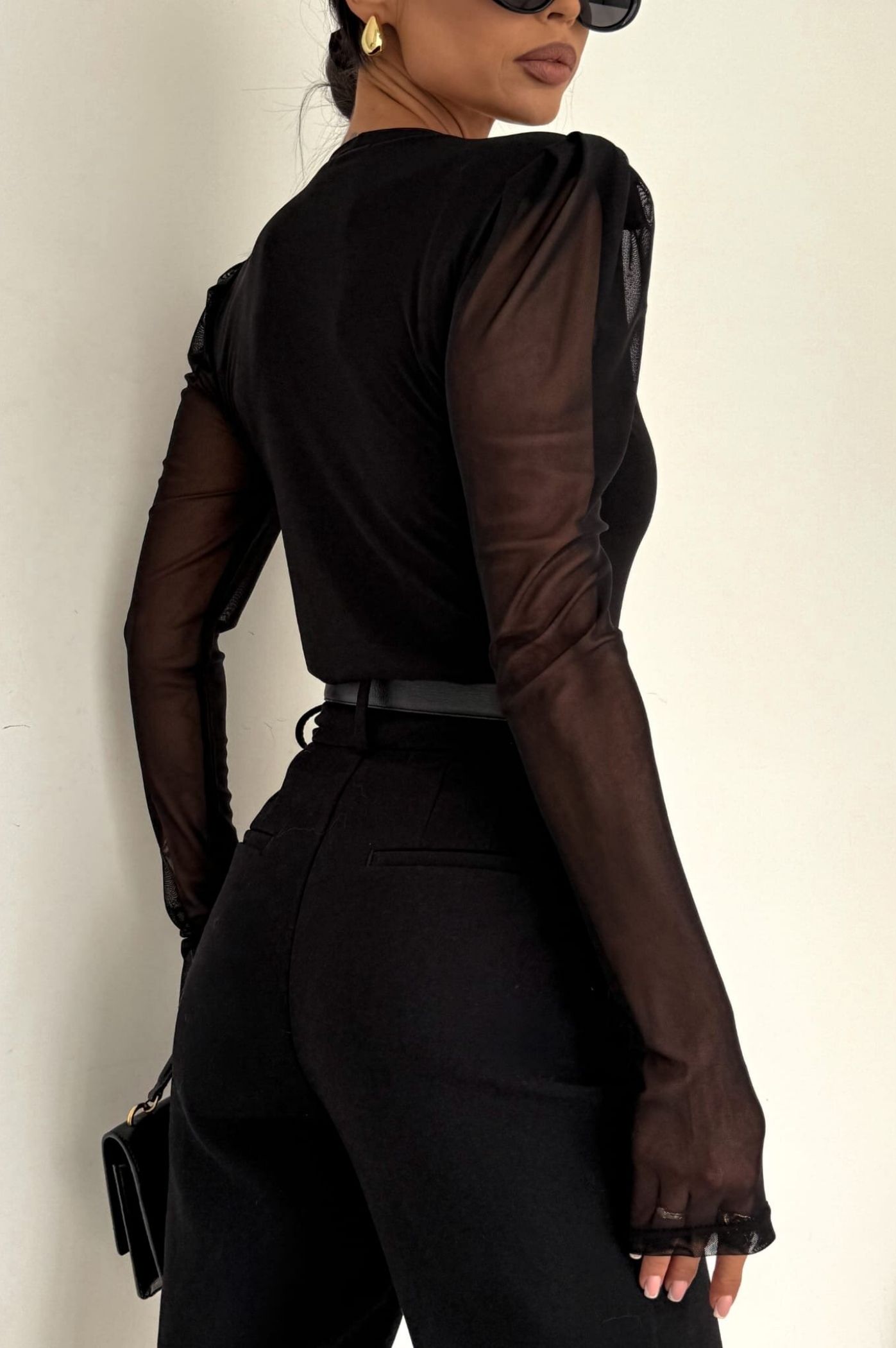 Αναδείξτε έναν αέρα κομψότητας και αισθησιασμού στη γκαρνταρόμπα σας με αυτό το μακρυμάνικο κορμάκι. Το bodysuit είναι το ιδανικό top για σταθερή εφαρμογή και άψογη εμφάνιση κάτω από παντελόνια ή φούστες. Το κύριο μέρος του κορμακίου είναι κατασκευασμένο από ελαστικό ύφασμα, ενώ τα μανίκια είναι από διάφανο τούλι με ελαφρώς τονισμένους ώμους, προσδίδοντας ένα μοντέρνο και θηλυκό στοιχείο. Αυτό το κομμάτι είναι ιδανικό για να δημιουργήσετε chic casual ή ημι-επίσημα σύνολα. Μπορεί να φορεθεί με ψηλόμεσα παντελόνια για μια statement εμφάνιση γραφείου ή με δερματίνη για βραδινή έξοδο. Αποτελεί το απαραίτητο γυναικείο τοπ για κάθε εποχή.