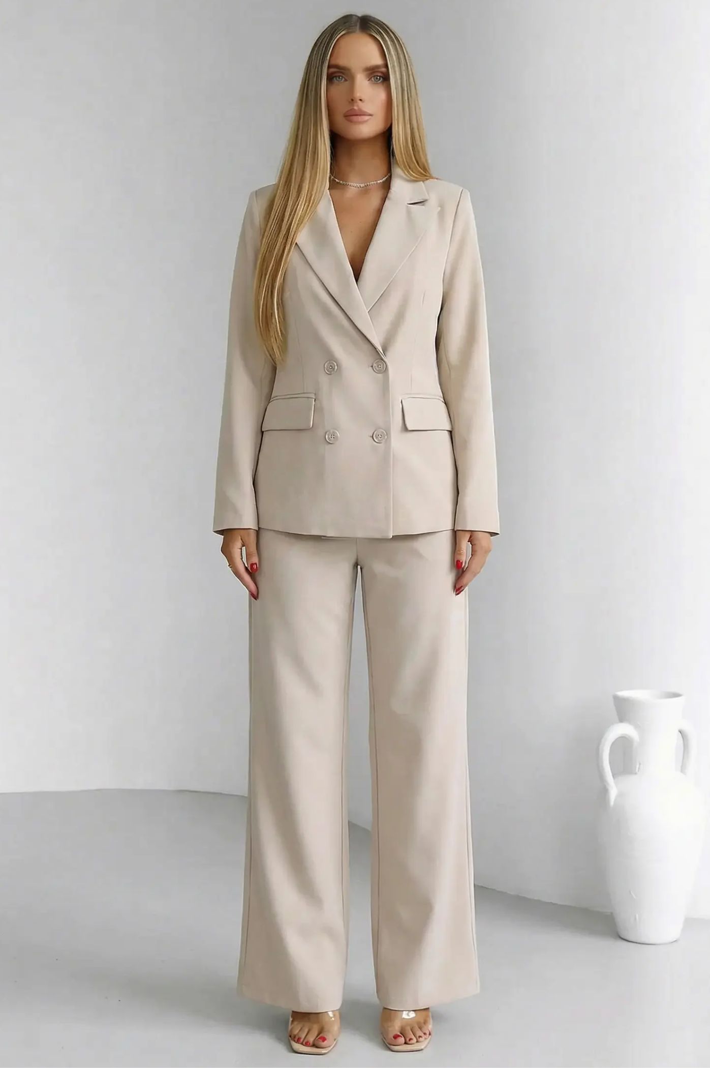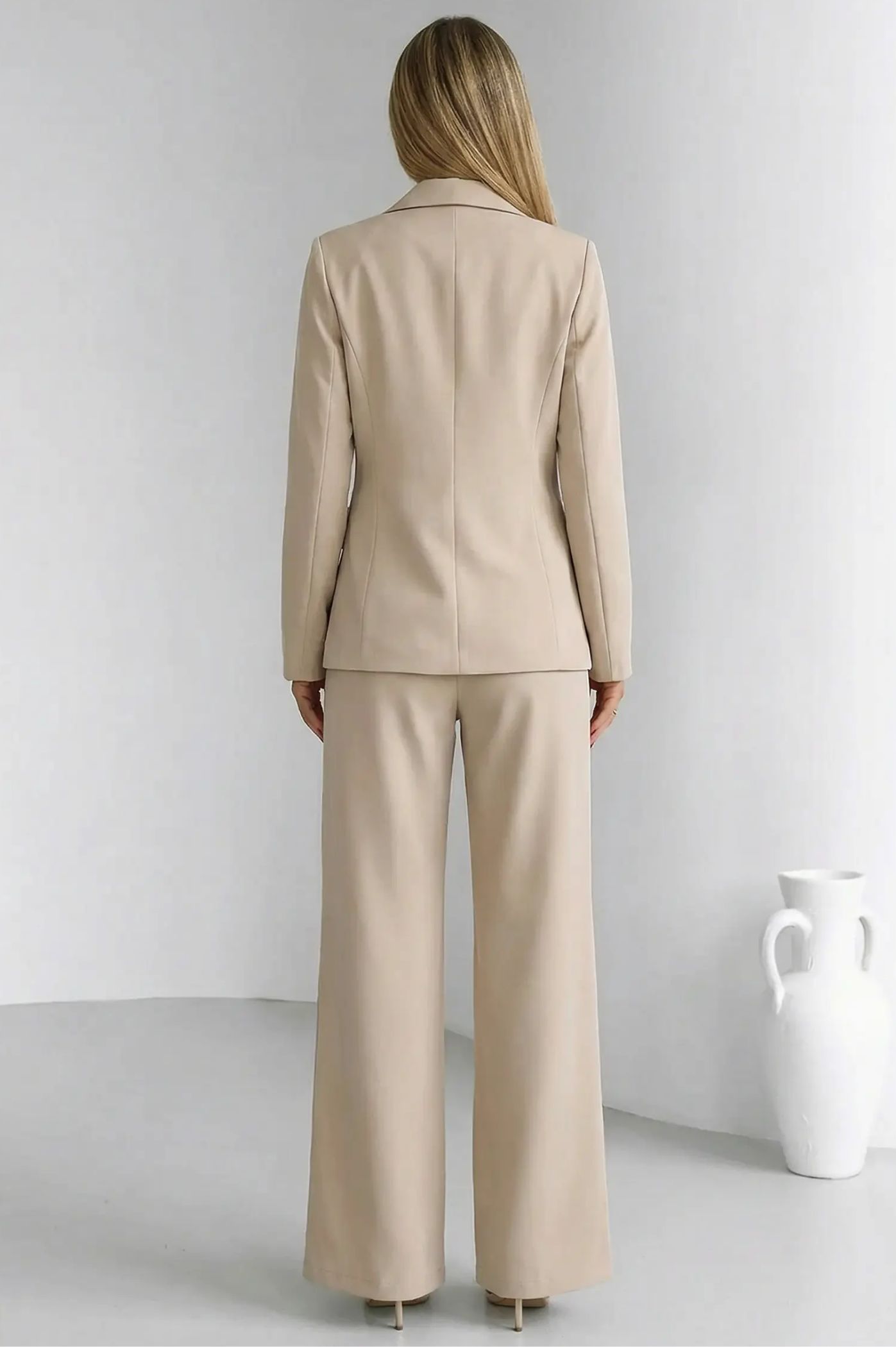 Αυτό το  κοστούμι αποτελεί μια διαχρονική επιλογή για κάθε σύγχρονη γκαρνταρόμπα. Το  σακάκι με τα τέσσερα κουμπιά και το έντονο πέτο δημιουργεί μια επιβλητική σιλουέτα που αποπνέει κύρος και μοντέρνα αισθητική. Η ψηλόμεση παντελόνα σε φαρδιά γραμμή προσφέρει αέρινη κίνηση και απόλυτη κομψότητα. Ένα σύνολο που ισορροπεί τέλεια ανάμεσα στο αυστηρό tailoring και τη σύγχρονη θηλυκότητα, ιδανικό για εμφανίσεις που θέλουν να κάνουν αισθητή την παρουσία τους με τον πιο σοφιστικέ τρόπο.