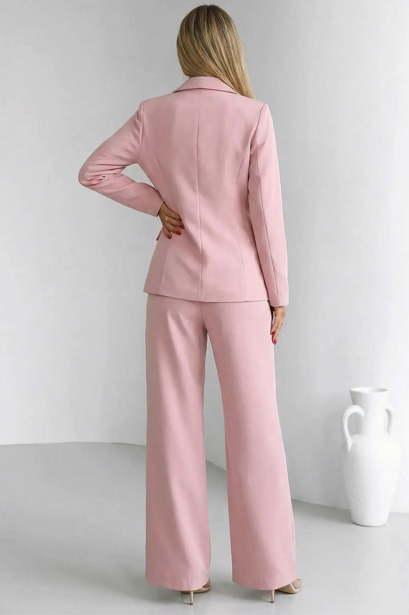 Αυτό το  κοστούμι αποτελεί μια διαχρονική επιλογή για κάθε σύγχρονη γκαρνταρόμπα. Το  σακάκι με τα τέσσερα κουμπιά και το έντονο πέτο δημιουργεί μια επιβλητική σιλουέτα που αποπνέει κύρος και μοντέρνα αισθητική. Η ψηλόμεση παντελόνα σε φαρδιά γραμμή προσφέρει αέρινη κίνηση και απόλυτη κομψότητα. Ένα σύνολο που ισορροπεί τέλεια ανάμεσα στο αυστηρό tailoring και τη σύγχρονη θηλυκότητα, ιδανικό για εμφανίσεις που θέλουν να κάνουν αισθητή την παρουσία τους με τον πιο σοφιστικέ τρόπο.