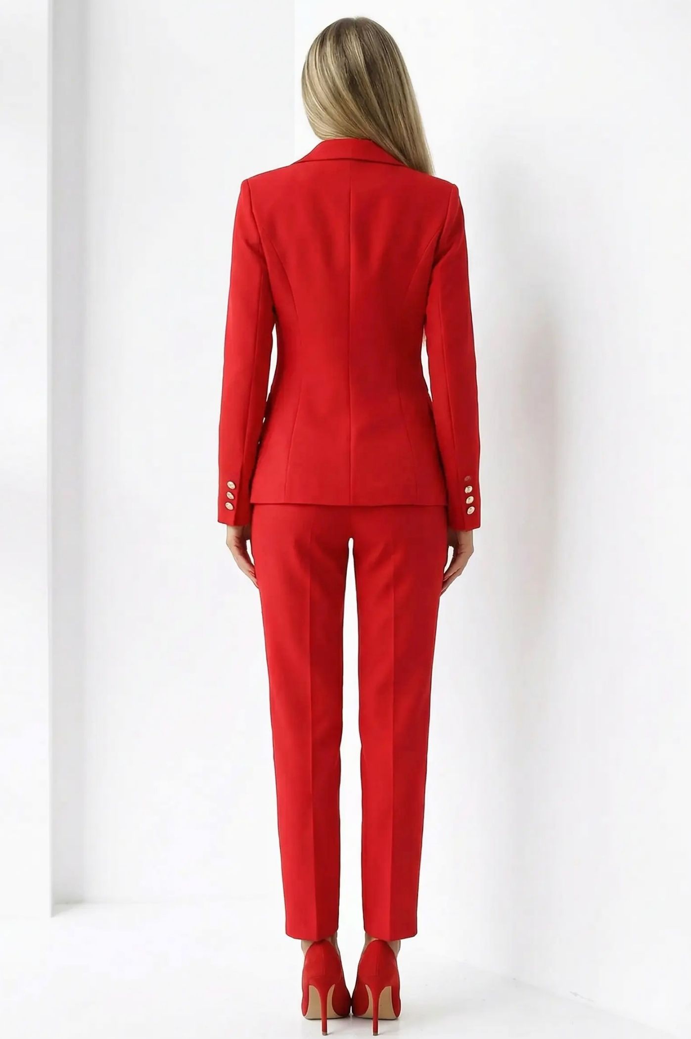 Αναδείξτε το επαγγελματικό και επίσημο στυλ σας με αυτό το μοντέρνο γυναικείο κοστούμι σετ. Σχεδιασμένο για τη σύγχρονη γυναίκα που θέλει να ξεχωρίζει με δυναμισμό και θηλυκότητα, αυτό το σύνολο αποτελεί την ιδανική επιλογή για office looks, επαγγελματικά ραντεβού, γάμους ή βαπτίσεις. Το σακάκι διαθέτει στενή, μεσάτη γραμμή που αναδεικνύει τη σιλουέτα, με εντυπωσιακά χρυσά κουμπιά που προσθέτουν μια luxury αίσθηση. Το παντελόνι σε ίσια γραμμή με τσάκιση προσφέρει ύψος και κομψότητα, εξασφαλίζοντας τέλεια εφαρμογή. Κατασκευασμένο από υλικά που αγκαλιάζουν το σώμα χωρίς να περιορίζουν την κίνηση, διατηρώντας τη φόρμα του όλη μέρα.