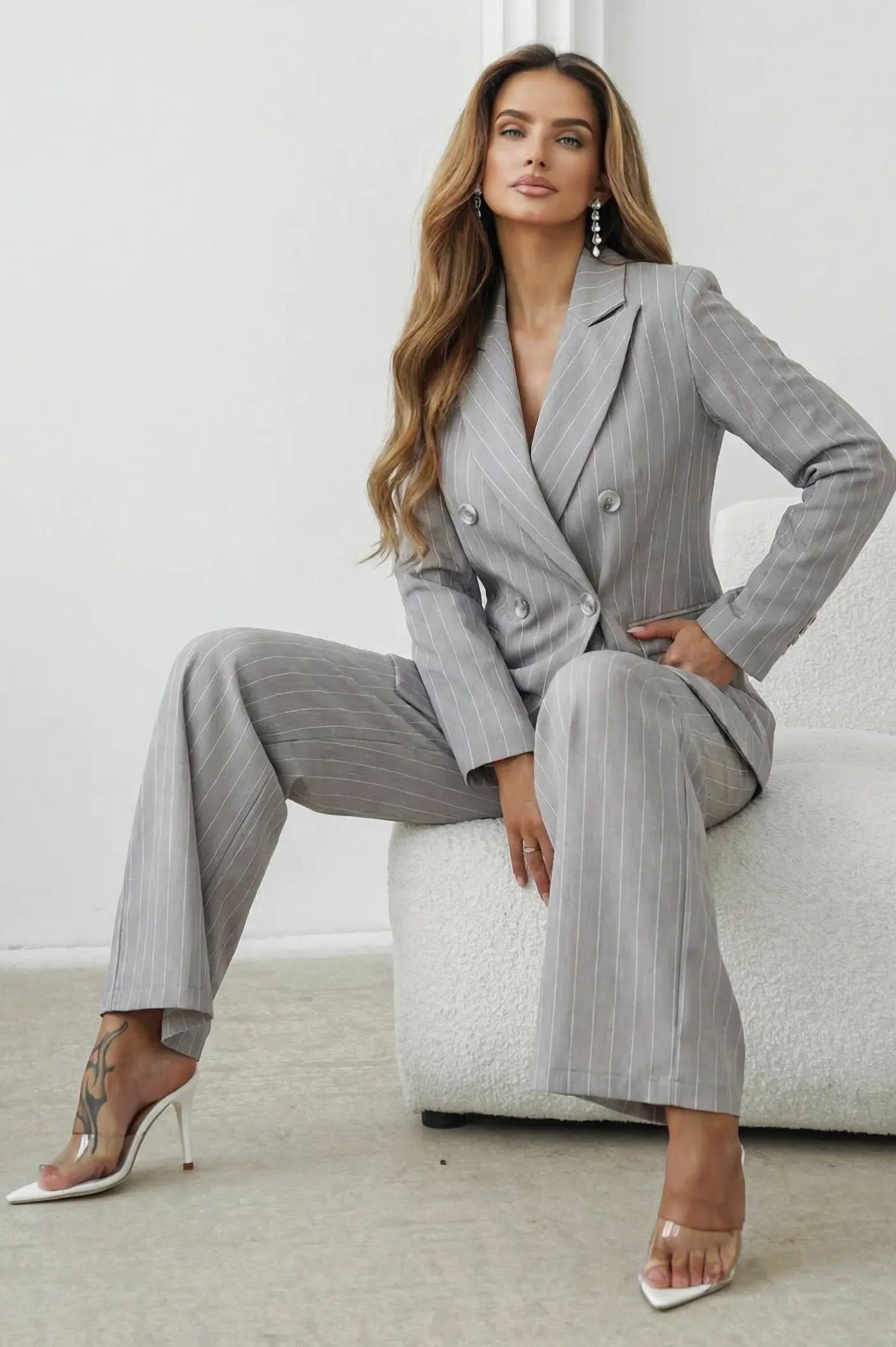 Εντυπωσιάστε σε κάθε σας εμφάνιση με το γυναικείο ριγέ κοστούμι. Σχεδιασμένο για να προσφέρει δυναμισμό και θηλυκότητα, αυτό το σετ αποτελεί την ιδανική επιλογή για το γραφείο, επαγγελματικές συναντήσεις ή επίσημες κοινωνικές εκδηλώσεις. Διαθέτει διαχρονικό σταυρωτό κλείσιμο με κουμπιά που σμιλεύει τη μέση, κλασικό πέτο και λειτουργικές τσέπες με καπάκι. Σε κομψή γραμμή καμπάνα που επιμηκύνει τη σιλουέτα, προσφέροντας μια αίσθηση ύψους και αέρινης κίνησης. Διακριτική κάθετη ρίγα που προσδίδει κύρος και μια νότα "power dressing".