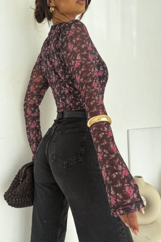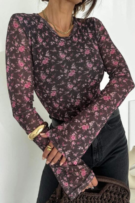 ΜΠΛΟΥΖΑ ΜΕ ΔΙΑΦΑΝΕΙΑ ΚΑΙ ΚΑΜΠΑΝΑ ΜΑΝΙΚΙΑ FLORAL – ΚΑΦΕ-ΡΟΖ