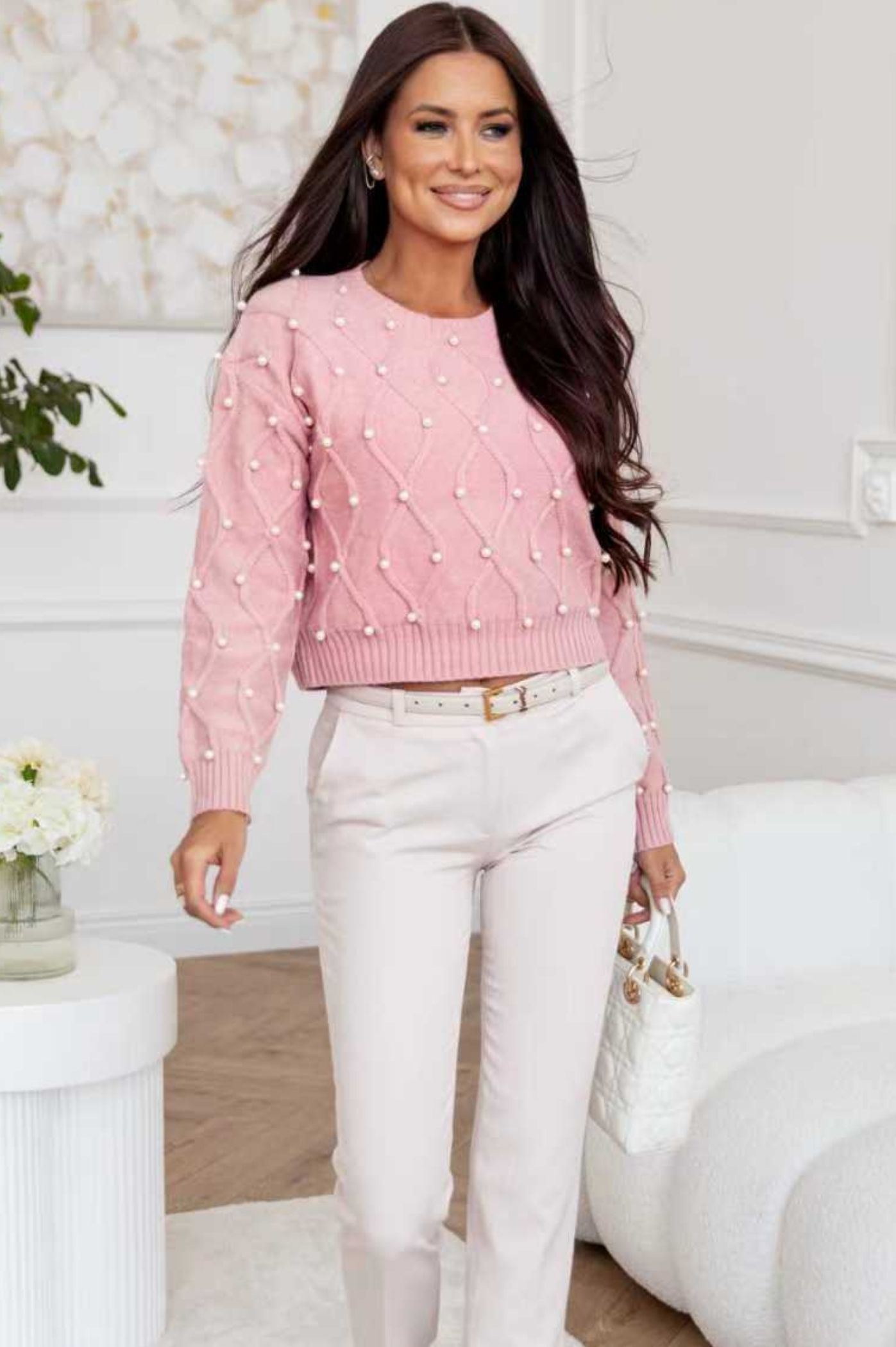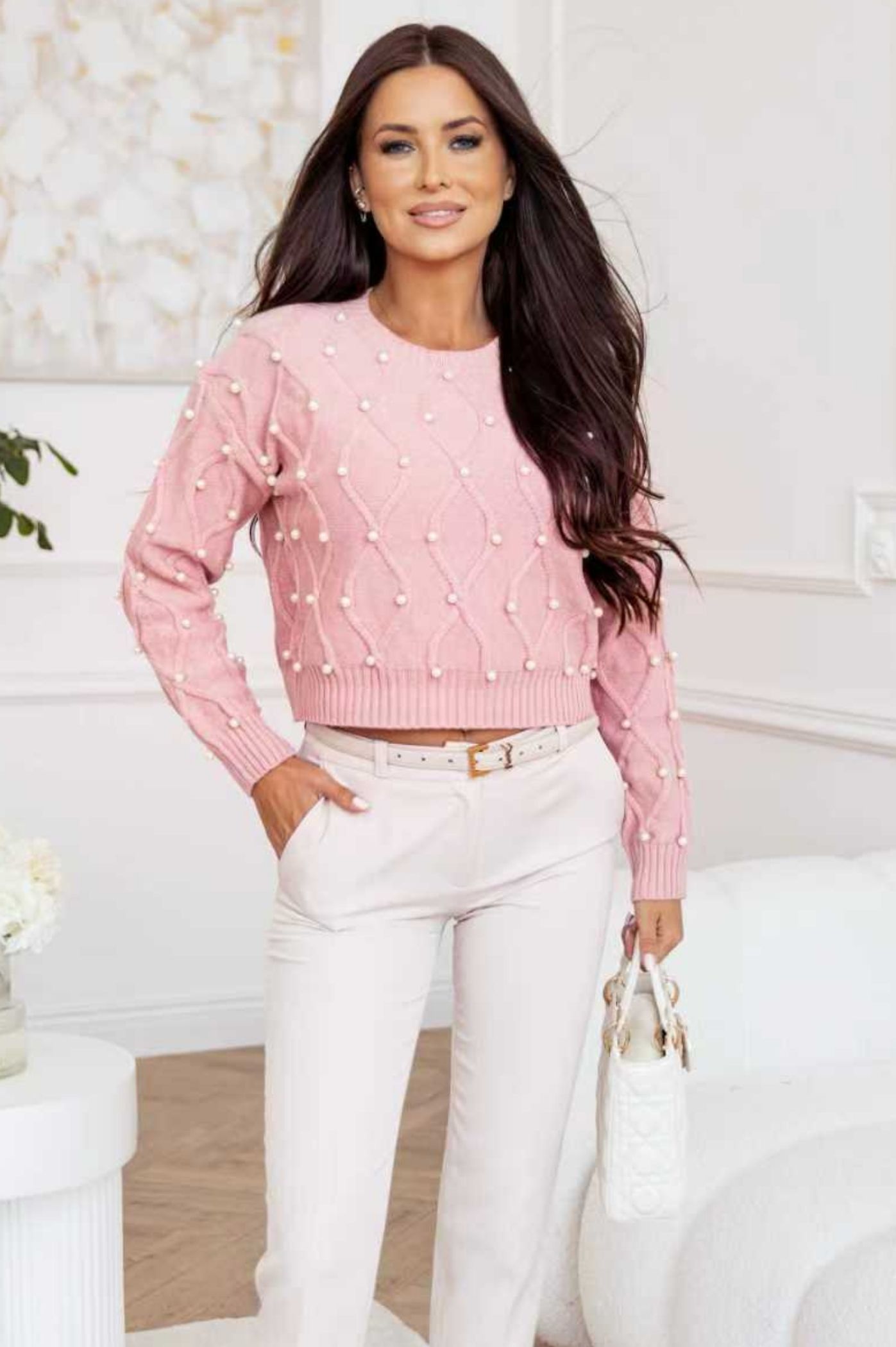 Αναδείξτε τη χειμερινή σας γκαρνταρόμπα με αυτό το κομψό cropped πλεκτό πουλόβερ, ιδανικό για μοντέρνα και θηλυκά σύνολα. Το πουλόβερ ξεχωρίζει χάρη στο ανάγλυφο πλεκτό μοτίβο σε σχήμα διαμαντιού, το οποίο είναι διακοσμημένο με μικρά μαργαριτάρια σε όλη την επιφάνεια. Η κοντή γραμμή του είναι ιδανική για να φορεθεί με ψηλόμεσα παντελόνια ή φούστες. Τα μαργαριτάρια προσδίδουν μια ρομαντική και αριστοκρατική πινελιά, μετατρέποντας ένα απλό χειμωνιάτικο πλεκτό σε statement piece. Είναι η τέλεια επιλογή για casual chic εμφανίσεις, για το γραφείο ή για ένα καφέ με φίλες. Αναζητάτε ένα γυναικείο πουλόβερ που συνδυάζει την ζεστασιά με τη διαχρονική κομψότητα; Μόλις το βρήκατε!