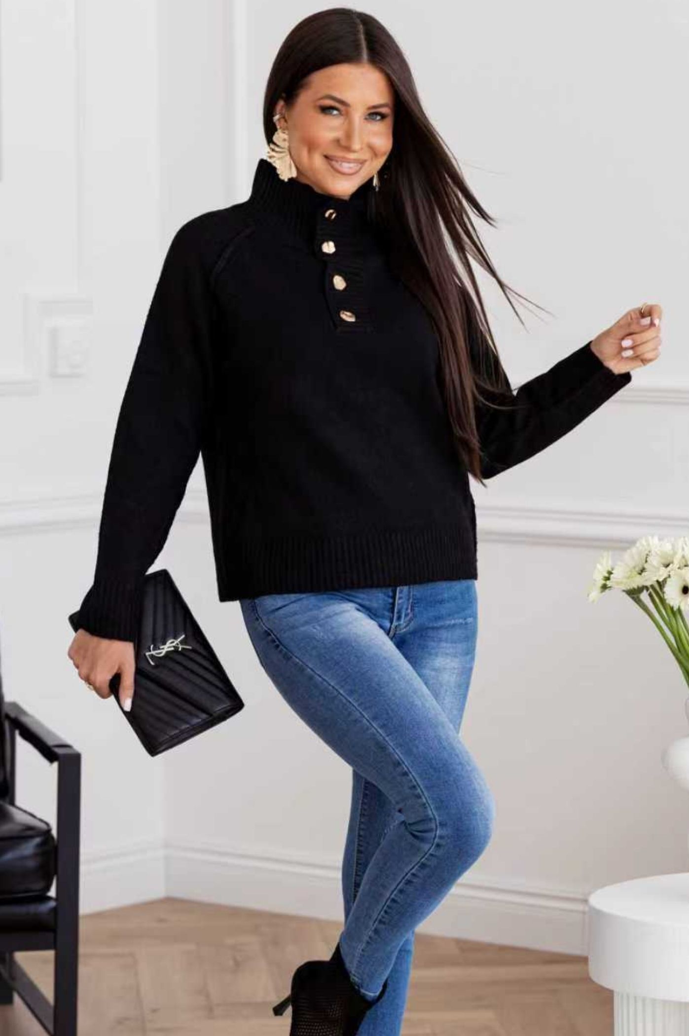 Αναδείξτε το στυλ σας με αυτό το ζεστό και κομψό γυναικείο πουλόβερ. Αυτή η πλεκτή μπλούζα διαθέτει άνετη γραμμή και μαλακή υφή, ιδανική για τις κρύες ημέρες του χρόνου. Το ιδιαίτερο χαρακτηριστικό της είναι ο όρθιος γιακάς που διακοσμείται με εντυπωσιακά χρυσά κουμπιά, προσδίδοντας έναν αέρα πολυτέλειας και preppy στυλ. Η εφαρμογή είναι ελαφρώς oversized, καθιστώντας την ιδανική για να φορεθεί πάνω από άλλα ρούχα ή μόνη της. Μπορεί να φορεθεί με μίνι φούστες ή με τζιν και μπότες για ένα ολοκληρωμένο, casual chic σύνολο. Το τέλειο χειμερινό πλεκτό για κομψές και ζεστές εμφανίσεις.