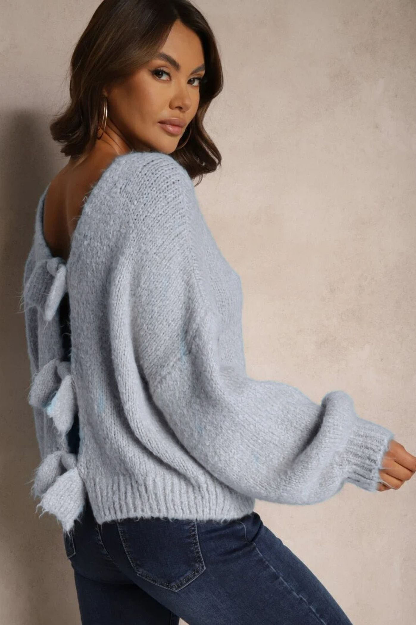 Αναβάθμισε το καθημερινό σου στυλ με αυτή τη μοναδική γυναικεία πλεκτή μπλούζα. Κατασκευασμένη από απαλό, ζεστό ύφασμα, προσφέρει άνεση και κομψότητα σε κάθε σου εμφάνιση. Το ξεχωριστό σχέδιο με ανοιχτή πλάτη και διακοσμητικά δεσίματα δημιουργεί μια ρομαντική και θηλυκή πινελιά, ιδανική για ιδιαίτερες περιστάσεις αλλά και για stylish casual looks