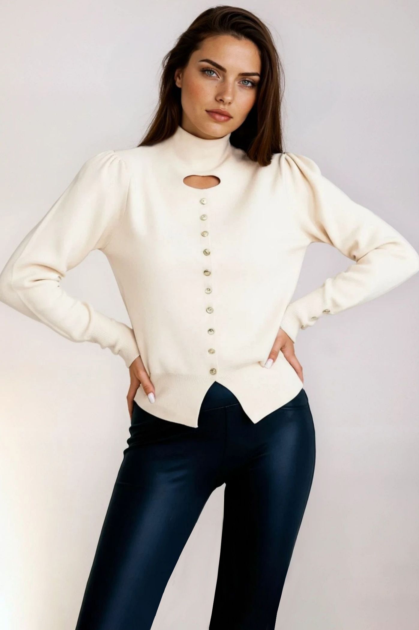 Αναδείξτε το στυλ σας με αυτή την εξαιρετικά κομψή γυναικεία πλεκτή μπλούζα. Διαθέτει ψηλό λαιμό με εντυπωσιακό cut-out στο ντεκολτέ, προσθέτοντας μια σέξι, μοντέρνα πινελιά. Το μπροστινό μέρος υπάρχει μια σειρά από διακοσμητικά κουμπιά, ενώ παρόμοια κουμπιά κοσμούν και τις μανσέτες των μακριών μανικιών. Η λεπτή πλέξη και η εφαρμοστή γραμμή την καθιστούν ιδανική για να φορεθεί μέσα από ψηλόμεσες φούστες ή παντελόνια. Είναι το must-have κομμάτι για το φθινόπωρο και τον χειμώνα που συνδυάζει ζεστή αίσθηση με sophisticated στυλ, ιδανικό για βραδινές εξόδους και chic εμφανίσεις.