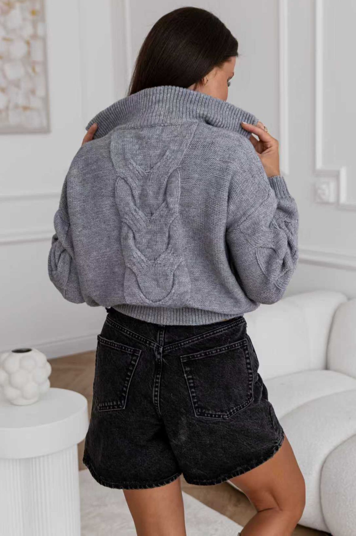 Αποκτήστε το πιο μοντέρνο και ζεστό κομμάτι της σεζόν! Αυτή η γυναικεία πλεκτή μπλούζα συνδυάζει την άνεση με το στυλ. Διαθέτει χαλαρή γραμμή και εντυπωσιακό σχέδιο πλέξης στο μπροστινό μέρος και στα μανίκια. Το ιδιαίτερο χαρακτηριστικό της είναι ο ψηλός γιακάς με φερμουάρ, που σας επιτρέπει να ρυθμίζετε το ντεκολτέ ανάλογα με τη διάθεσή σας είτε κλειστό ως ζιβάγκο, είτε ανοιχτό ως πόλο. Η cropped εφαρμογή την καθιστά ιδανική για συνδυασμό με ψηλόμεσες φούστες ή τζιν παντελόνια. Ιδανική για casual και athleisure εμφανίσεις, αυτό το γκρι πουλόβερ είναι το απόλυτο go-to για τον χειμώνα και το φθινόπωρο.