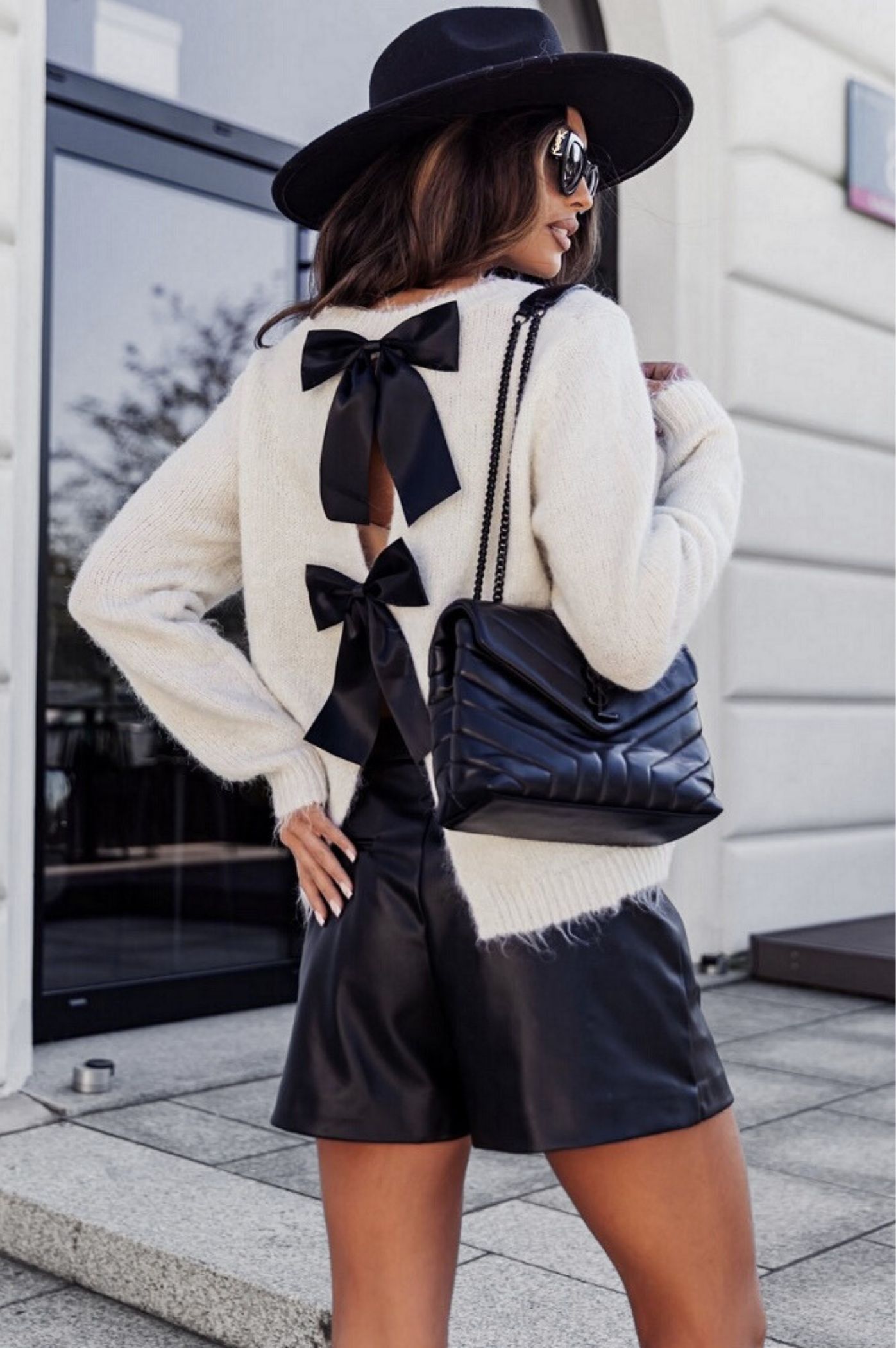 Αναδείξτε την απόλυτη ισορροπία μεταξύ άνεσης και κομψότητας με αυτή τη μοναδική γυναικεία πλεκτή μπλούζα. Η μπλούζα έχει χαλαρή γραμμή και μαλακή, ζεστή υφή, ιδανική για τις casual chic εμφανίσεις του χειμώνα. Ενώ μπροστά είναι ένα κλασικό πουλόβερ με στρογγυλή λαιμόκοψη, πίσω κρύβει ένα εκπληκτικό statement σχέδιο, εντυπωσιακά ανοίγματα που διακοσμούνται με δύο μεγάλους μαύρους φιόγκους. Αυτό το στοιχείο μετατρέπει την πλεκτή μπλούζα σε βραδινό ή fashion κομμάτι, προσδίδοντας έναν αέρα ρομαντισμού και θάρρους. Μπορεί να φορεθεί με ψηλόμεσα τζιν ή δερμάτινα παντελόνια.