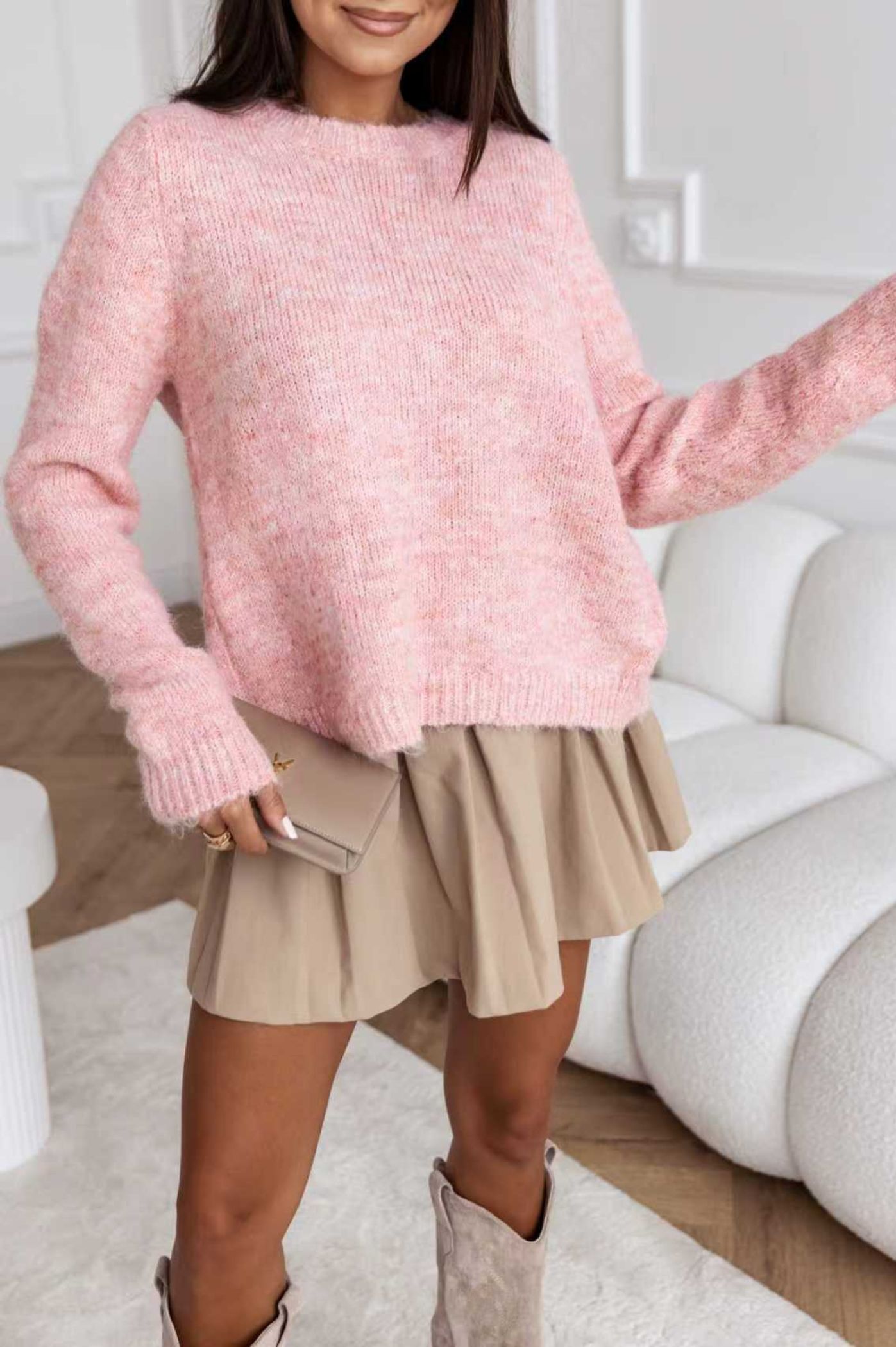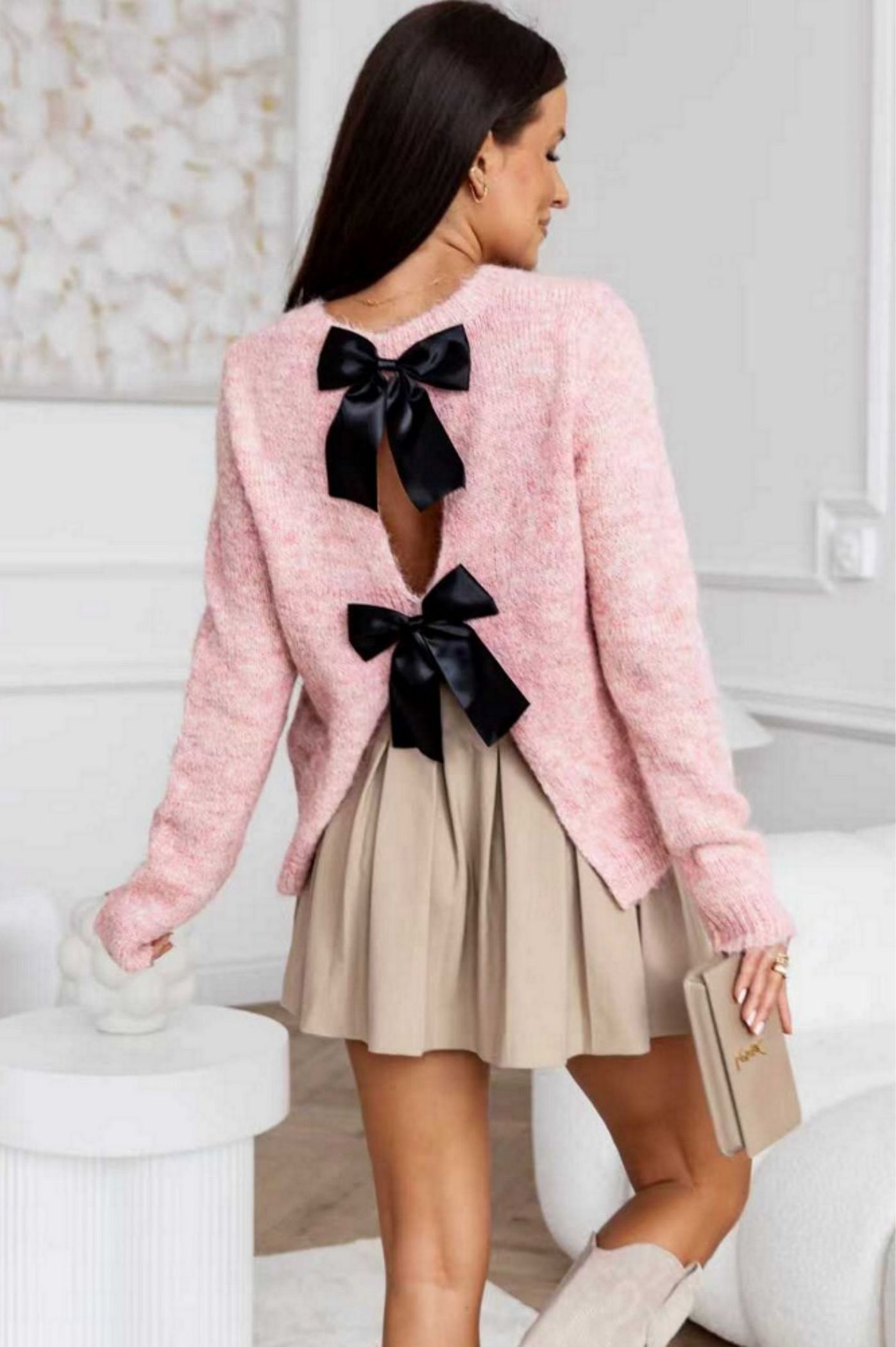 Αναδείξτε την απόλυτη ισορροπία μεταξύ άνεσης και κομψότητας με αυτή τη μοναδική γυναικεία πλεκτή μπλούζα. Η μπλούζα έχει χαλαρή γραμμή και μαλακή, ζεστή υφή, ιδανική για τις casual chic εμφανίσεις του χειμώνα. Ενώ μπροστά είναι ένα κλασικό πουλόβερ με στρογγυλή λαιμόκοψη, πίσω κρύβει ένα εκπληκτικό statement σχέδιο, εντυπωσιακά ανοίγματα που διακοσμούνται με δύο μεγάλους μαύρους φιόγκους. Αυτό το στοιχείο μετατρέπει την πλεκτή μπλούζα σε βραδινό ή fashion κομμάτι, προσδίδοντας έναν αέρα ρομαντισμού και θάρρους. Μπορεί να φορεθεί με ψηλόμεσα τζιν ή δερμάτινα παντελόνια.