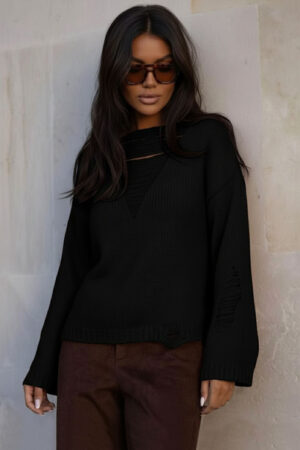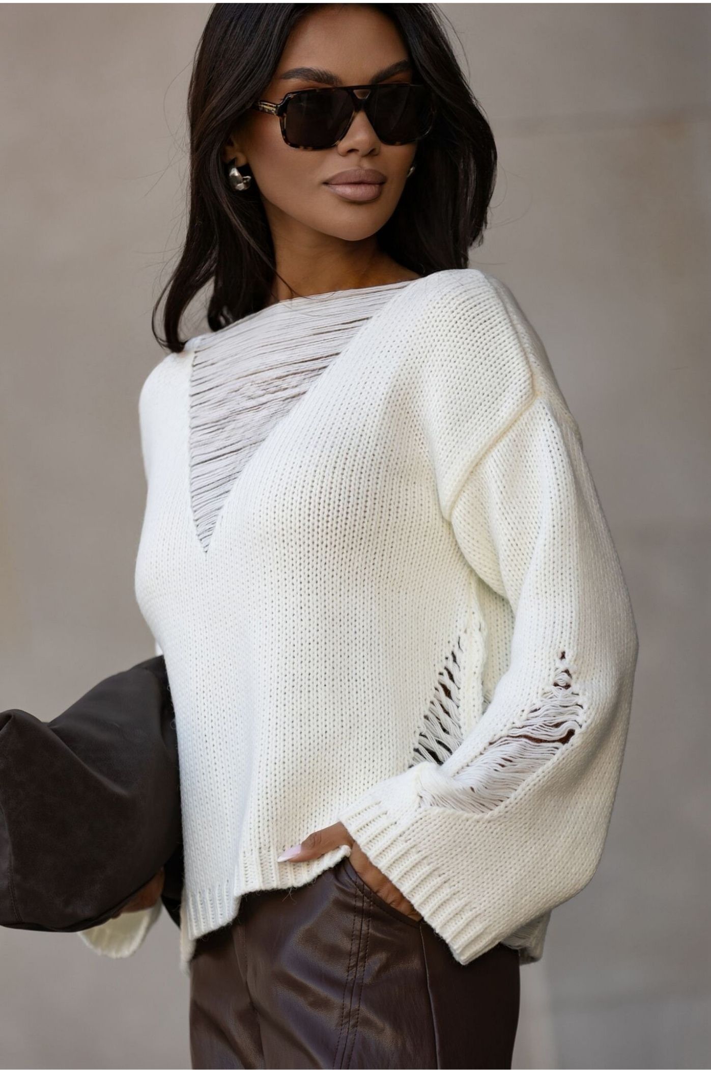 Αναδείξτε το στυλ σας με την πιο must-have λευκή πλεκτή μπλούζα της σεζόν! Με oversized γραμμή και μοναδικά σκισίματα στο V ντεκολτέ και τα μανίκια, αυτή η πλεκτή μπλούζα συνδυάζει την άνεση με το απόλυτο trendy look. Το πλεκτό ύφασμα είναι ιδανικό για δροσερές μέρες και νύχτες, ενώ το V ντεκολτέ με το ιδιαίτερο distressed τελείωμα προσθέτει μια αίσθηση ατημέλητης κομψότητας και rock διάθεσης. Μπορεί να φορεθεί με δερματίνη παντελόνια ή κολάν για ένα τολμηρό, μοντέρνο outfit, ή με ένα τζιν για ένα πιο casual, αλλά πάντα εντυπωσιακό αποτέλεσμα.