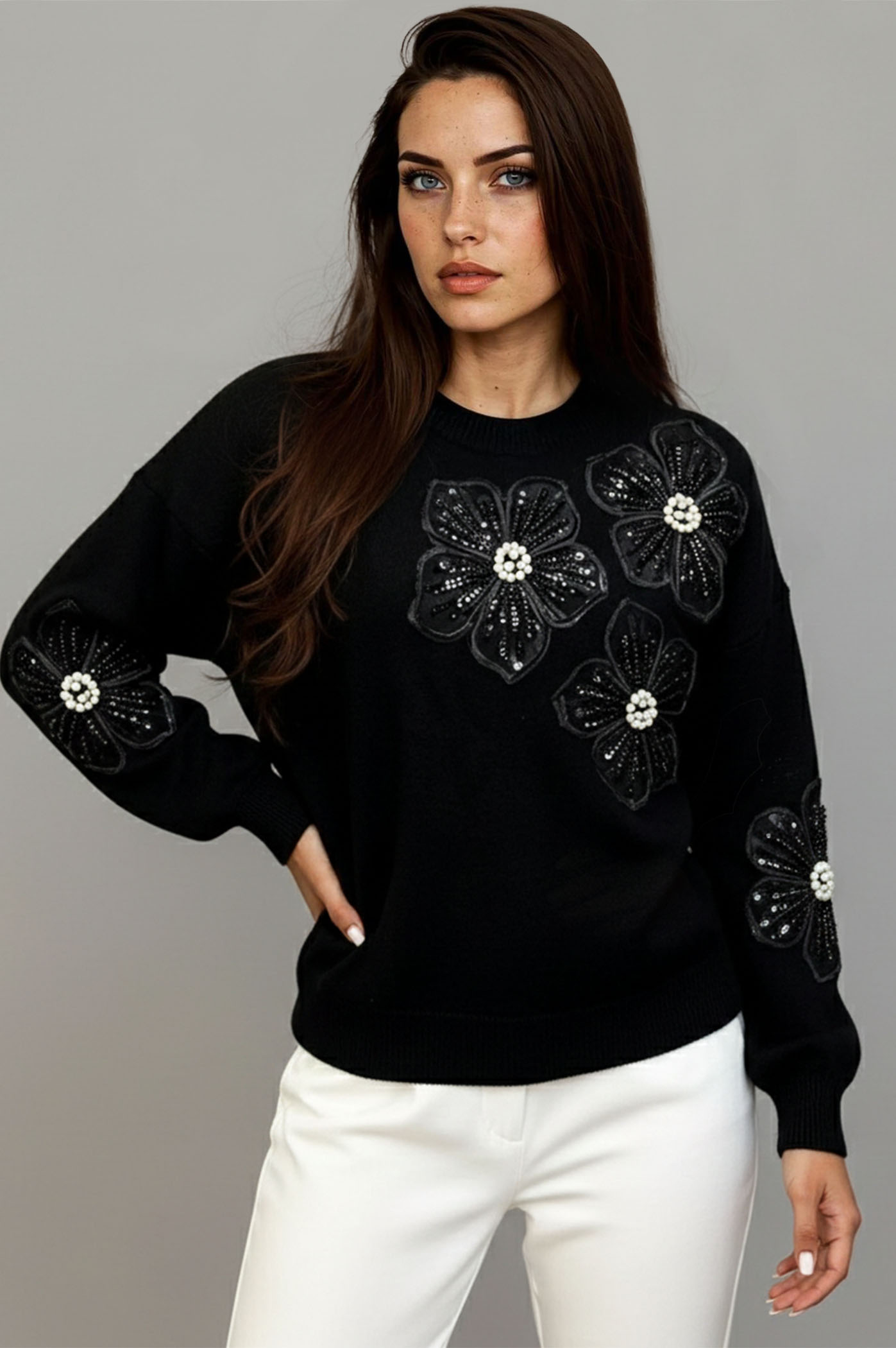 Αναδείξτε το χειμερινό σας στυλ με αυτό τη ζεστή και κομψή πλεκτή μπλούζα. Το κλασικό πλεκτό συναντά τη μοντέρνα, glamorous λεπτομέρεια των τρισδιάστατων λουλουδιών, κάνοντάς το ιδανικό για τις γιορτές, το γραφείο ή ένα chic καθημερινό look. Είναι ένα statement piece που συνδυάζει την άνεση του πλεκτού με την κομψότητα των κεντημένων λουλουδιών.