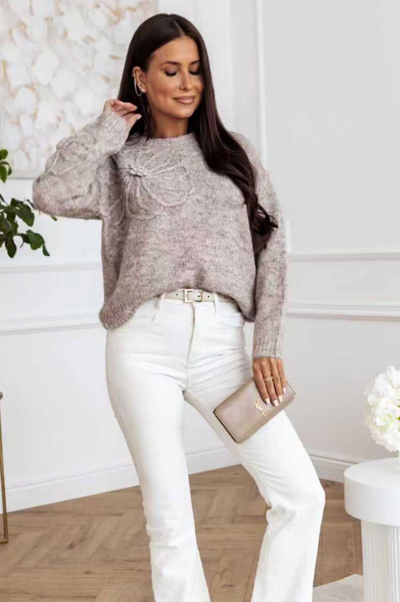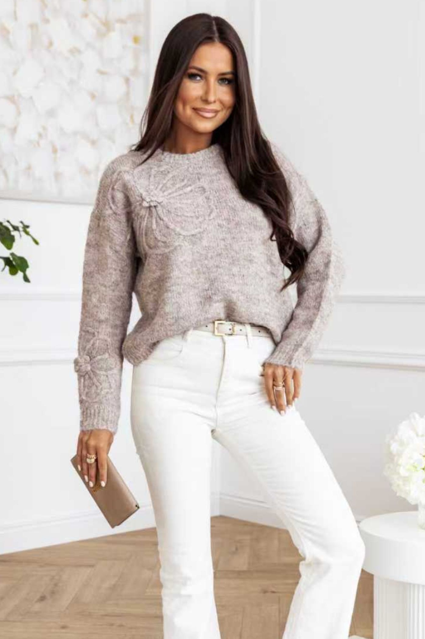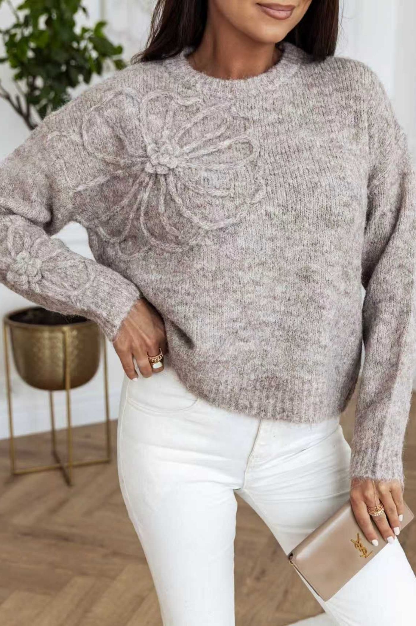 Προσθέστε μια ρομαντική και παιχνιδιάρικη πινελιά στην γκαρνταρόμπα σας με αυτό το εντυπωσιακό πλεκτό πουλόβερ. Το ρούχο ξεχωρίζει για το μοναδικό σχέδιο λουλουδιού, που του δίνει όγκο, υφή και έναν ξεχωριστό χαρακτήρα. Η πλέξη είναι μαλακή και αφράτη, προσφέροντας άνεση και ζεστασιά, ενώ η χαλαρή γραμμή το καθιστά ιδανικό για layering. Η στρογγυλή λαιμόκοψη και η απλότητα του υπόλοιπου σχεδίου αναδεικνύουν το λουλούδι ως το κεντρικό στοιχείο. Μπορεί να φορεθεί με τζιν ή δερμάτινα παντελόνια για ένα chic casual look.