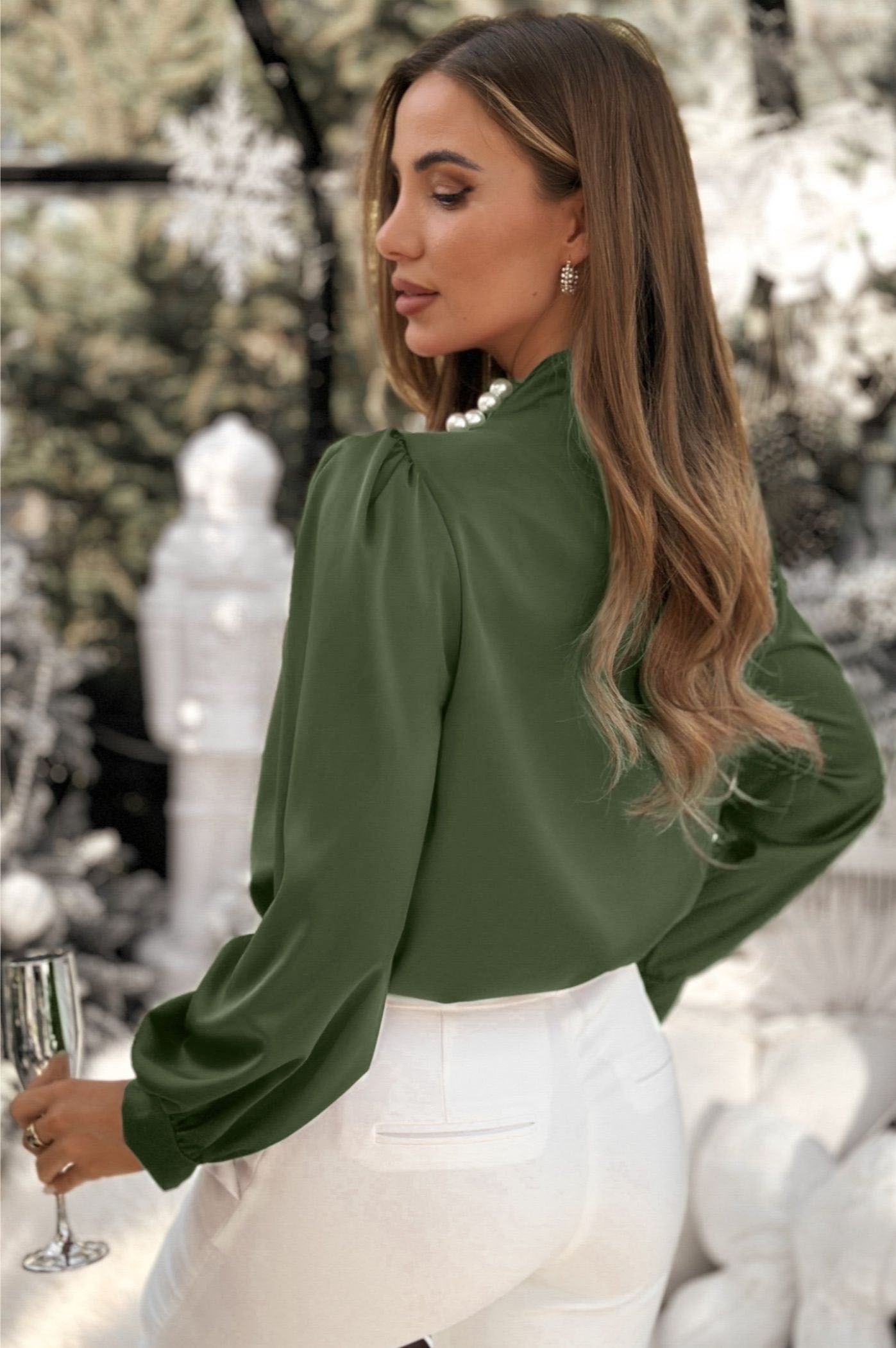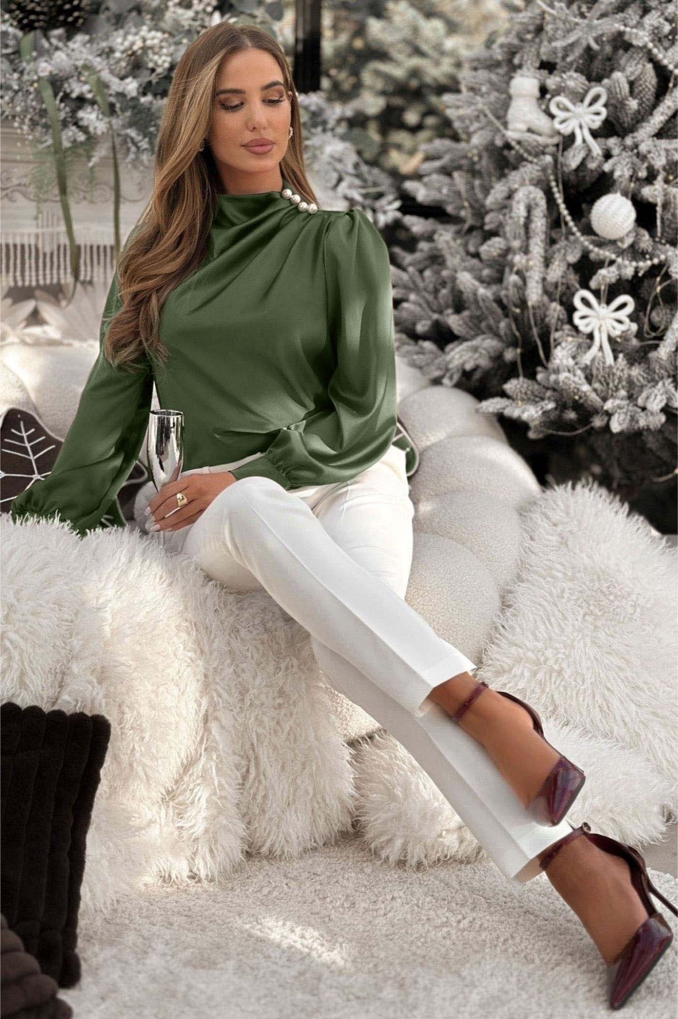 Αναδείξτε το κομψό σας στυλ με αυτήν την εκθαμβωτική σατέν μπλούζα. Κομψή και αριστοκρατική, αυτή η σατέν μπλούζα είναι η ιδανική επιλογή για επίσημες εμφανίσεις. Το ύφασμα σατέν χαρίζει ρευστότητα και λάμψη, ενώ το χαμηλό ζιβάγκο προσδίδει φινέτσα. Διαθέτει διακοσμητικές πέρλες στους ώμους που λειτουργούν ως statement κόσμημα. Συνδυάστε τη με λευκά ή μαύρα παντελόνια για ένα luxury και γιορτινό αποτέλεσμα.