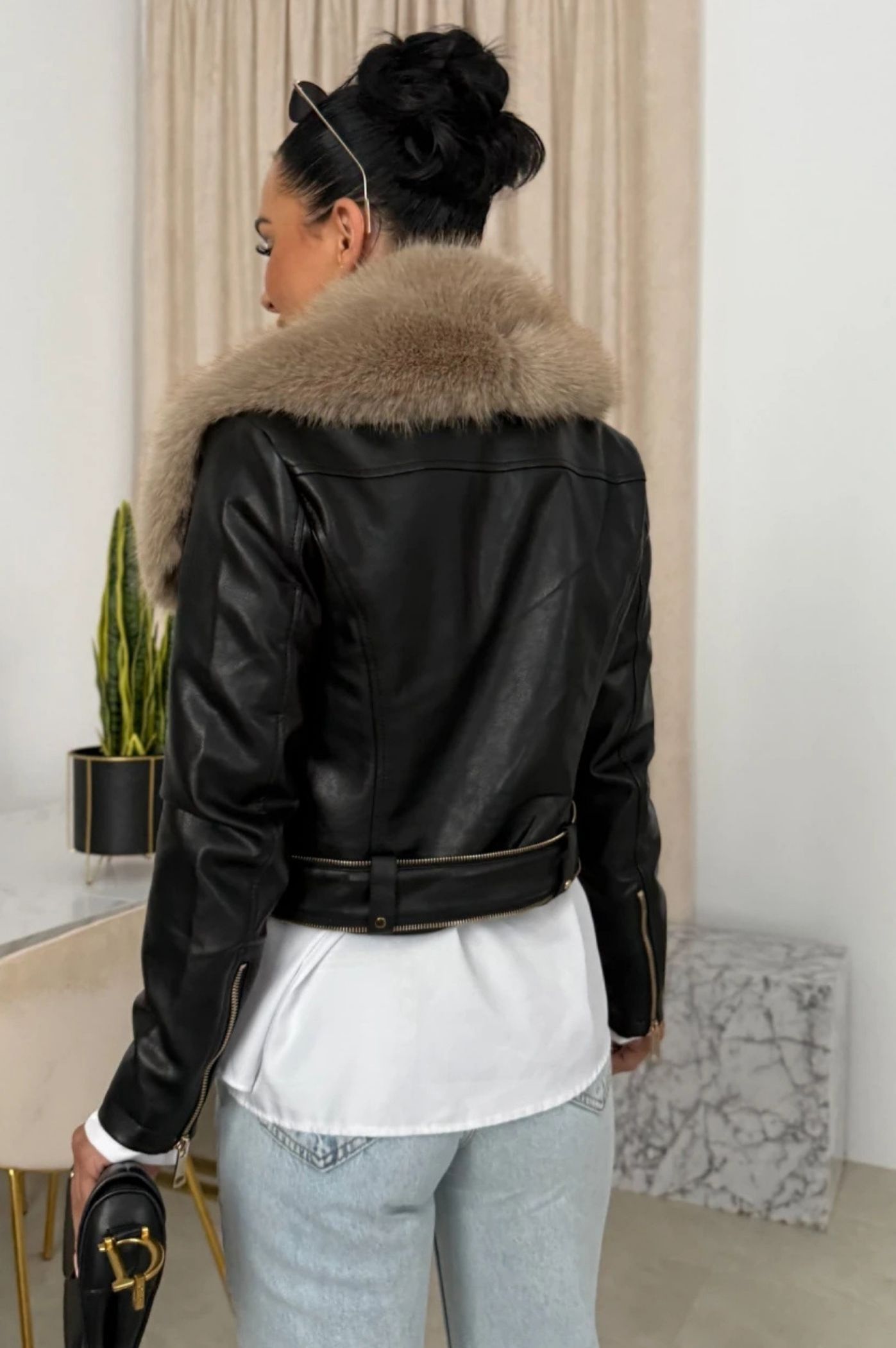Αναδείξτε το στυλ σας με αυτό το εντυπωσιακό γυναικείο μπουφάν! Κατασκευασμένο από υψηλής ποιότητας δερματίνη, προσφέρει την αίσθηση του δέρματος και την ανθεκτικότητα που χρειάζεστε. Το μπουφάν ξεχωρίζει χάρη στον πλούσιο αποσπώμενο γούνινο γιακά σε φυσικό χρώμα, ο οποίος προσδίδει ζεστασιά και μια πινελιά πολυτέλειας στο biker/rock ύφος. Διαθέτει μεταλλικά φερμουάρ και κομψή δερμάτινη ζώνη στη μέση με μεγάλη αγκράφα, που τονίζει τη σιλουέτα και δίνει μοναδικό χαρακτήρα.