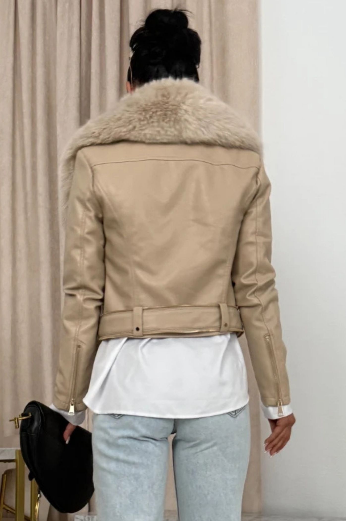 Αναδείξτε το στυλ σας με αυτό το εντυπωσιακό γυναικείο μπουφάν! Κατασκευασμένο από υψηλής ποιότητας δερματίνη, προσφέρει την αίσθηση του δέρματος και την ανθεκτικότητα που χρειάζεστε. Το μπουφάν ξεχωρίζει χάρη στον πλούσιο αποσπώμενο γούνινο γιακά σε φυσικό χρώμα, ο οποίος προσδίδει ζεστασιά και μια πινελιά πολυτέλειας στο biker/rock ύφος. Διαθέτει μεταλλικά φερμουάρ και κομψή δερμάτινη ζώνη στη μέση με μεγάλη αγκράφα, που τονίζει τη σιλουέτα και δίνει μοναδικό χαρακτήρα.