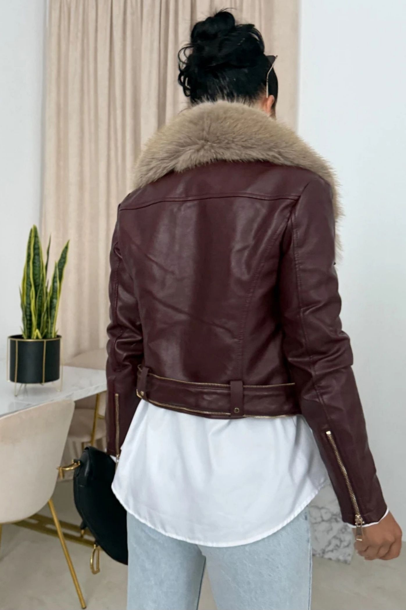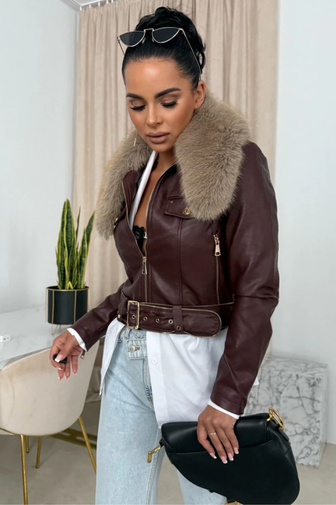 Αναδείξτε το στυλ σας με αυτό το εντυπωσιακό γυναικείο μπουφάν! Κατασκευασμένο από υψηλής ποιότητας δερματίνη, προσφέρει την αίσθηση του δέρματος και την ανθεκτικότητα που χρειάζεστε. Το μπουφάν ξεχωρίζει χάρη στον πλούσιο αποσπώμενο γούνινο γιακά σε φυσικό χρώμα, ο οποίος προσδίδει ζεστασιά και μια πινελιά πολυτέλειας στο biker/rock ύφος. Διαθέτει μεταλλικά φερμουάρ και κομψή δερμάτινη ζώνη στη μέση με μεγάλη αγκράφα, που τονίζει τη σιλουέτα και δίνει μοναδικό χαρακτήρα.