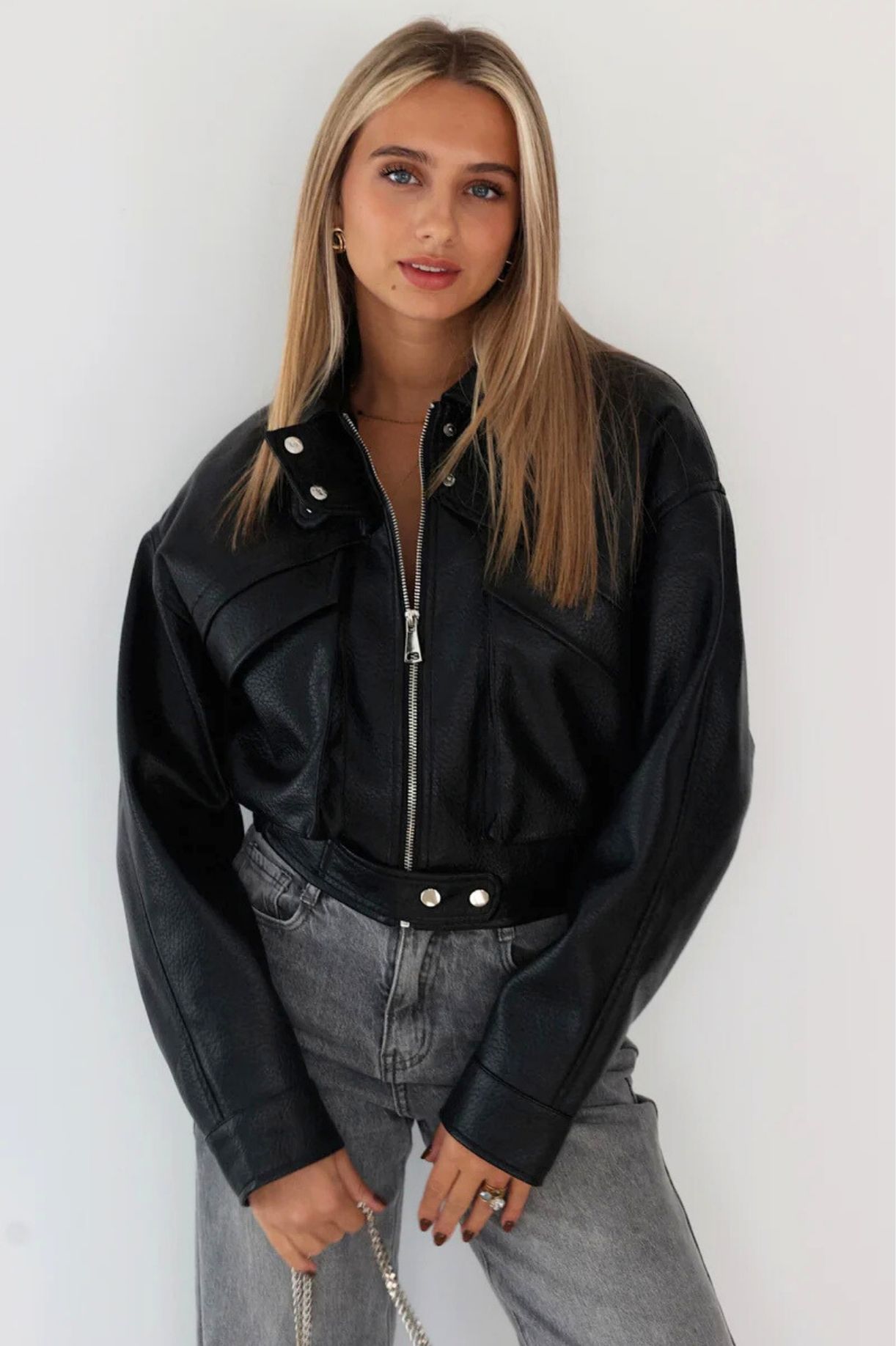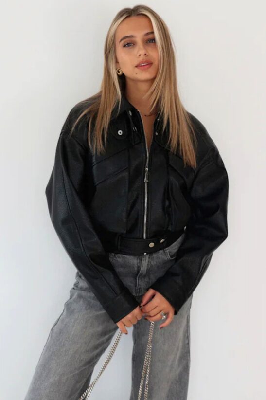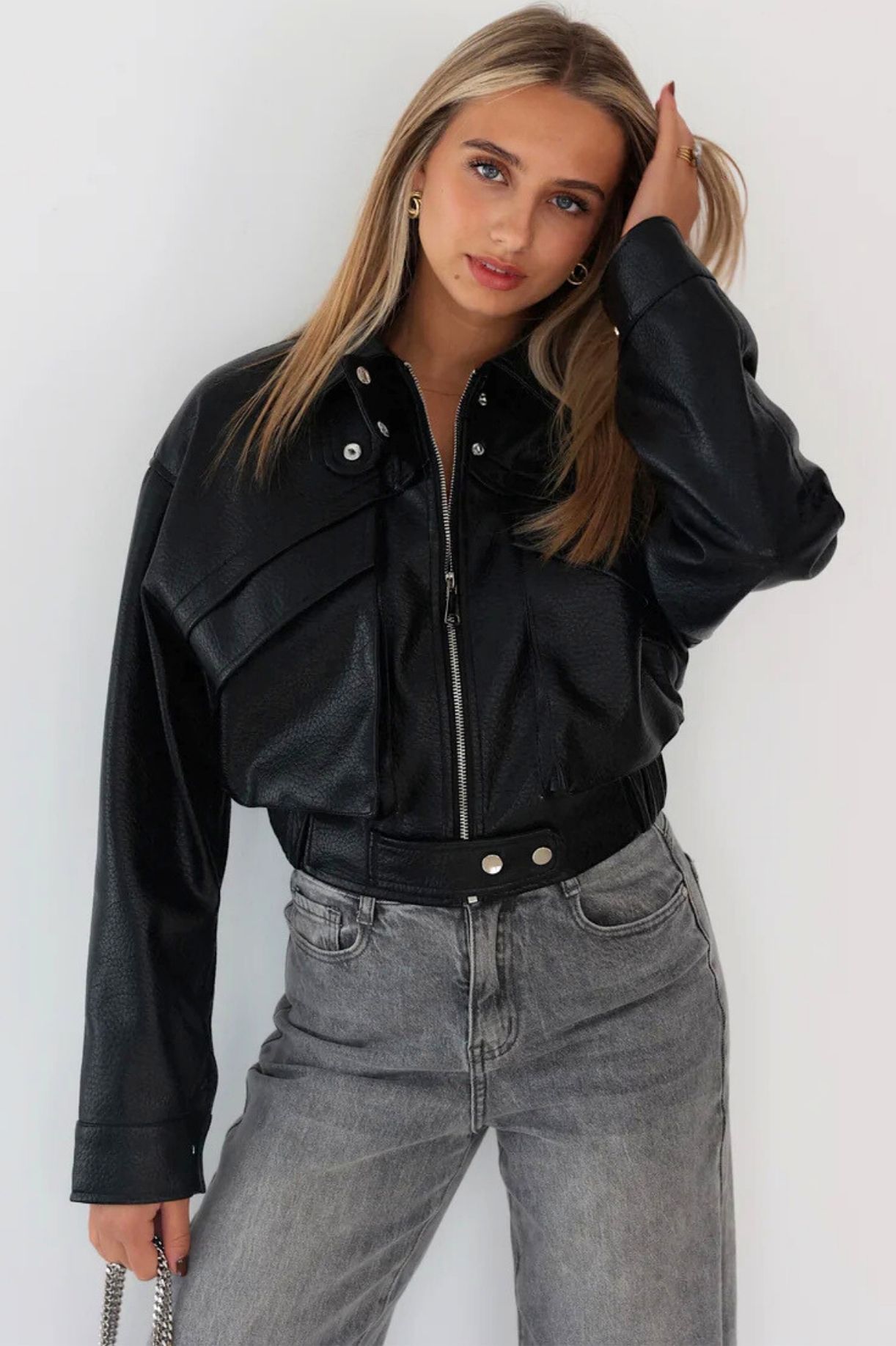 Είναι το ιδανικό πανωφόρι για να αναβαθμίσετε κάθε casual ή streetwear look με έναν αέρα cool κομψότητας. Το jacket είναι φτιαγμένο από μαλακή δερματίνη και διαθέτει boxy/άνετη γραμμή που το καθιστά ιδανικό για layering. Ξεχωρίζει χάρη στις μεγάλες τσέπες στο στήθος και τον διακριτικό γιακά. Κλείνει με φερμουάρ και διαθέτει λεπτομέρειες με μεταλλικά κουμπιά που ενισχύουν το biker/bomber style. Το κοντό μήκος του είναι ιδανικό για να συνδυαστεί με ψηλόμεσα παντελόνια, φούστες ή φορέματα, αναδεικνύοντας τη μέση.