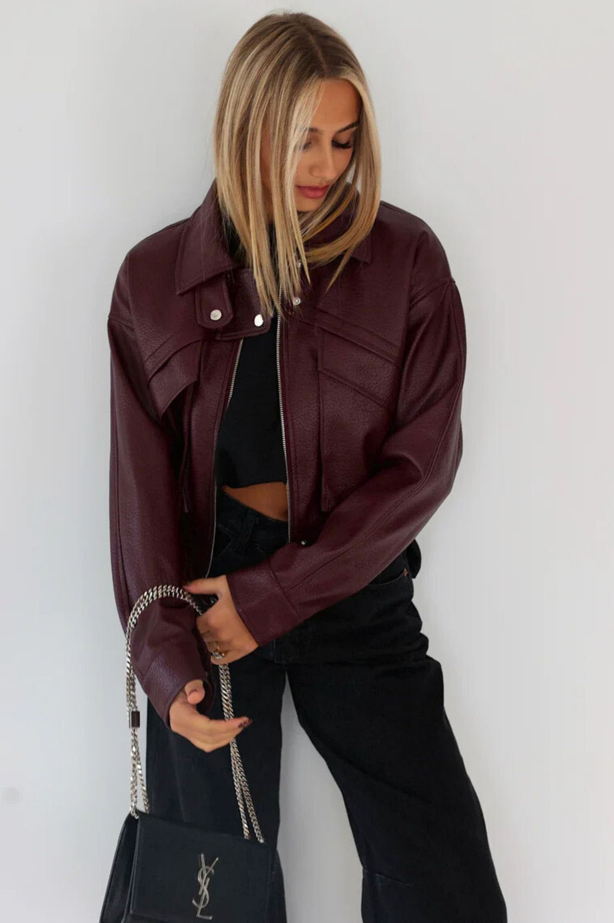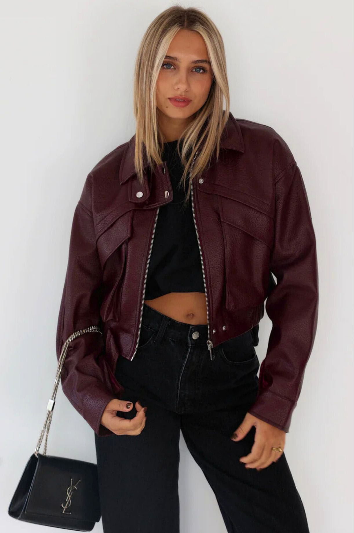 Είναι το ιδανικό πανωφόρι για να αναβαθμίσετε κάθε casual ή streetwear look με έναν αέρα cool κομψότητας. Το jacket είναι φτιαγμένο από μαλακή δερματίνη και διαθέτει boxy/άνετη γραμμή που το καθιστά ιδανικό για layering. Ξεχωρίζει χάρη στις μεγάλες τσέπες στο στήθος και τον διακριτικό γιακά. Κλείνει με φερμουάρ και διαθέτει λεπτομέρειες με μεταλλικά κουμπιά που ενισχύουν το biker/bomber style. Το κοντό μήκος του είναι ιδανικό για να συνδυαστεί με ψηλόμεσα παντελόνια, φούστες ή φορέματα, αναδεικνύοντας τη μέση.