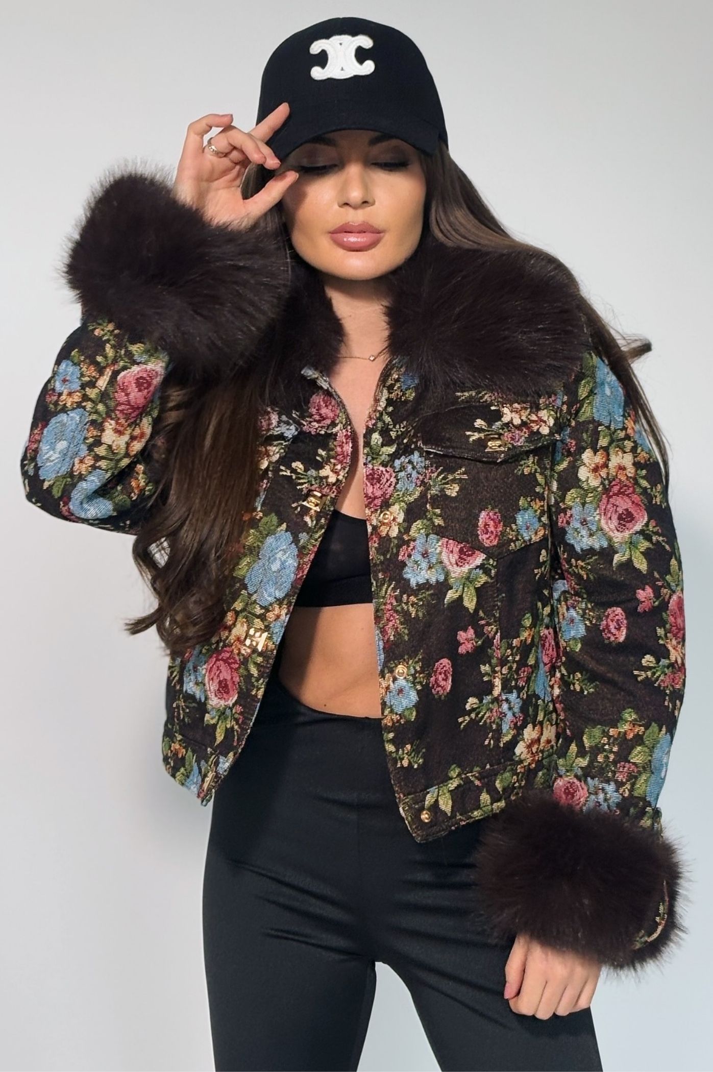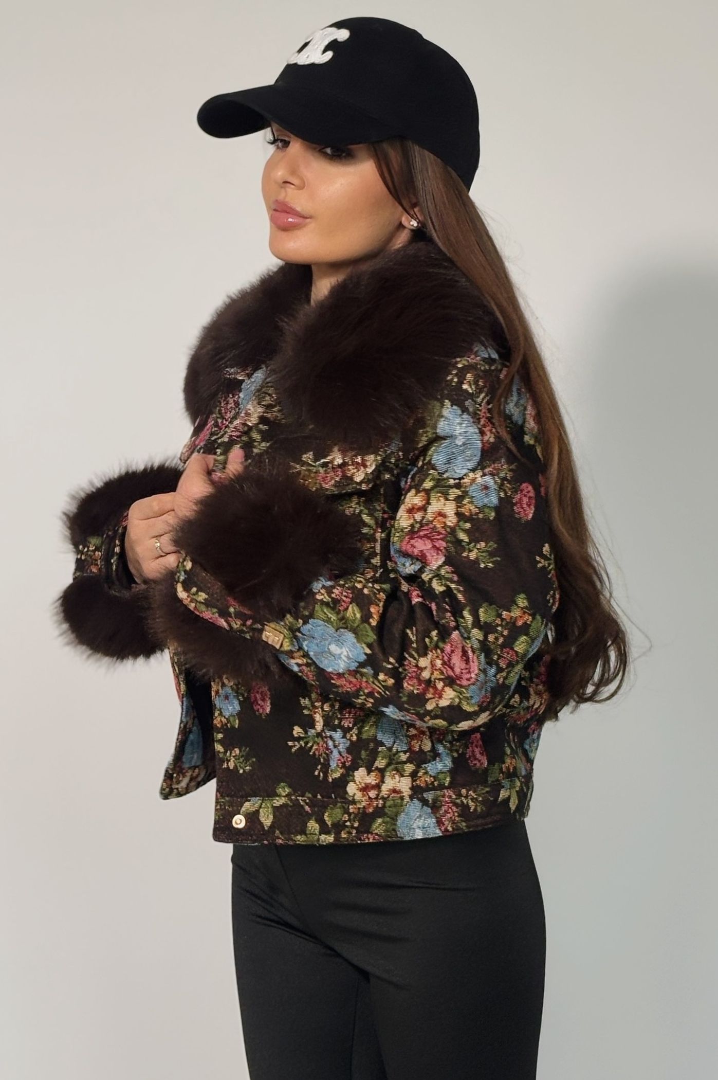 Αναδείξτε το χειμωνιάτικο στυλ σας με αυτό το εντυπωσιακό τζάκετ-μπουφάν. Αυτό το κομμάτι είναι ένας συνδυασμός πολυτέλειας και vintage αισθητικής, ιδανικό για να ξεχωρίσετε. Το τζάκετ διαθέτει πλούσιο φλοράλ κέντημα, με τα χρώματα να αναδεικνύονται υπέροχα χάρη στην ανάγλυφη υφή του υφάσματος. Η ιδιαίτερη πινελιά είναι η πλούσια, συνθετική γούνα που κοσμεί τον γιακά και τις φαρδιές μανσέτες, προσδίδοντας ζεστασιά και έναν glam τόνο. Το στυλ είναι κοντό, τονίζοντας τη μέση.