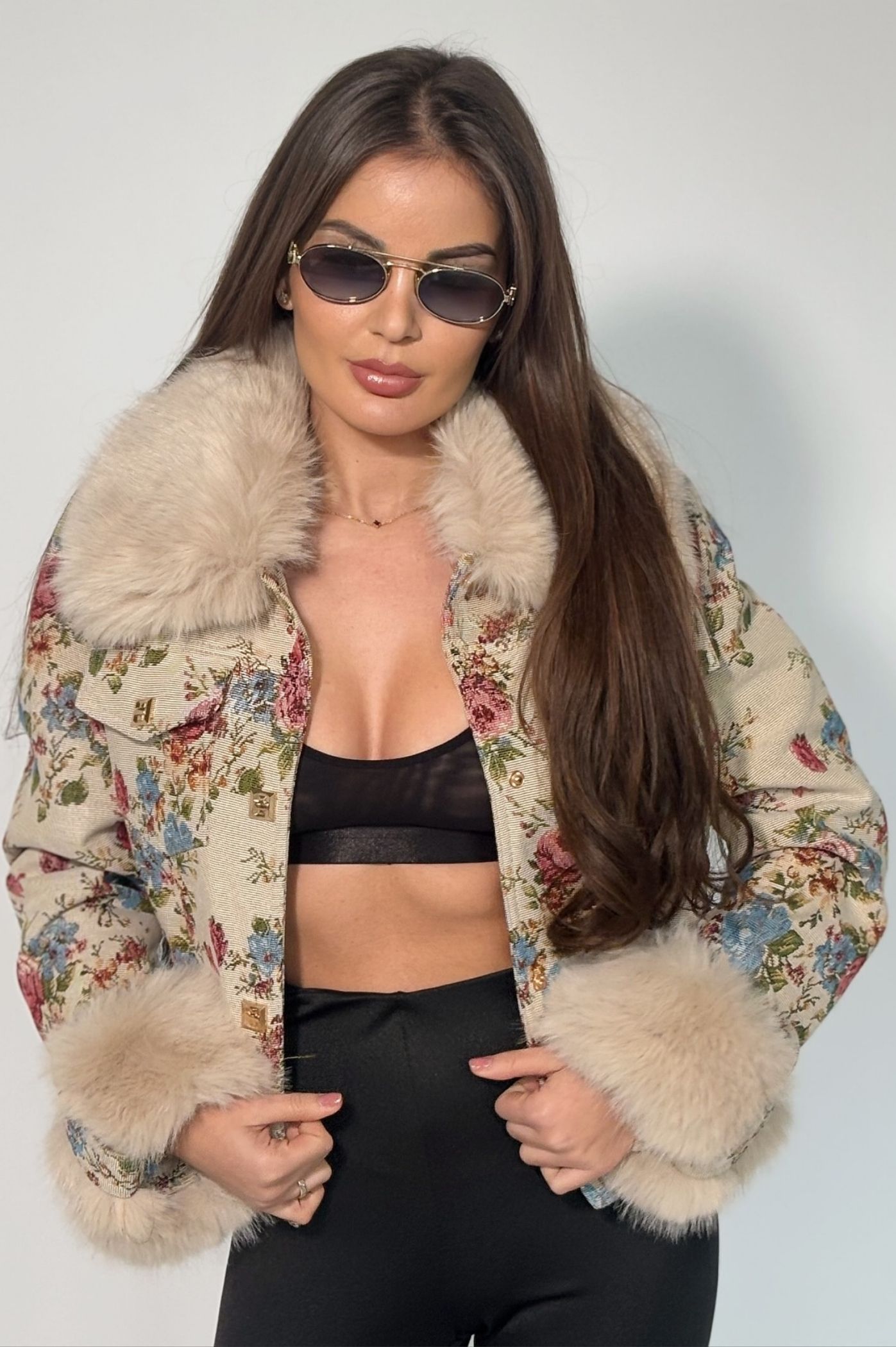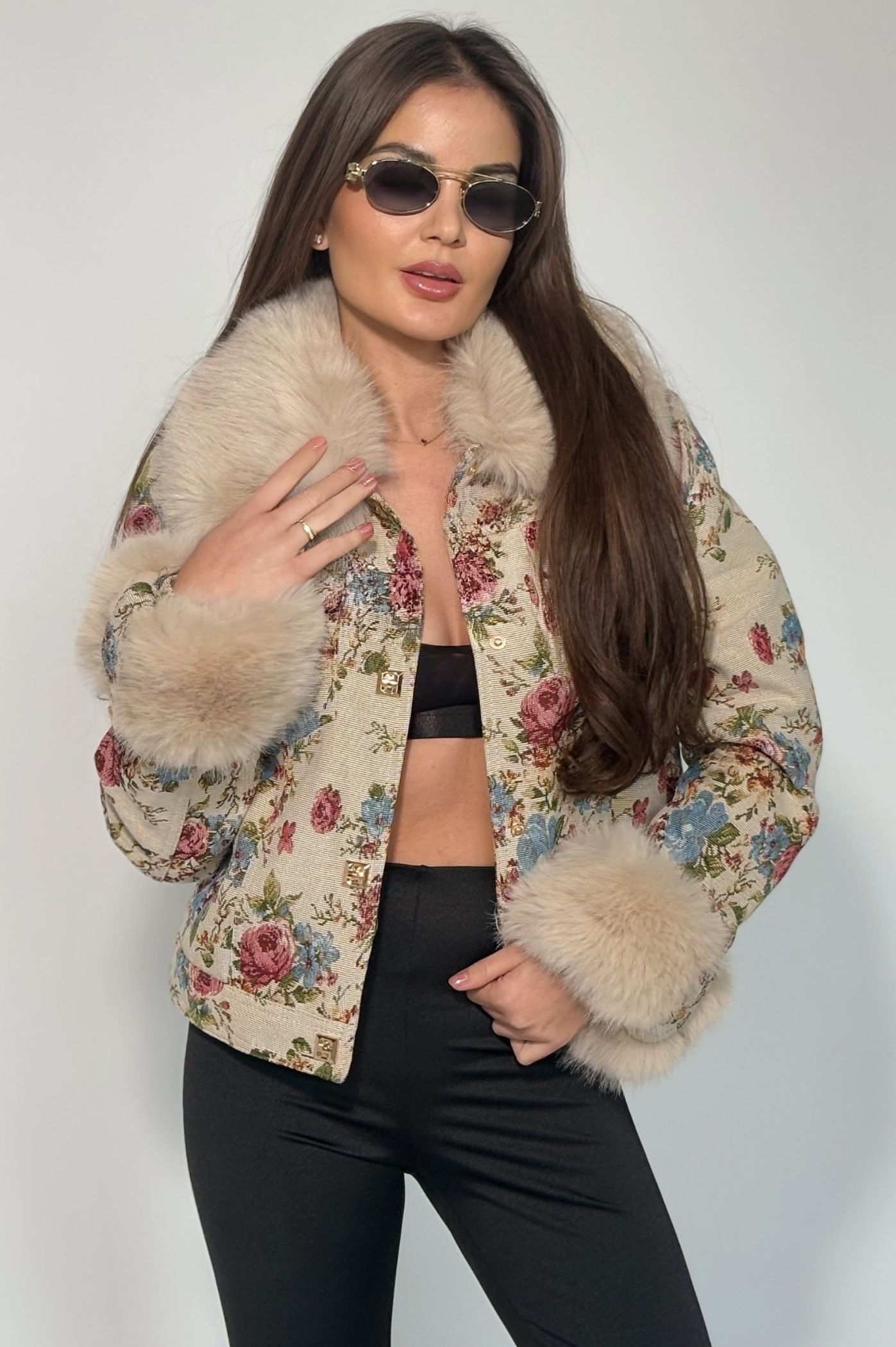 Αναδείξτε το χειμωνιάτικο στυλ σας με αυτό το εντυπωσιακό τζάκετ-μπουφάν. Αυτό το κομμάτι είναι ένας συνδυασμός πολυτέλειας και vintage αισθητικής, ιδανικό για να ξεχωρίσετε. Το τζάκετ διαθέτει πλούσιο φλοράλ κέντημα, με τα χρώματα να αναδεικνύονται υπέροχα χάρη στην ανάγλυφη υφή του υφάσματος. Η ιδιαίτερη πινελιά είναι η πλούσια, συνθετική γούνα που κοσμεί τον γιακά και τις φαρδιές μανσέτες, προσδίδοντας ζεστασιά και έναν glam τόνο. Το στυλ είναι κοντό, τονίζοντας τη μέση.