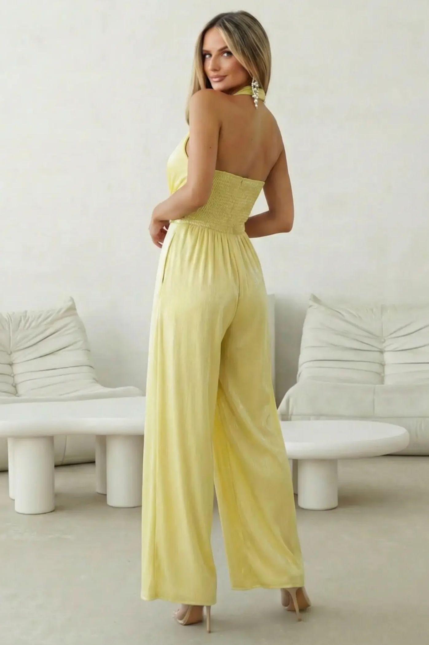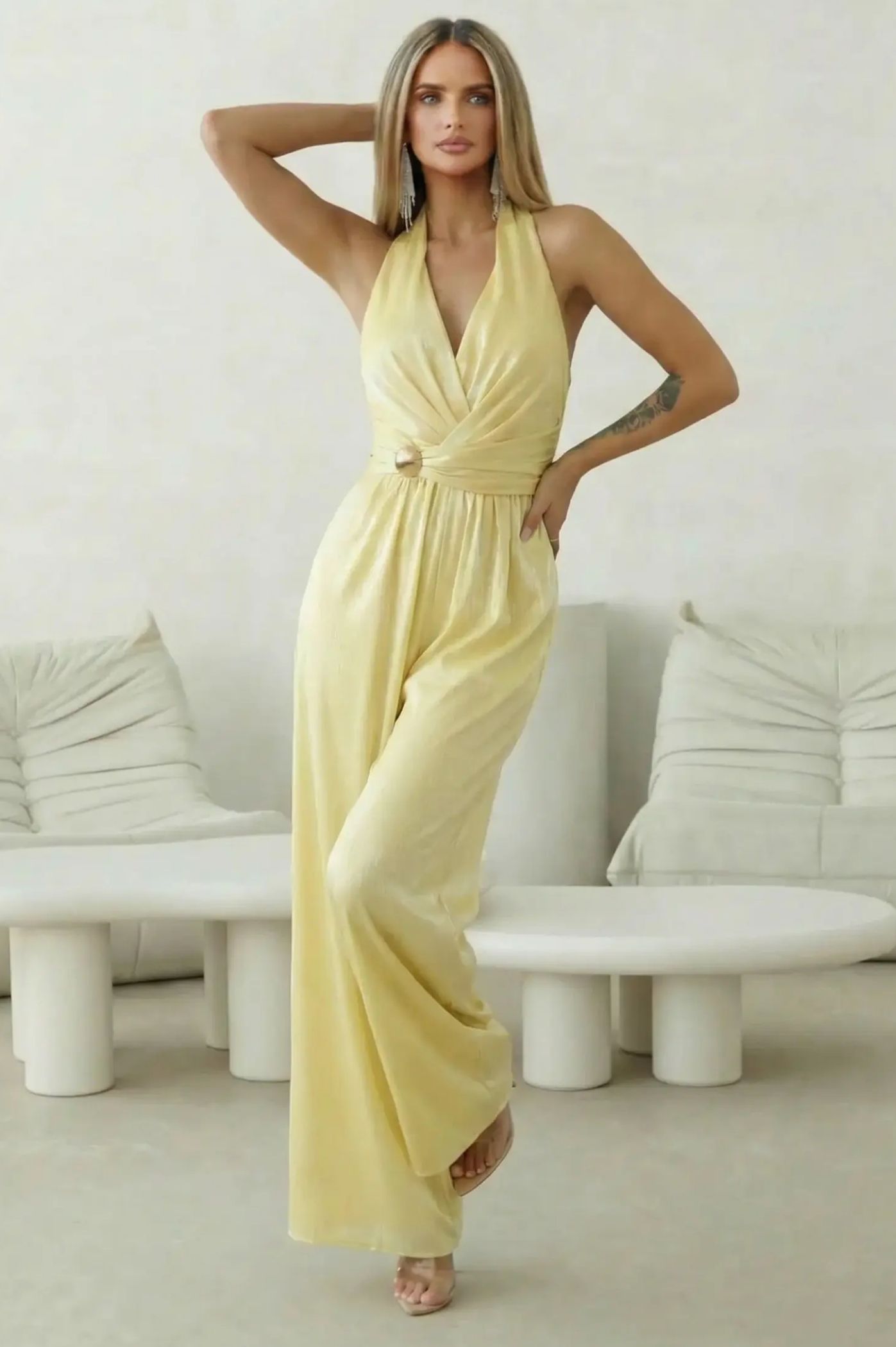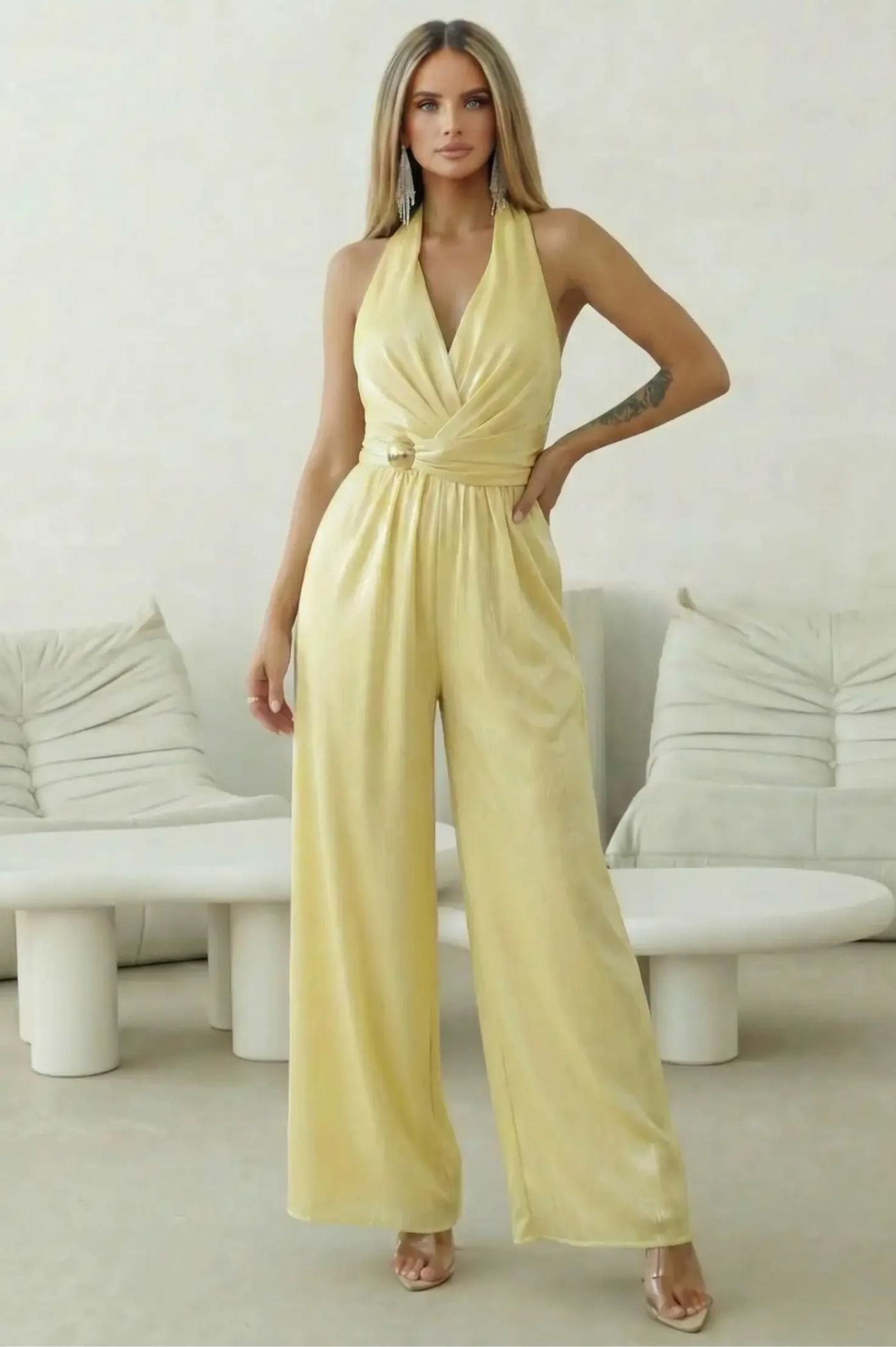 Κάντε μια statement εμφάνιση με αυτή την εντυπωσιακή ολόσωμη φόρμα που αποπνέει πολυτέλεια και δυναμισμό. Σχεδιασμένη για να κολακεύει τη γυναικεία σιλουέτα, αποτελεί την ιδανική εναλλακτική στο κλασικό βραδινό φόρεμα για κάθε επίσημη περίσταση. Το ντεκολτέ σε σχήμα V με το ιδιαίτερο δέσιμο αγκαλιάζει το στήθος, προσφέροντας θηλυκότητα και στυλ. Η χρυσή διακοσμητική αγκράφα στη μέση λειτουργεί ως κόσμημα, τονίζοντας το πιο στενό σημείο του σώματος. Ο σχεδιασμός που δένει στον λαιμό αφήνει την πλάτη ανοιχτή, χαρίζοντας ένα αισθησιακό και ταυτόχρονα chic αποτέλεσμα. Η παντελόνα σε φαρδιά γραμμή επιμηκύνει τα πόδια και προσφέρει άνεση και αέρινη κίνηση.