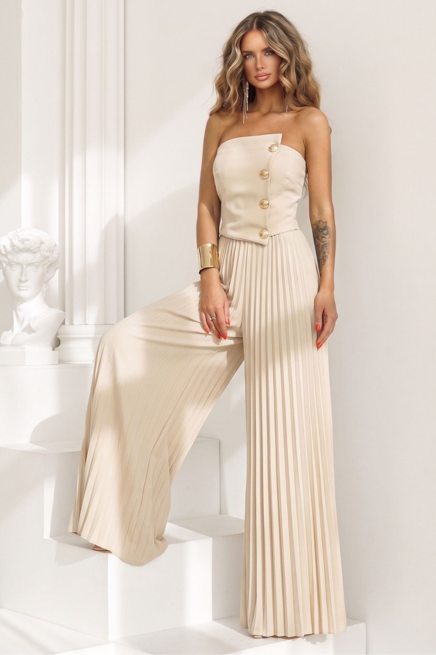 Κλέψτε την παράσταση με αυτό το απόλυτο fashion statement! Αυτή η ολόσωμη φόρμα (jumpsuit) συνδυάζει την κομψότητα του strapless σχεδιασμού με την αέρινη κίνηση του πλισέ υφάσματος, προσφέροντας ένα αποτέλεσμα που εκπέμπει αυτοπεποίθηση και δυναμισμό. Ιδανική για να ξεχωρίσετε σε κάθε σας εμφάνιση, από κοινωνικές εκδηλώσεις μέχρι βραδινά πάρτι. Το μπούστο αναδεικνύει τους ώμους και το λαιμό με κομψότητα, ενώ οι λεπτομέρειες με τα διακοσμητικά κουμπιά προσθέτουν μια σοφιστικέ πινελιά. Το πλισέ τελείωμα στο παντελόνι προσφέρει υπέροχη κίνηση και αέρα, δημιουργώντας μια εντυπωσιακή και άνετη γραμμή που κολακεύει τη σιλουέτα. Η ολόσωμη φόρμα αποτελεί την πιο εύκολη και ταυτόχρονα chic λύση για να ντυθείτε εντυπωσιακά μέσα σε λίγα λεπτά.