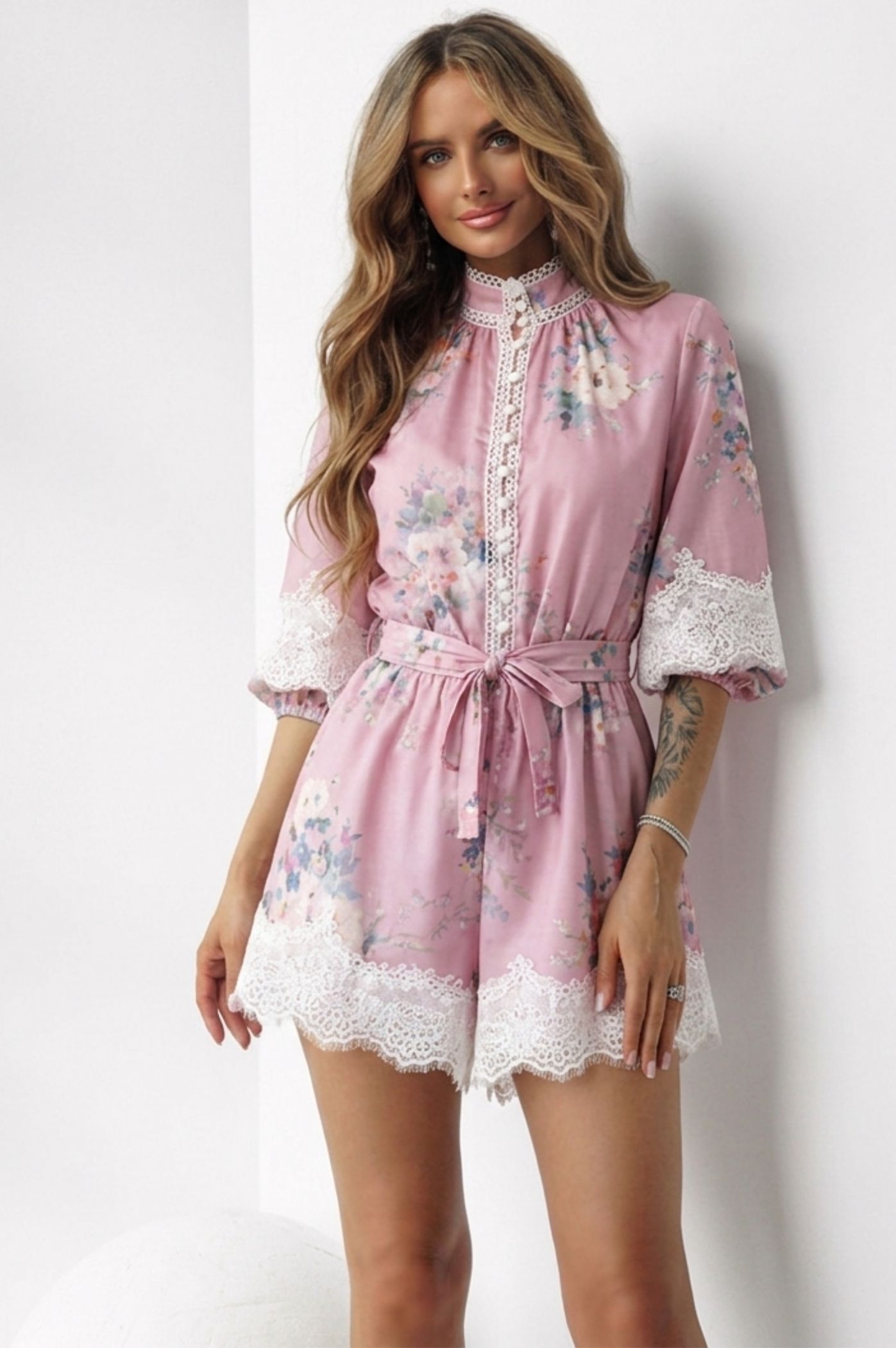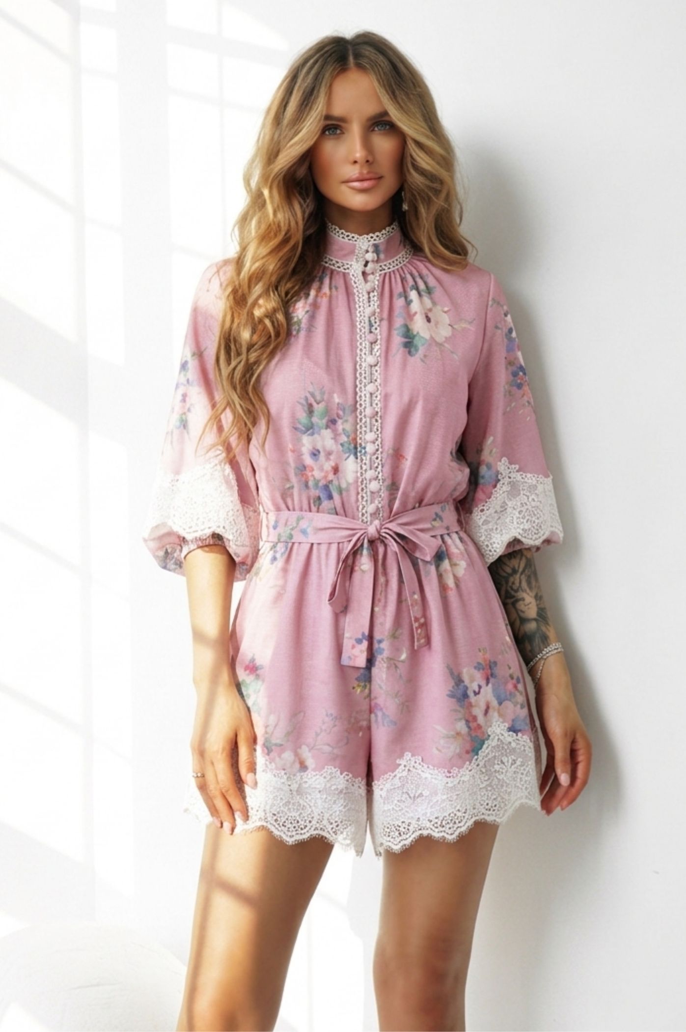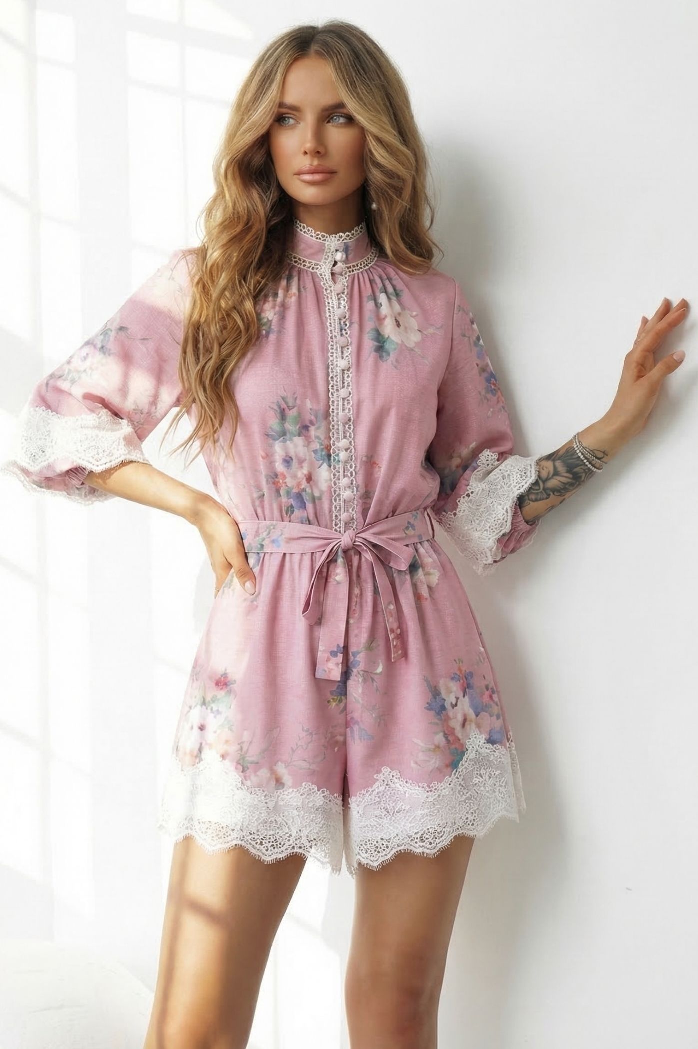 Αναδείξτε την καλοκαιρινή σας γκαρνταρόμπα με αυτό το ονειρικό σετ. Ένα κομμάτι που συνδυάζει την άνεση με την υψηλή αισθητική, ιδανικό για ρομαντικές βόλτες στο νησί, καλοκαιρινά events ή cocktail nights. Το ντελικάτο φλοράλ σχέδιο σε παστέλ τόνους προσδίδει μια αίσθηση φρεσκάδας και διαχρονικής κομψότητας. Η πλούσια λευκή δαντέλα στο τελείωμα των μανικιών και του σορτς δίνει μια boho-chic πινελιά και αναδεικνύει μοναδικά το look. Ο ιδιαίτερος γιακάς και η φάσα με τα δαντελένια κουμπιά στο στήθος προσθέτουν μια σοφιστικέ νότα που θυμίζει high-end σχεδιασμό. Διαθέτει ενσωματωμένη ζώνη που σφίγγει στη μέση για να δημιουργήσει μια τέλεια θηλυκή σιλουέτα.