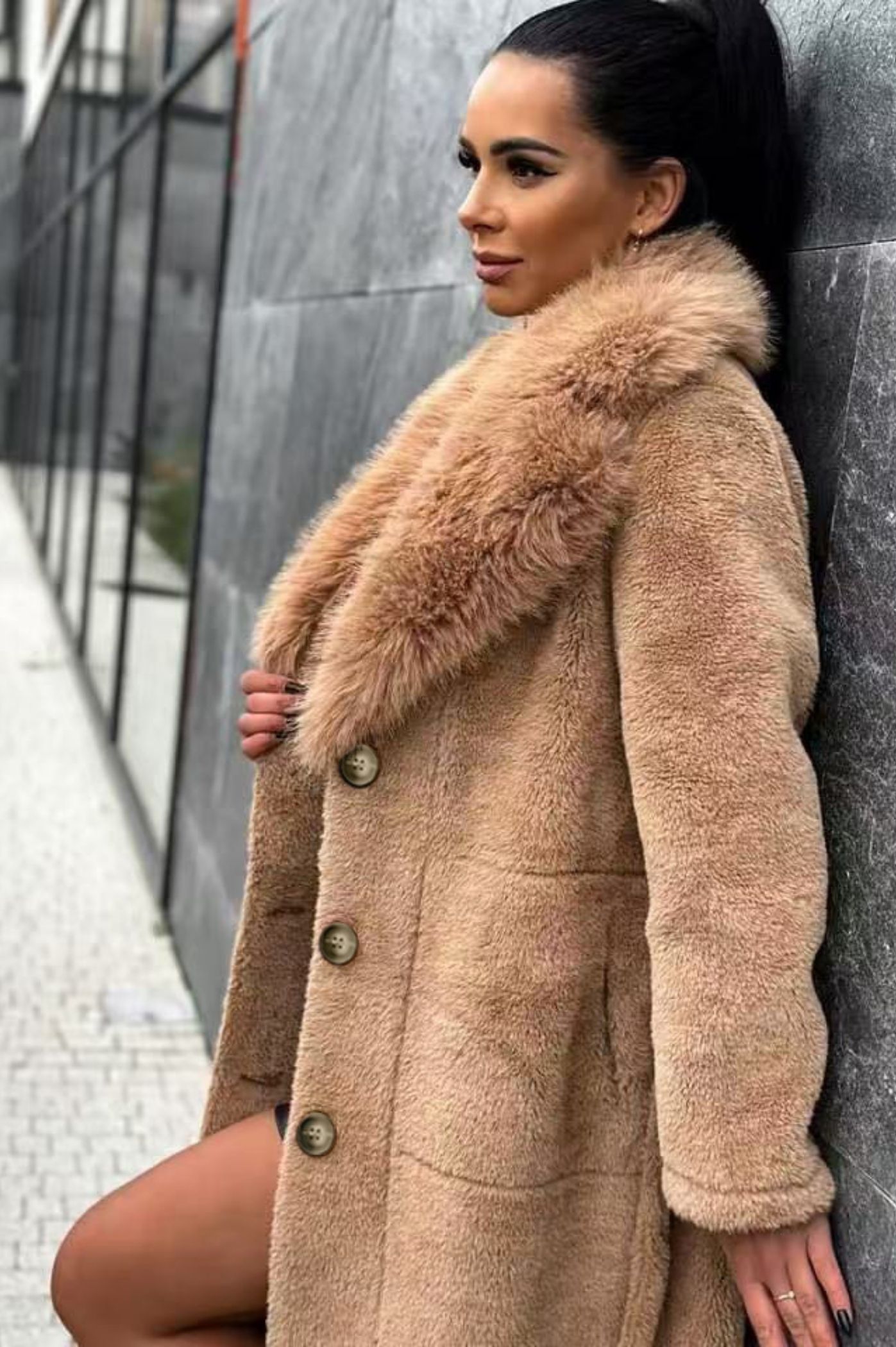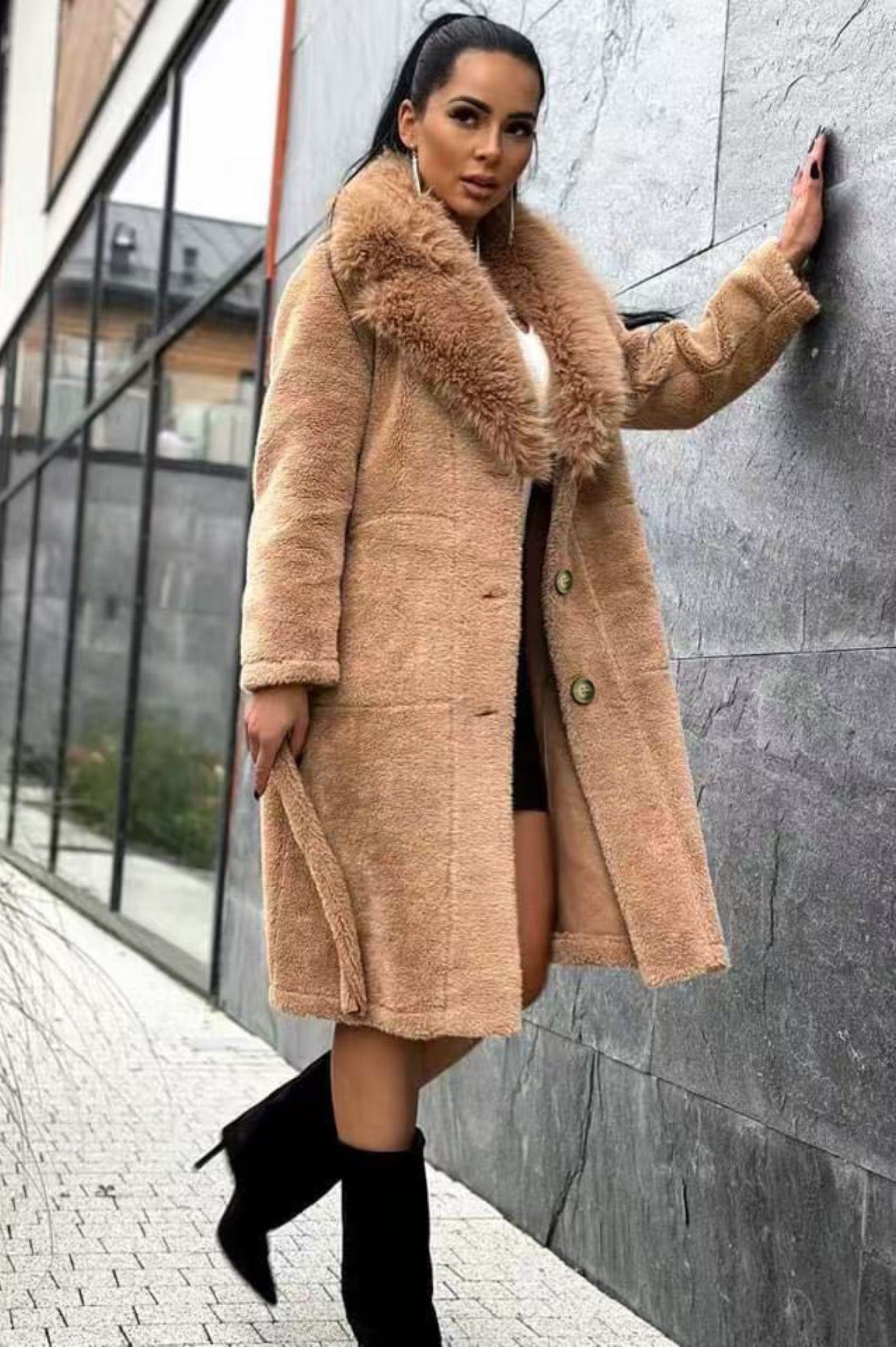 Αποκτήστε την απόλυτη αίσθηση πολυτέλειας και ζεστασιάς με αυτό το εντυπωσιακό γούνινο παλτό. Το παλτό έχει μήκος κάτω από το γόνατο, προσφέροντας κομψότητα και πλήρη κάλυψη για τις κρύες μέρες του χειμώνα. Διαθέτει έναν πλούσιο και ογκώδη γούνινο γιακά, ο οποίος προσδίδει δραματικό και glamorous στυλ. Η ζώνη από το ίδιο ύφασμα στη μέση τονίζει τη σιλουέτα, ενώ τα κουμπιά μπροστά εξασφαλίζουν τέλεια εφαρμογή. Η υφή του παλτού είναι απαλή και bouclé, χαρίζοντας μια αίσθηση ζεστασιάς και άνεσης. Ιδανικό για επίσημες εμφανίσεις, βραδινές εξόδους, αλλά και για να αναβαθμίσετε ένα απλό καθημερινό outfit.