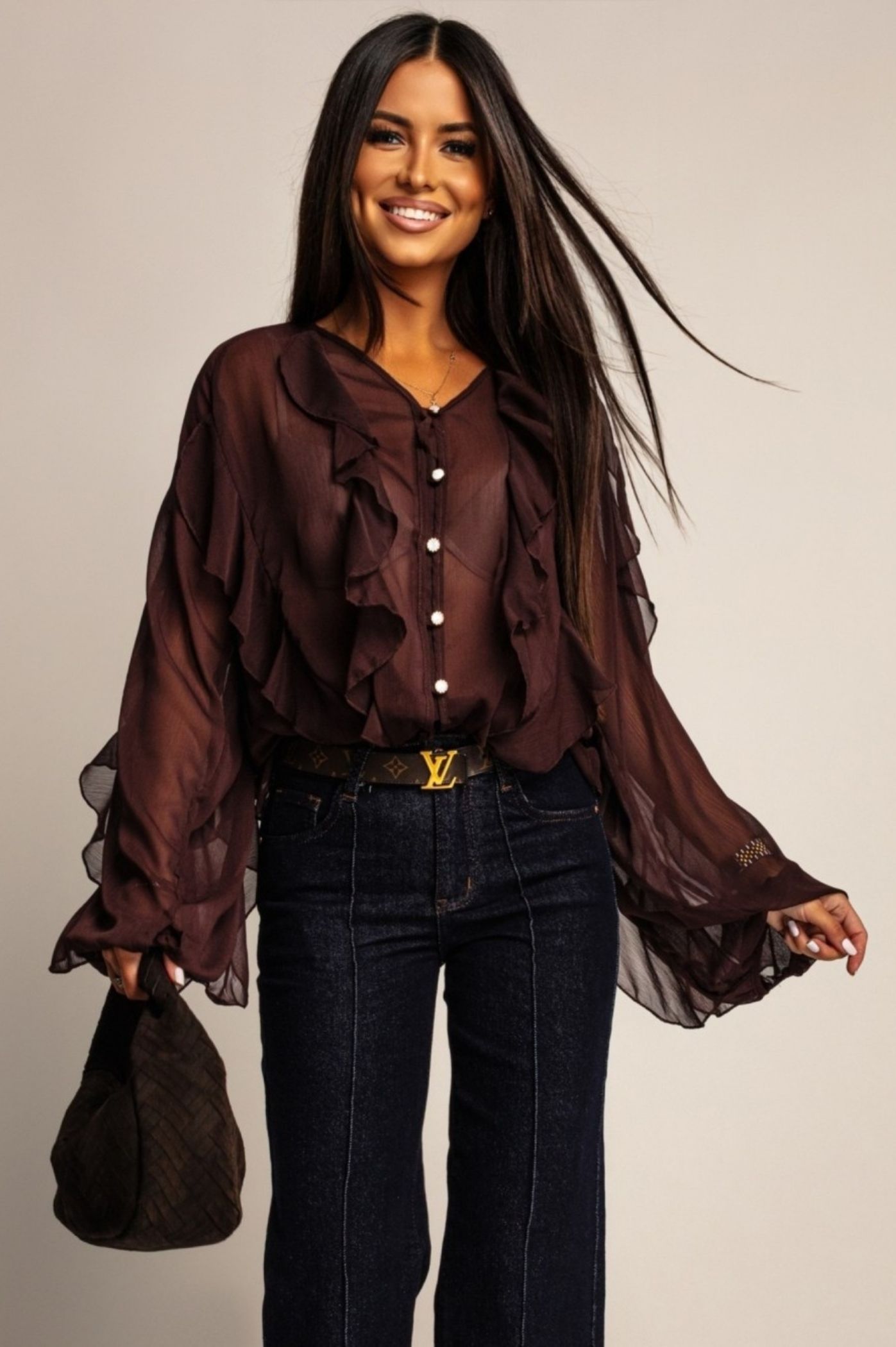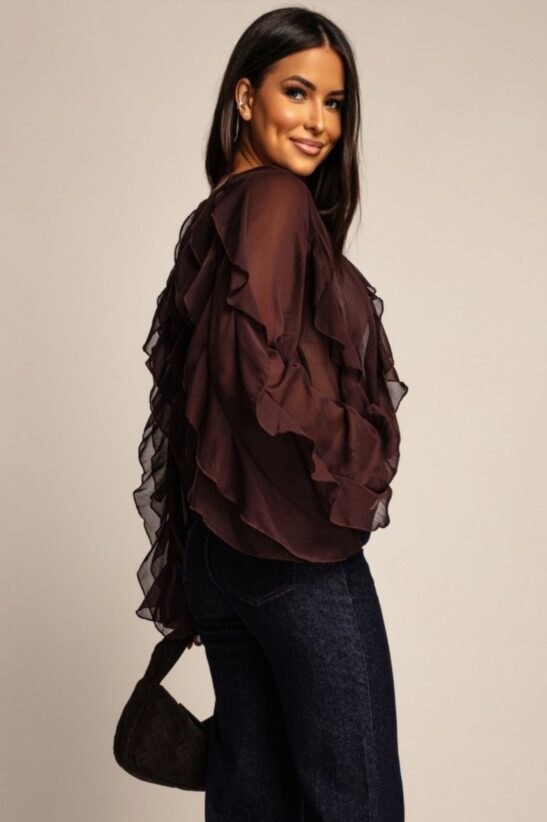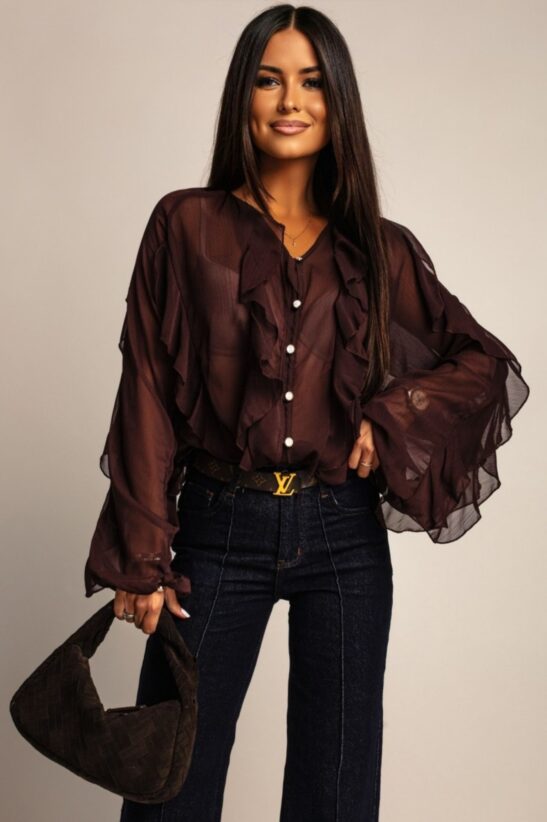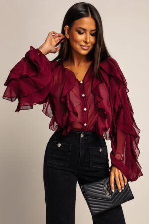 Αναδείξτε το στυλ σας με αυτό το εκθαμβωτικό πουκάμισο από αέρινο ύφασμα. Τα πλούσια, πολλαπλά βολάν που κοσμούν τη λαιμόκοψη και τα μακριά μανίκια, προσδίδουν όγκο και κίνηση. Η διακριτική διαφάνεια του υφάσματος δημιουργεί ένα σέξι, αλλά ταυτόχρονα κομψό αποτέλεσμα. Διαθέτει κουμπιά στο μπροστινό μέρος, τα οποία είναι διακοσμημένα με στρας, ενισχύοντας τη λάμψη και την πολυτέλεια του συνόλου. Μπορεί να φορεθεί μέσα από ψηλόμεσα παντελόνια ή φούστες και να ολοκληρωθεί το look με ένα clutch bag και χρυσά κοσμήματα. Ιδανικό για να ξεχωρίσετε σε κάθε βραδινή έξοδο ή επίσημη εκδήλωση.